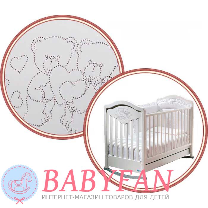 - классической формы кроватка декорирована аппликацией из кристаллов Swarovsky в виде серебристых сердечек и мишек;