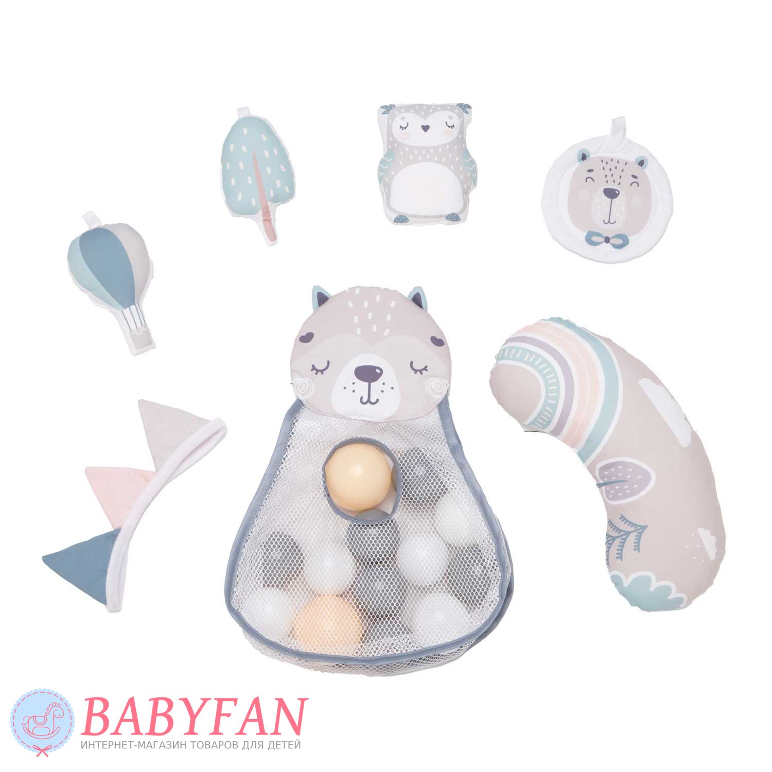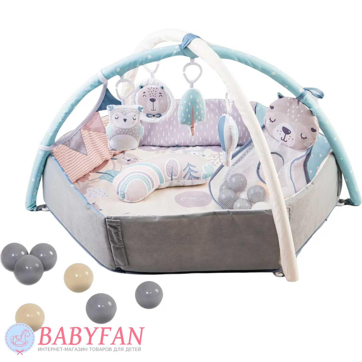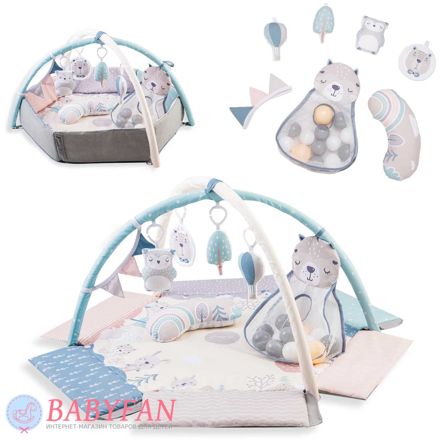 В комплекте предусмотрены дуги с подвесными игрушками, которые привлекают внимание ребенка и стимулируют его любознательность. Малыш может тянуться к игрушкам, рассматривать их и играть, развивая мелкую моторику и зрительное восприятие. Все элементы коврика изготовлены из безопасных материалов, которые подходят для ежедневного использования. Конструкция легко собирается и разбирается, а поверхность коврика можно быстро очистить при необходимости.
