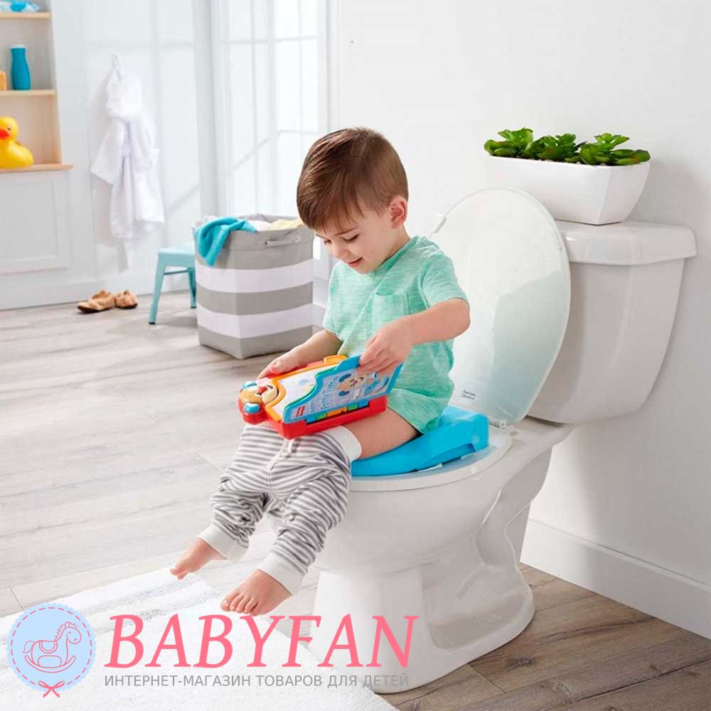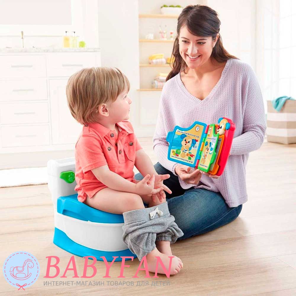 Горшок Fisher Price FPC42 Учись вместе с щенком (анг) – новинка от компании Fisher Price поможет вашему малышу без лишнего стресса обучиться соблюдению правил личной гигиены. Широкое посадочное место с низким сиденьем, высокой спинкой и ручками по бокам обезопасят малыша от падения. Яркий дизайн с забавными изображениями щенка и лягушки привлекут внимание малыша и научат его не бояться. Поощряющие мелодии и фразы сделают процесс проще. В конструкции горшка предусмотрена даже книжная полка. Накладка снимается и устанавливается на обычный унитаз.