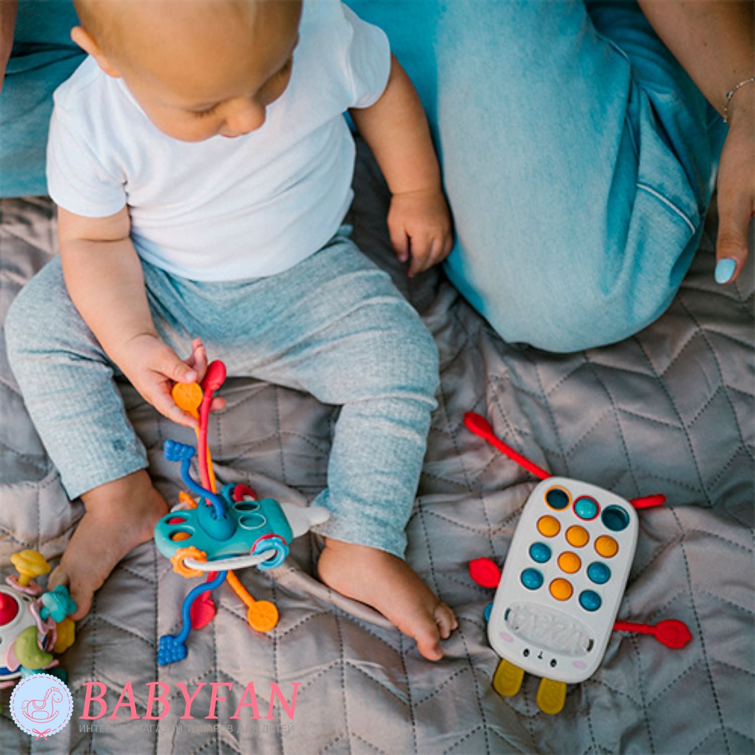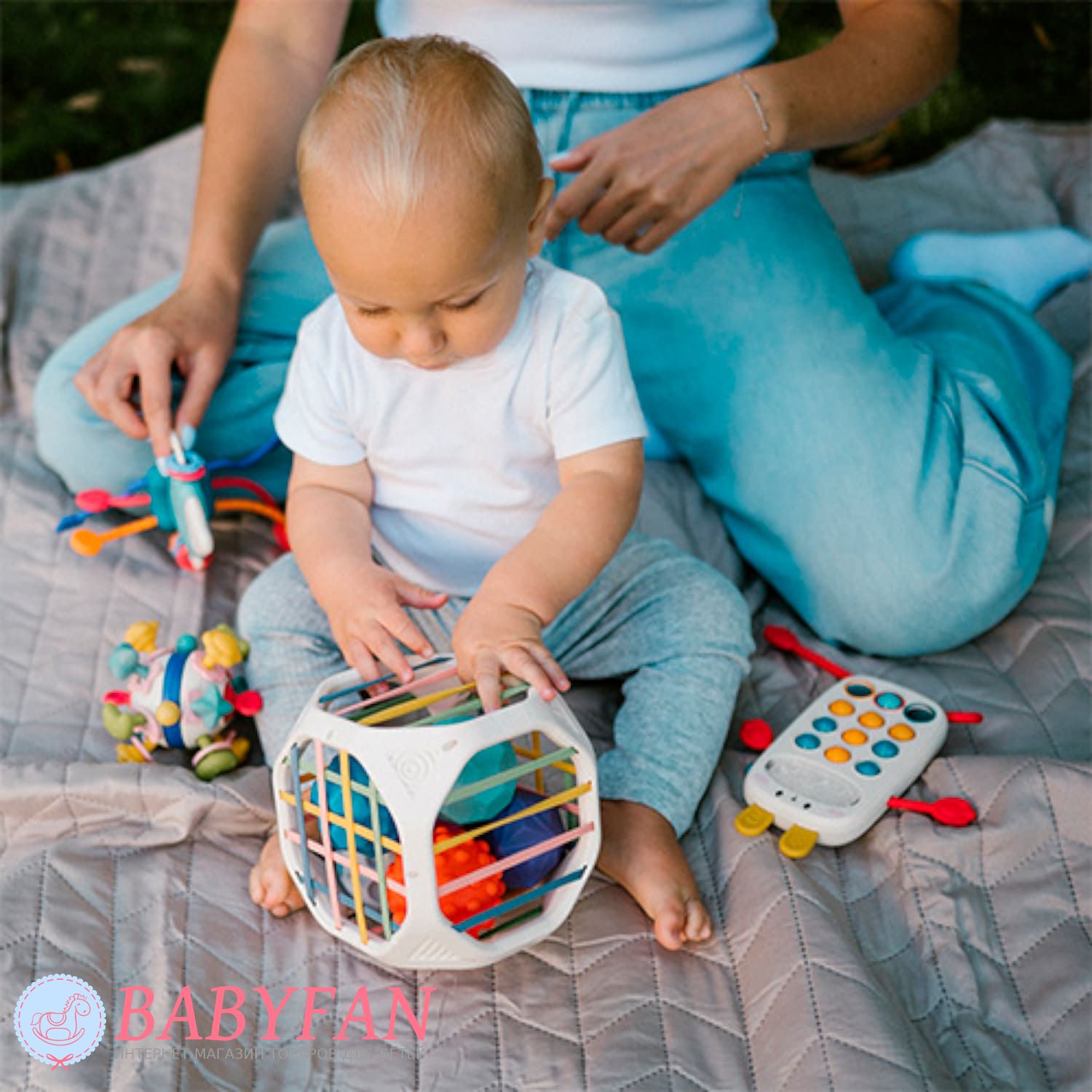 Игрушка выполнена из качественных материалов, безопасных для здоровья младенцев. Это позволяет родителям не беспокоиться о возможных аллергических реакциях или повреждениях. Продукт также способствует развитию сенсорных навы – яркие цвета и разнообразные текстуры стимулируют зрительное восприятие и тактильные ощущения.