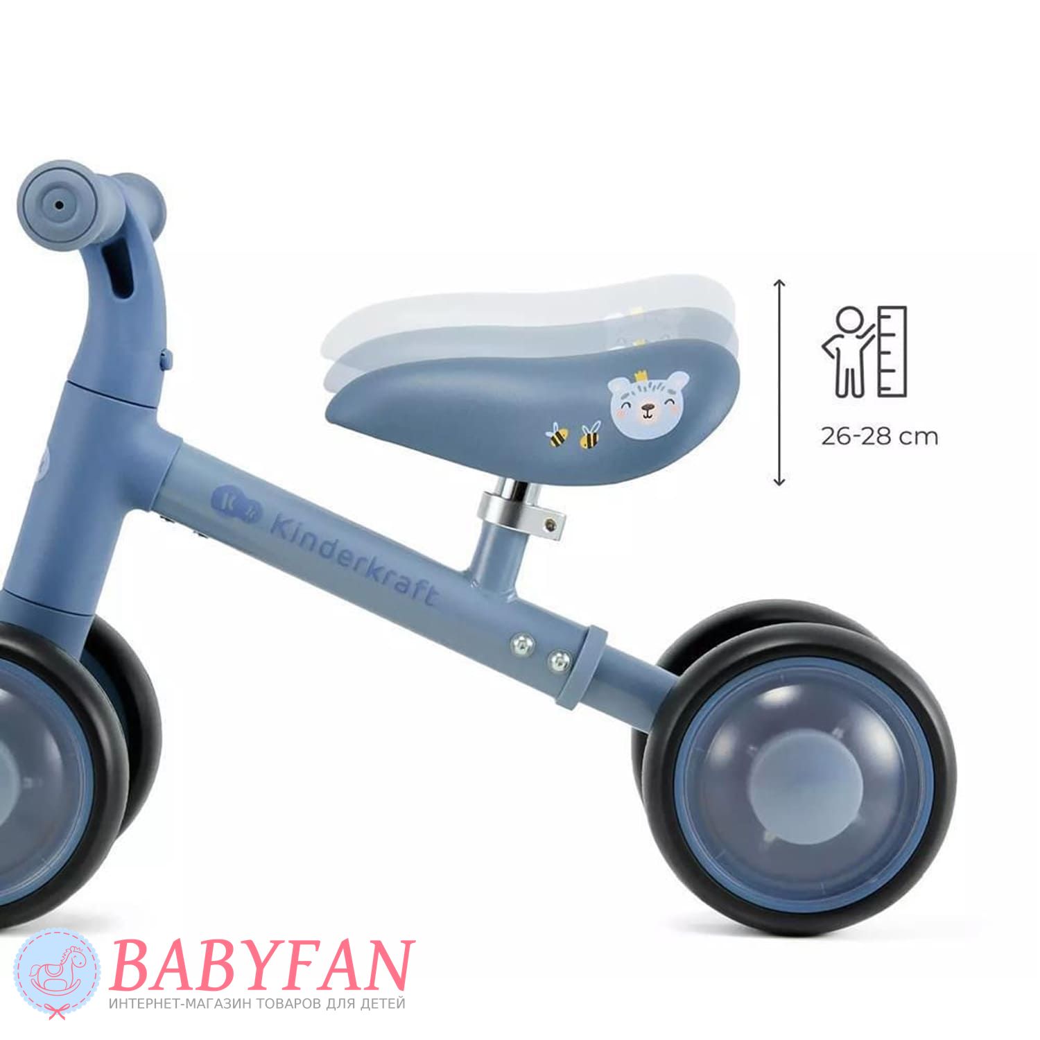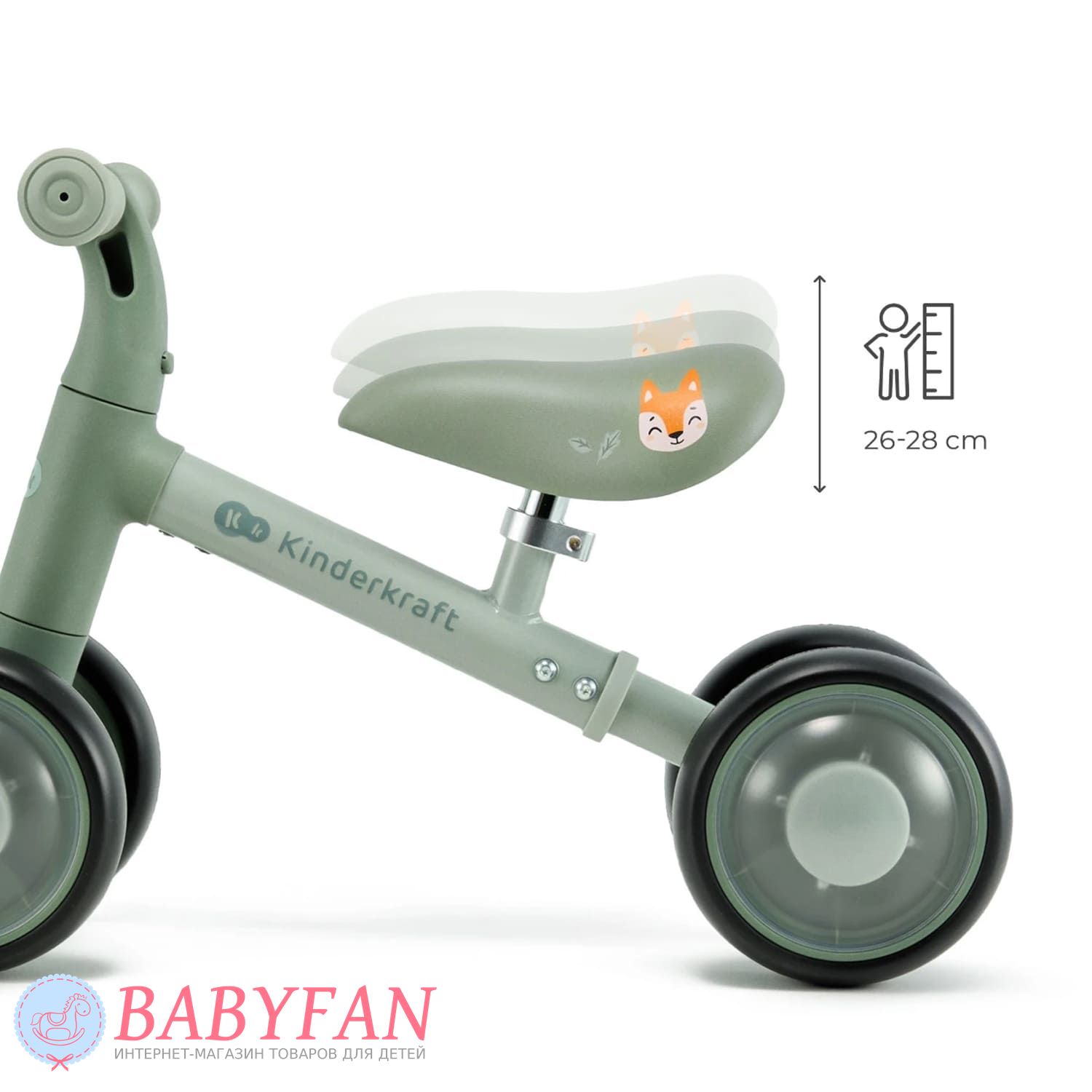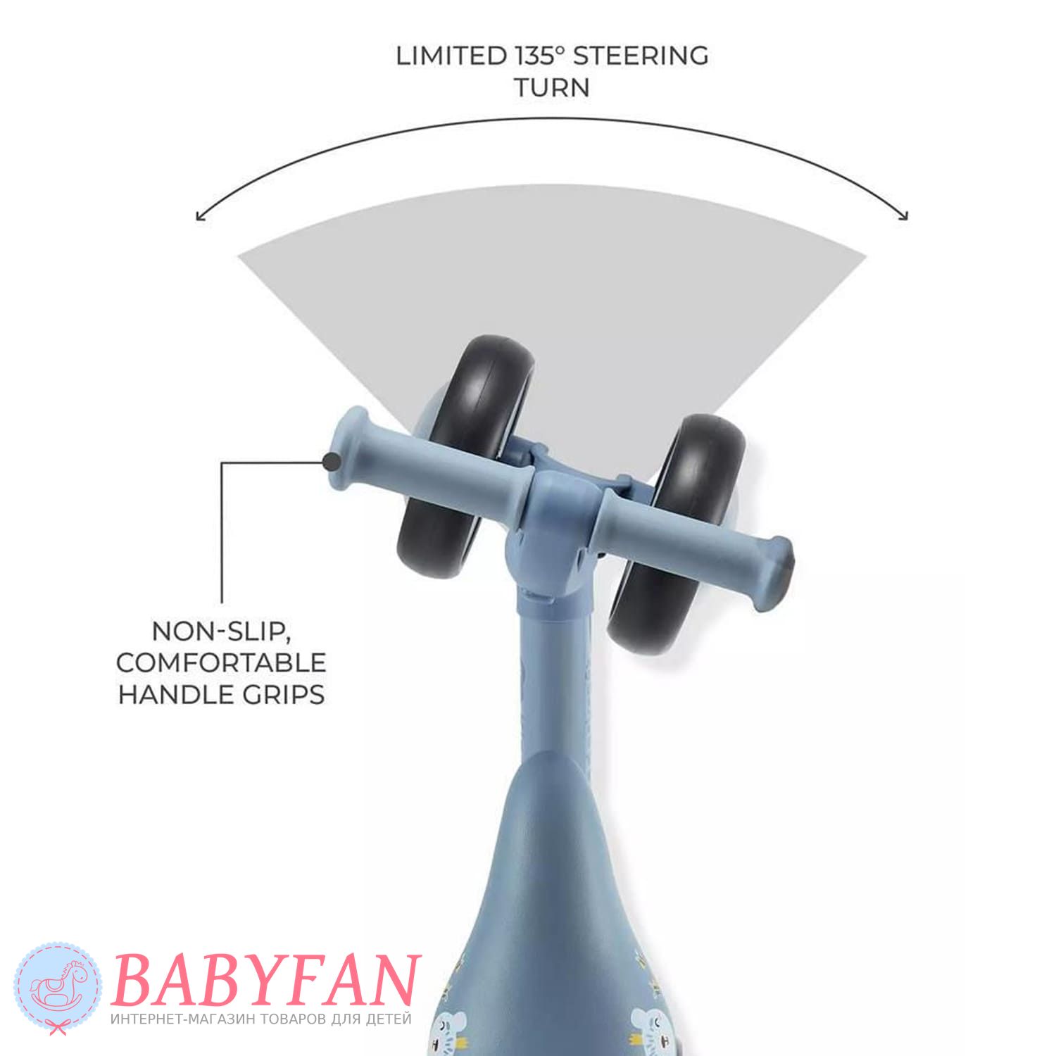 Kinderkraft Cutie – легкий и устойчивый трехколесный каталка-беговел для детей старше 1 года. Выдерживает вес до 25 кг. Изготовлен из прочных и долговечных материалов: металлическая рама, мягкое сиденье и колеса с литыми пластиковыми дисками. Рама покрыта износостойкой порошковой краской. Двухколесная передняя ось обеспечивает беговелу устойчивость к опрокидыванию – ребенку не нужно держать равновесие. Сиденье мягкое и удобное – эргономической формы. Руль оснащен нескользящими грипсами с боковой защитой рук. Руль управляет двумя передними колесами. Беговел приводится в движение отталкиванием ногами.