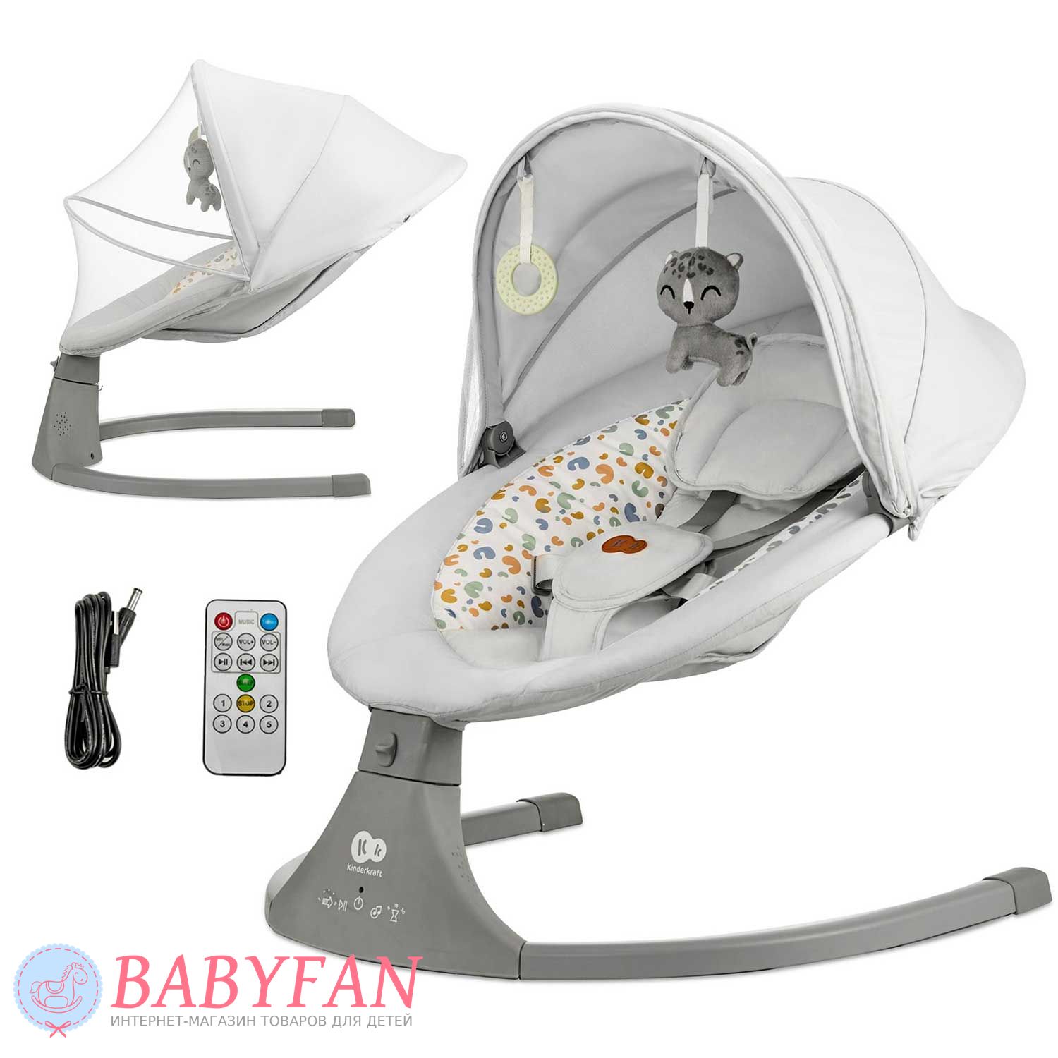 Функцию раскачивания Kinderkraft Lumi 2 можно заблокировать поворотным переключателем – кресло-качалка трансформируется в детский шезлонг. Сидень мягкое, обтянуто плотной тканью – без твердой основы. За безопасность ребенка отвечают 5-точечные ремни безопасности, регулирующиеся по высоте и длине. Для большего удобства предусмотрена мягкая подушка. На сиденье устанавливается дуга с 2 забавными мягкими игрушками. В Kinderkraft Lumi 2 регулируется скорость раскачивания, есть таймер, возможность включить или остановить музыку. Музыкальный проигрыватель на 12 мелодий. Имеется возможность проигрывать музыку со смартфона по Bluetooth.