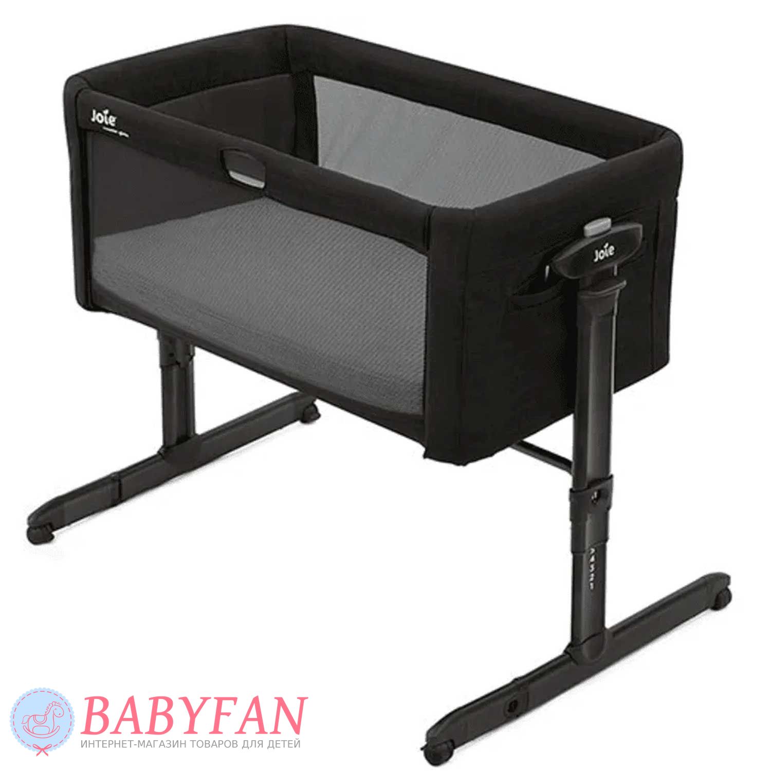 Приставная кроватка Joie Roomie Glide - имеет функции колыбели и приставной кровати. Ее легко передвигать по комнате, поскольку на ножках есть небольшие прорезиненные колесики с фиксаторами. Сетчатые боковины обеспечивают прекрасную циркуляцию воздуха и хорошую видимость. Для легкого доступа к ребенку одна боковина опускается. Высота ножек регулируется. Чтобы маме не приходилось ночью подниматься, когда кроха заплачет, манеж можно придвинуть вплотную к родительской кровати и закрепить страховочным ремнем.