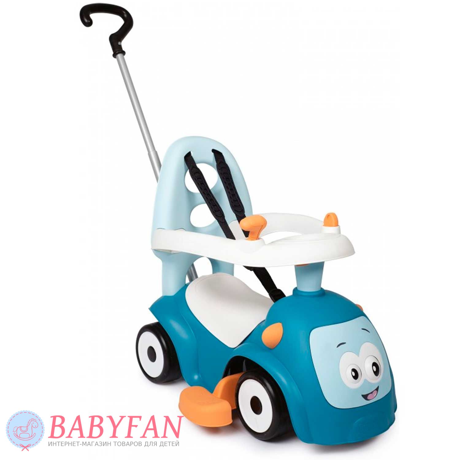 Машинка-каталка Maestro 2 Smoby – предназначена для детей с 6-и месяцев. Яркая, красочная машинка-каталка трансформируется и "растет" в соответствии с потребностями роста Вашего малыша: самые маленькие могут сидеть и играть, а также кататься на улице и дома, благодаря удобной ручке для взрослых, малыши постарше – учиться ходить, опираясь на спинку каталки, а более взрослые детки – самостоятельно передвигаться, сидя на машинке. Руль оборудовано 3-мя различными сигналами и подвижными прокручивающимися глазами, изменяющими "эмоции". Удобный багажник под сиденьем позволит взять с собой на прогулку любимую игрушку.