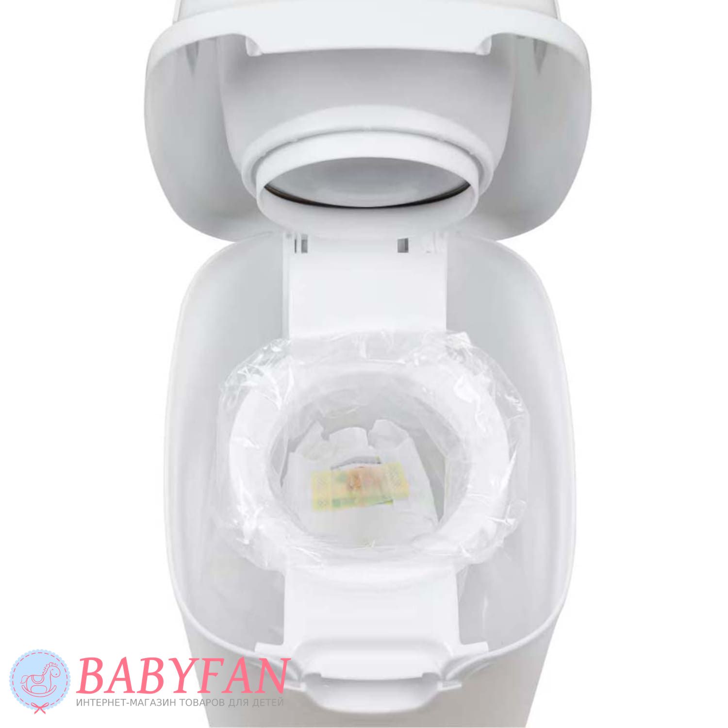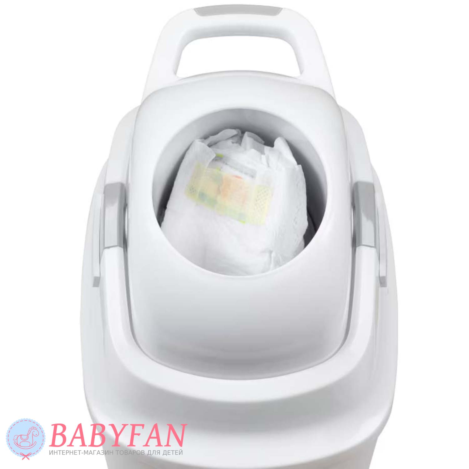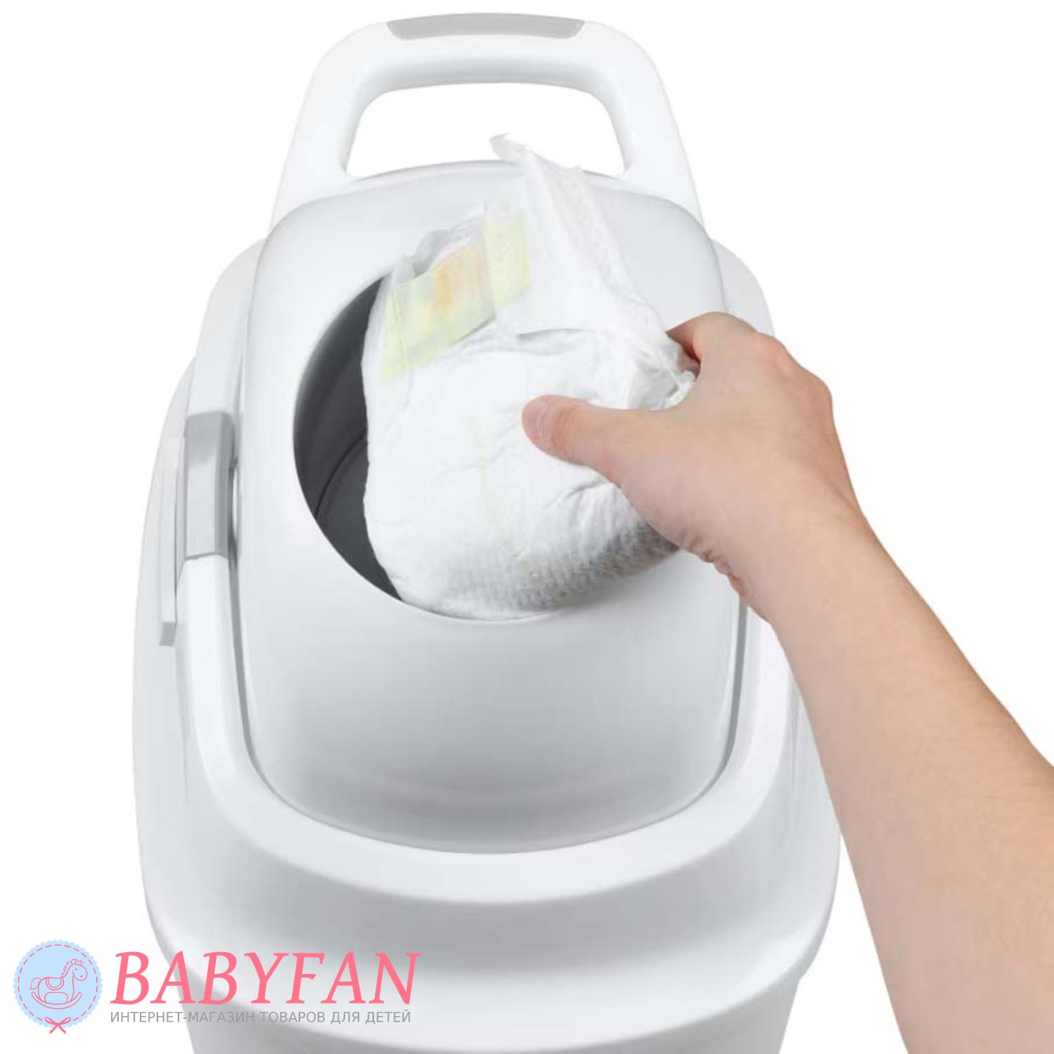 - вмещает до 30 подгузников: в зависимости от размера подгузников, контейнер может вместить от 20 до 30 подгузников;