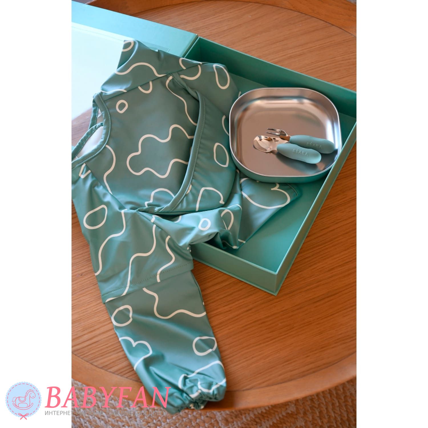 в комплекте: тарелка, тренировочные приборы, нагрудник с рукавами, подарочная коробка;