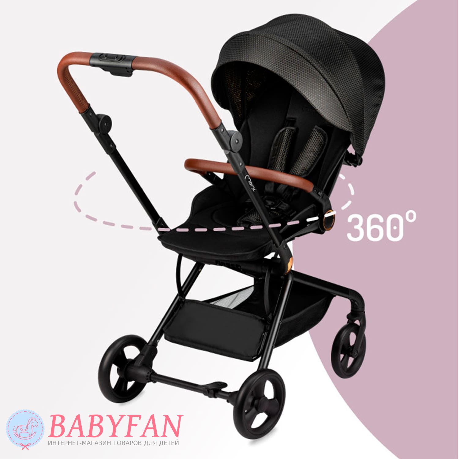 Возможность вращения сидения на 360 градусов позволяет расположить ребенка вперед или назад по направлению движения. Большой капюшон защищает от солнца, ветра и осадков, создавая уютное пространство для малыша. Амортизация и износостойкие колеса обеспечивают плавный ход даже по неровным дорогам.
