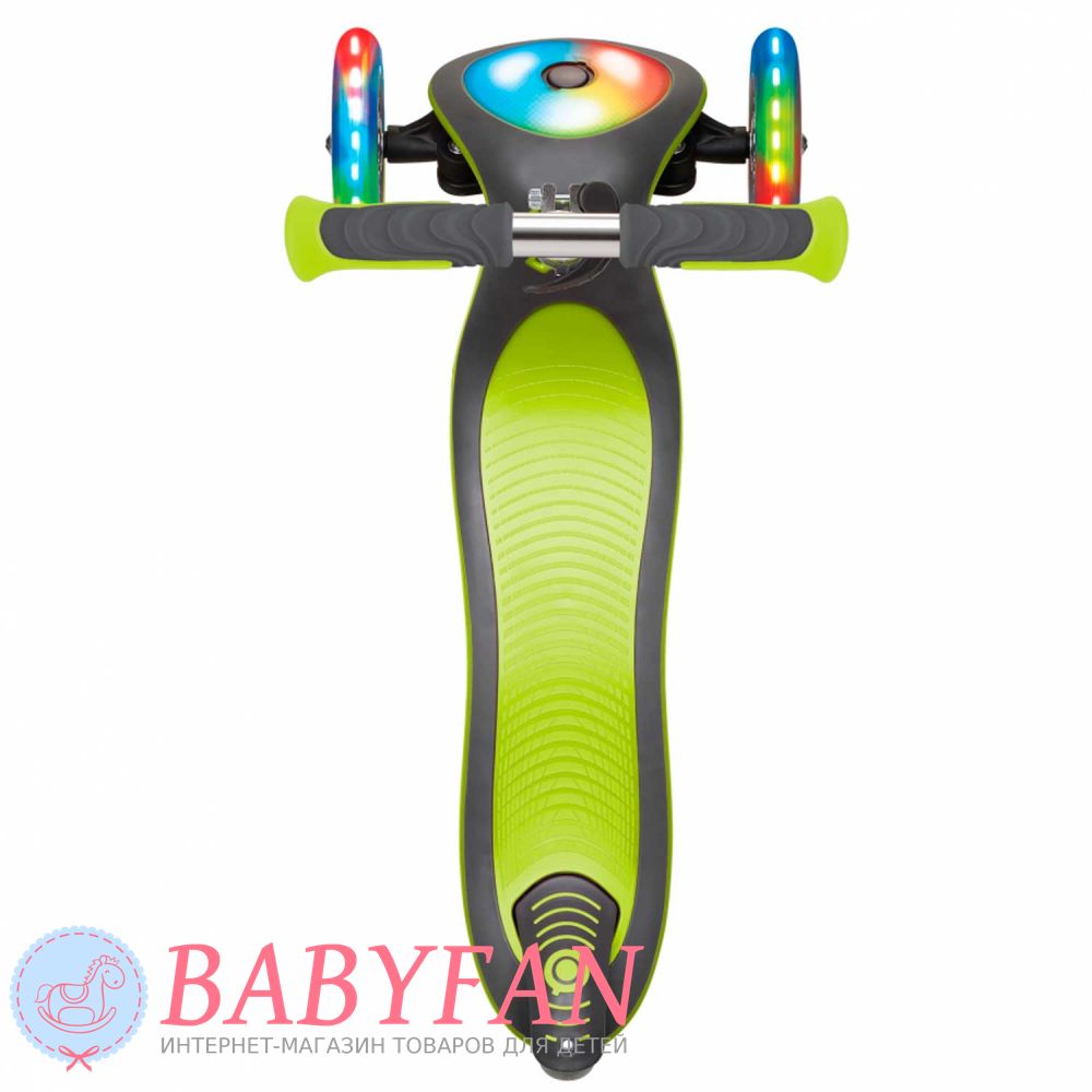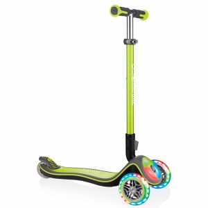 Globber Elite – легкий городской трехколесный самокат с запатентованной системой складывания для детей от 3 до 9 лет, весом до 50 кг. Выполнен по схеме «2+1» – 2 больших колеса спереди и одно поменьше сзади. Изготовлен из прочных и долговечных материалов: рулевая стойка из анодированного алюминия, армированная пластиковая дека и колеса из полиуретана. По мере роста ребенка руль регулируется по высоте в диапазоне от 68,5 до 83,5 см. Широкая дека (11-13 см) позволит комфортно кататься на самокате детям с большим размером ноги. Благодаря встроенной динамо-машине, передние колеса светятся во время движения красным, зеленым и синим цветами. Нажатием одной кнопки самокат складывается – руль поворачивается параллельно деке.
