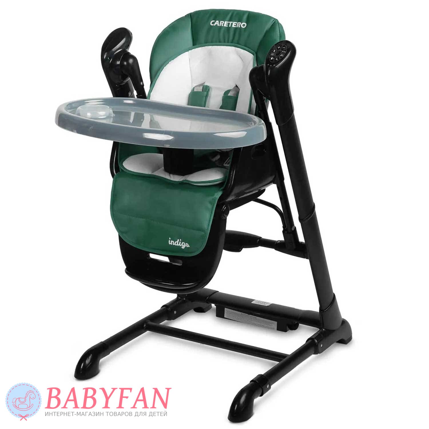 Caretero Indigo – автоматические детские качели и высокий стульчик для кормления для детей от рождения до 3 лет, весом до 15 кг. Качели предназначены для новорожденных младенцев до 9 кг, стульчик для кормления – от 6 месяцев до 15 кг. Изготовлен из качественных, прочных и практичных материалов: массивная рама из легкого алюминия, элементы конструкции из глянцевого пластика, чехол из PVC. По мере роста ребенка легко и быстро трансформируется из качели с музыкальным блоком управления и автоматическим маятником в высокий стульчик для кормления со съемным столиком и регулируемым сиденьем.