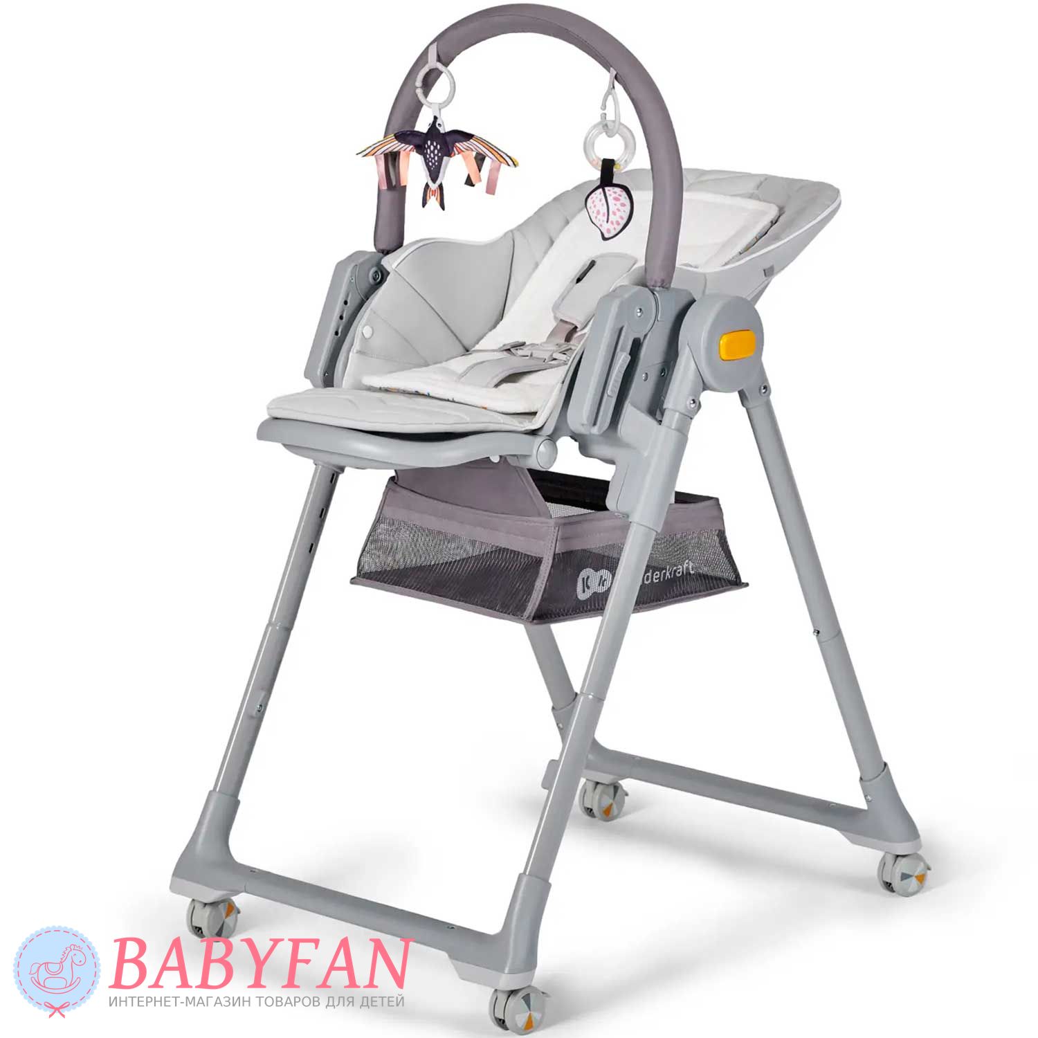 Kinderkraft Lastree – это высокий стульчик для кормления трансформер для новорожденных младенцев до 3 лет, весом до 15 кг. С момента рождения используется как детский шезлонг – спинка сиденья опускается и поднимается подножка. Для младенцев предусмотрен дополнительный двухсторонний вкладыш. В виде шезлонга на подлокотниках фиксируется интерактивная дуга со съемными мягкими игрушками закрепленными на кольцах. Выполнен в классическом дизайне, палитра моделей состоит из 3 цветов: бежевый, розовый и серый. Изготовлен из прочных, долговечных и практичных материалов: металлическая рама с элементами из пластика и чехол из экокожи.