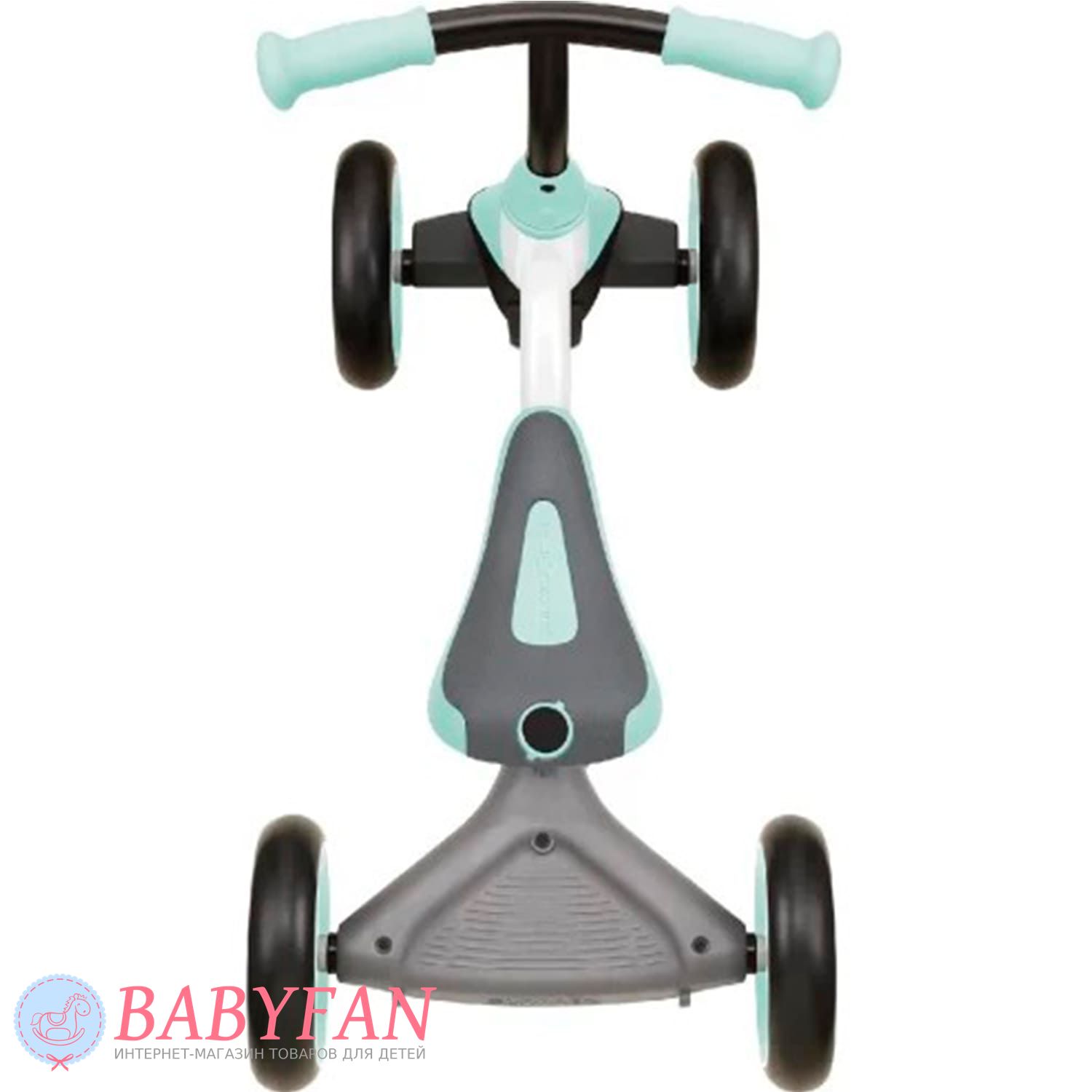 с 2 лет можно отсоединить подножку и родительскую ручку, дав возможность малышу самостоятельно ездить на полноценном четырехколесном беговеле;