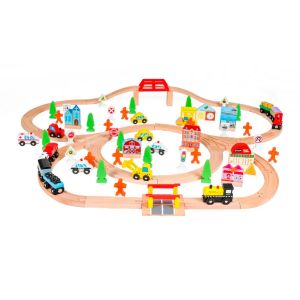 - Дерев'яні залізниці – міцні, екологічно чисті, з бука, з ручним керуванням. Складаються з паровоза, вагонів, замкнених залізничних колій та елементів інфраструктури. Будуються на підлозі або столі.