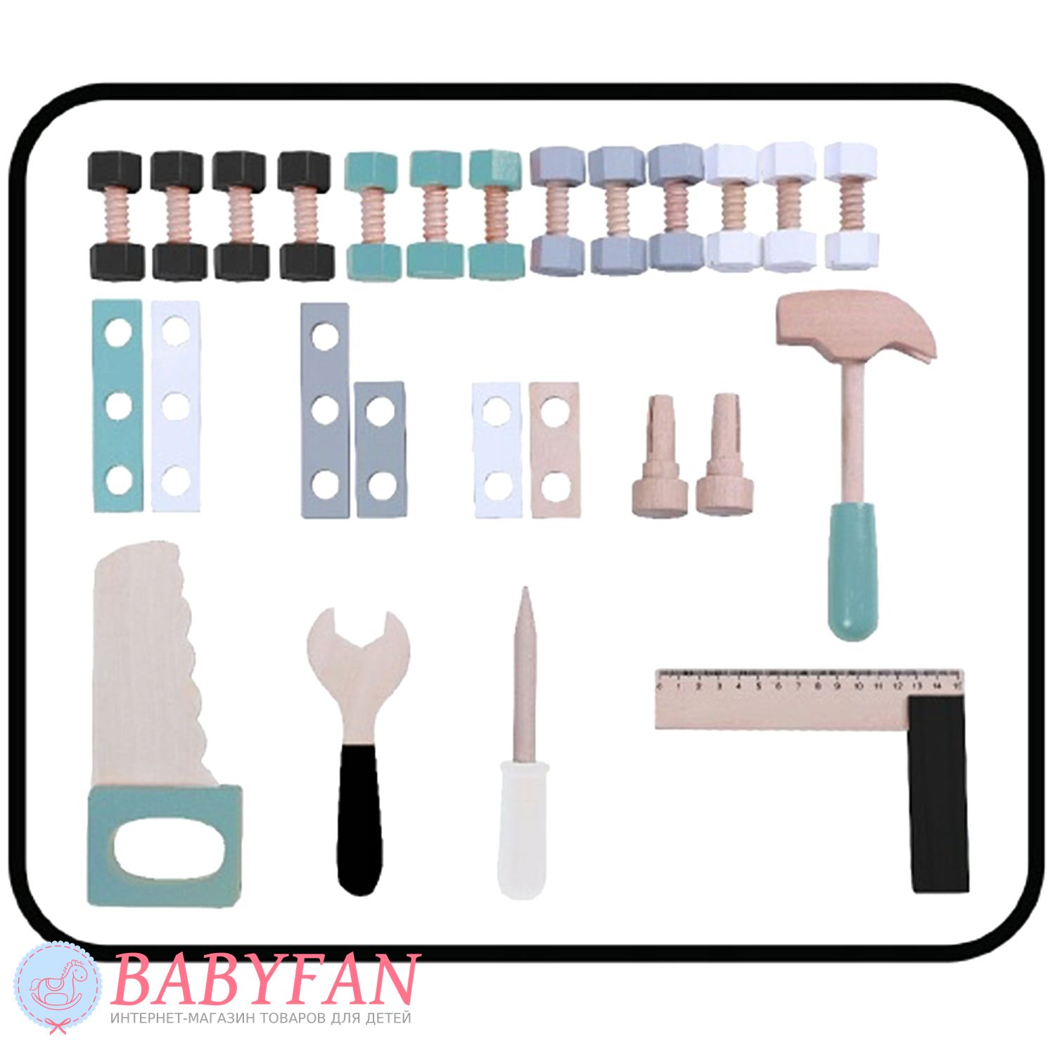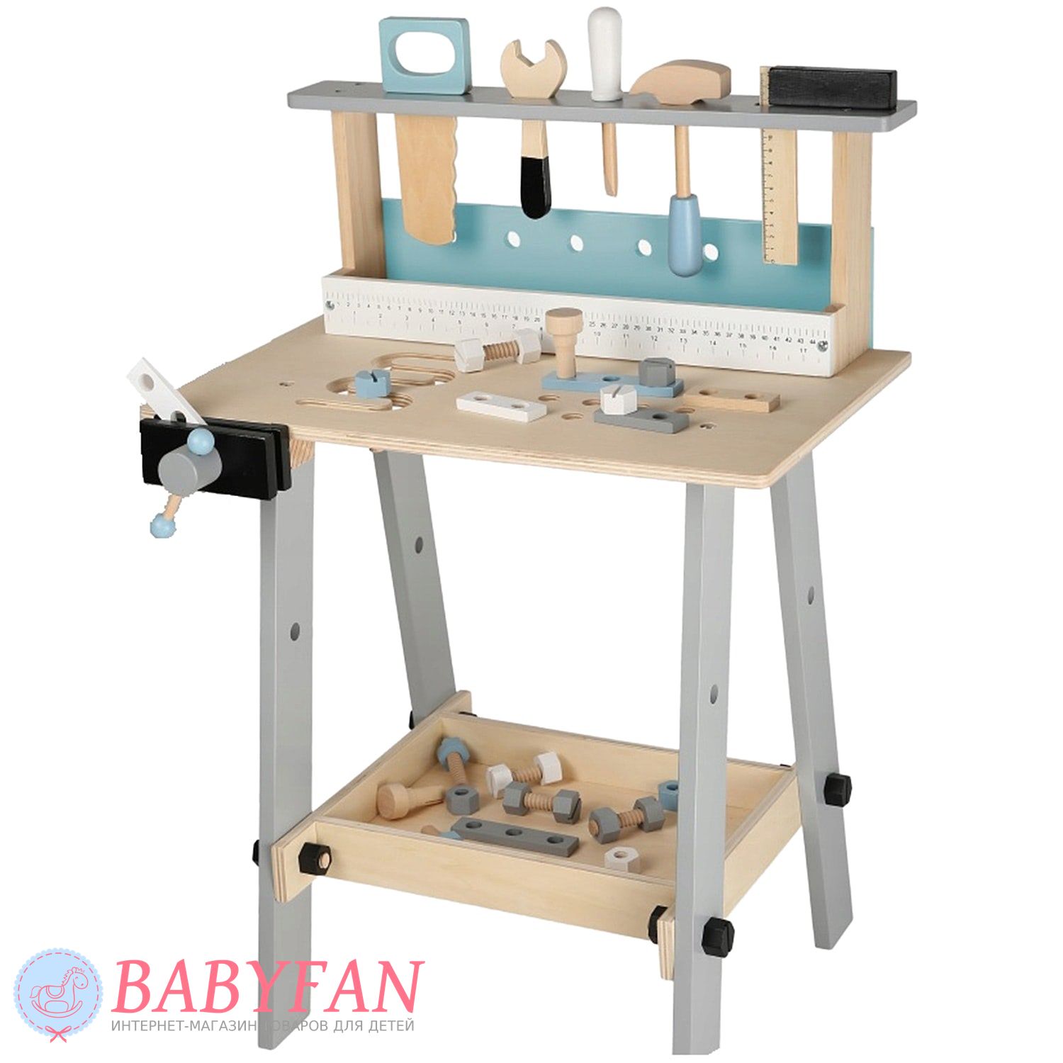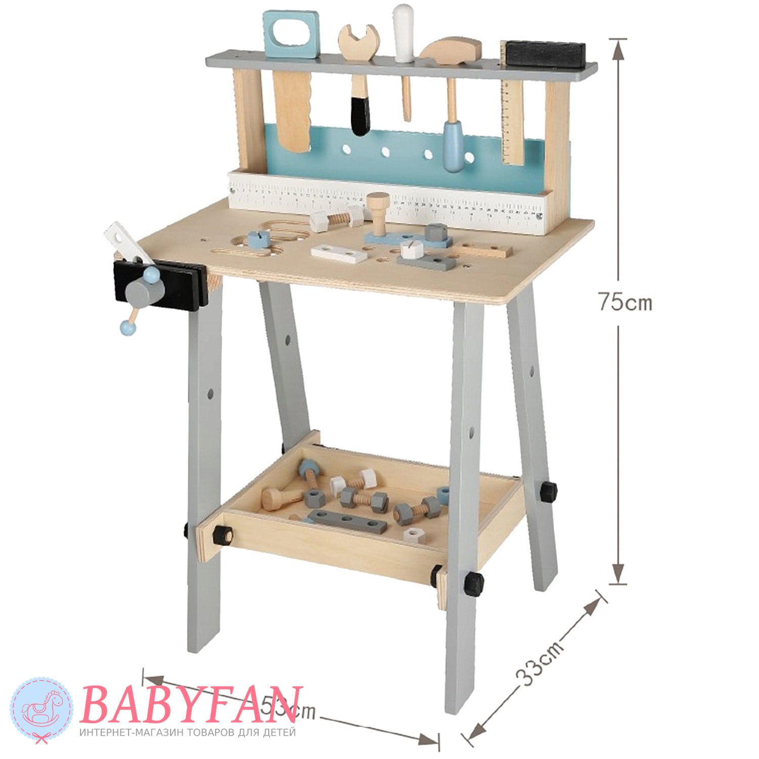 - верстат та інструменти виготовлені з деревини, завдяки чому ігровий набір відрізняється міцністю, довговічністю та безпекою. Він не виділяє токсичних речовин у повітря і під час гри навіть за необережного руху дитина не пораниться дерев'яними інструментами;