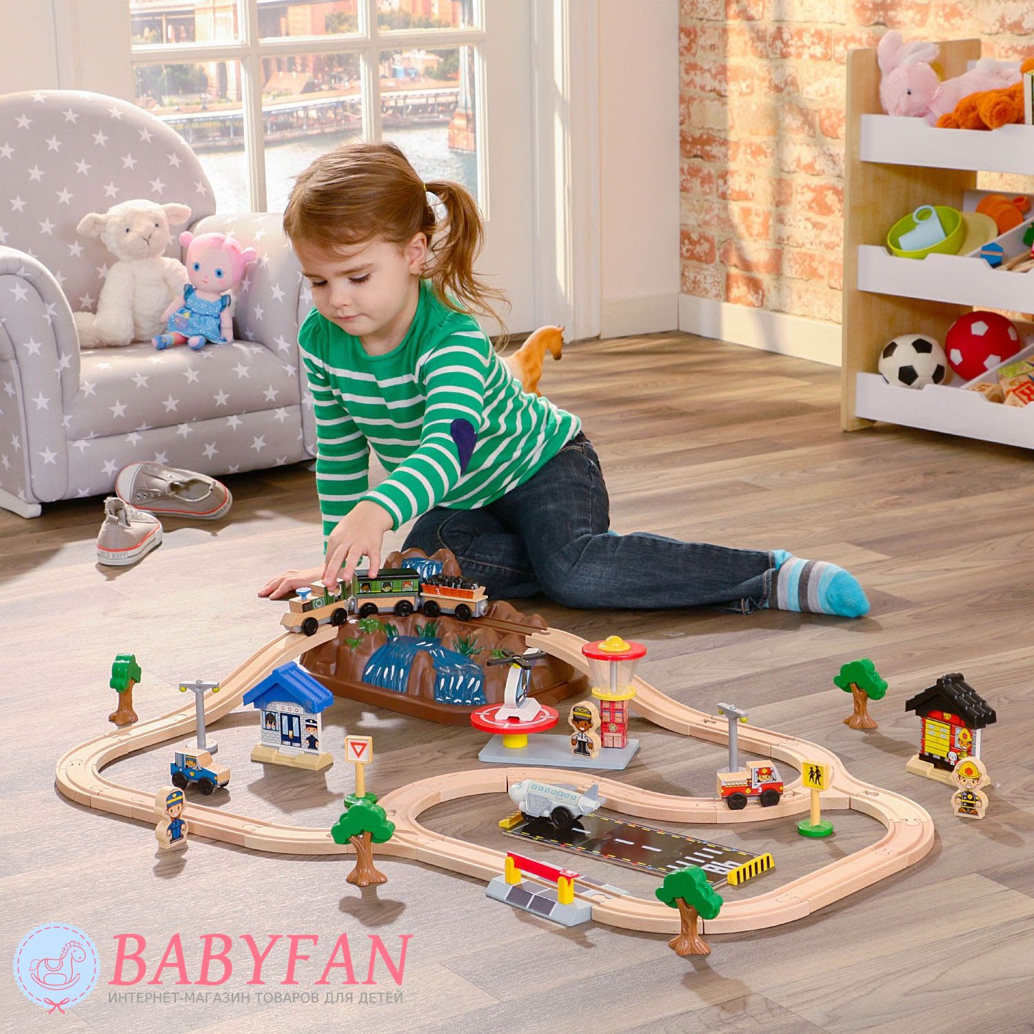 Дерев'яна залізниця KidKraft 17826 «Bucket Top Mountain» – цікава ігрова зона з довгою залізницею, вертолітним майданчиком та злітно-посадковою смугою для літака. Ігровий набір KidKraft включає 61 елемент, який дитина самостійно складає, створюючи дерев'яну залізницю, що сприяє розвитку у нього логіки, кмітливості та дрібної моторики.