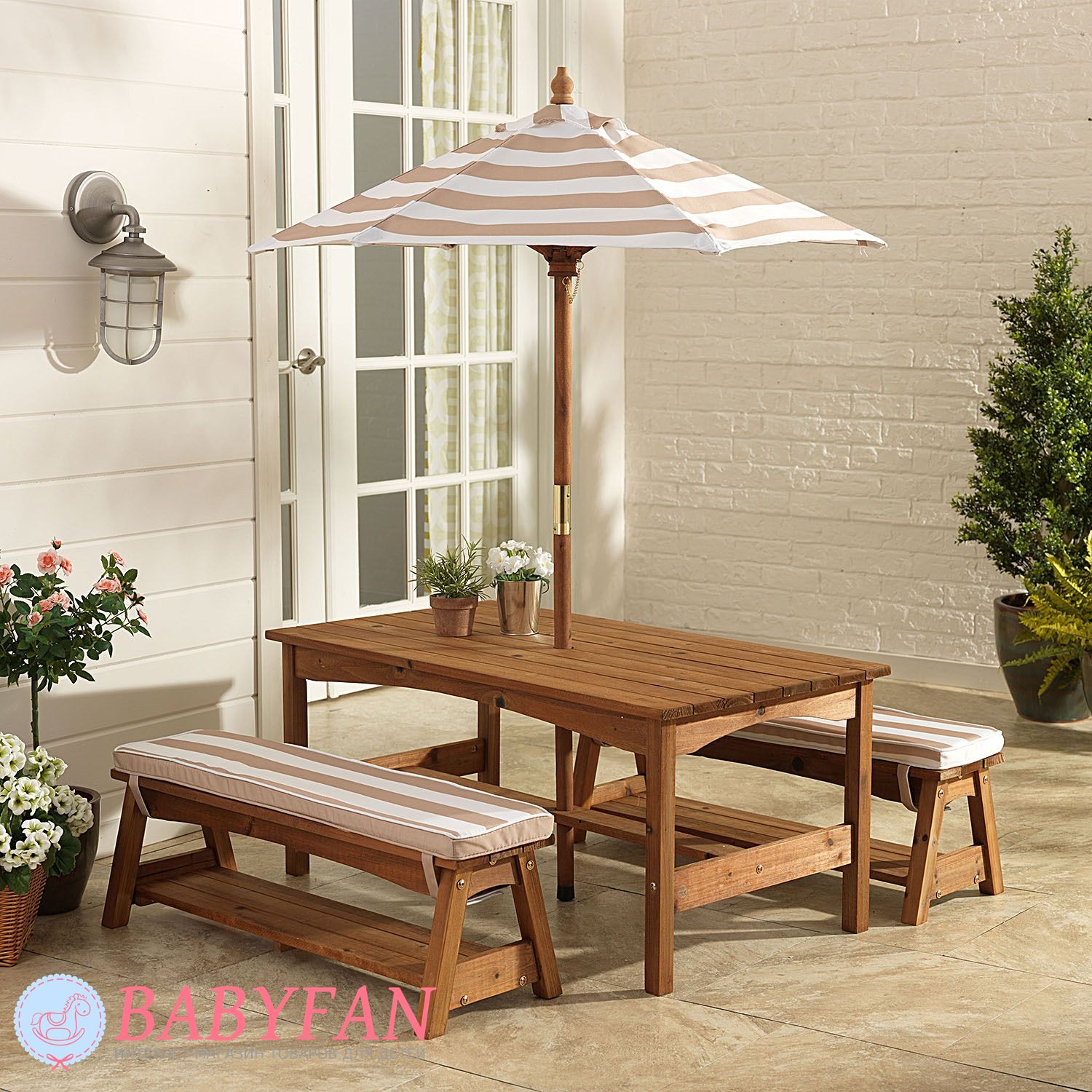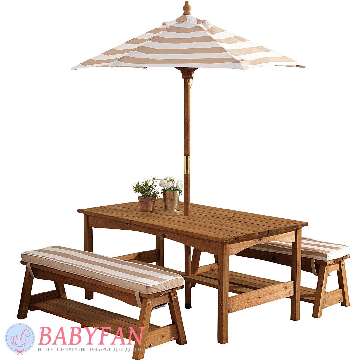 Дерев'яний столик з лавами та парасолькою Kidkraft 00500 «Oatmeal & White Stripes» – оригінальний комплект дитячих меблів із якісної деревини для експлуатації на свіжому повітрі. Практичне місце для прийому пиши, настільних ігор та творчості на самоті або в компанії друзів.