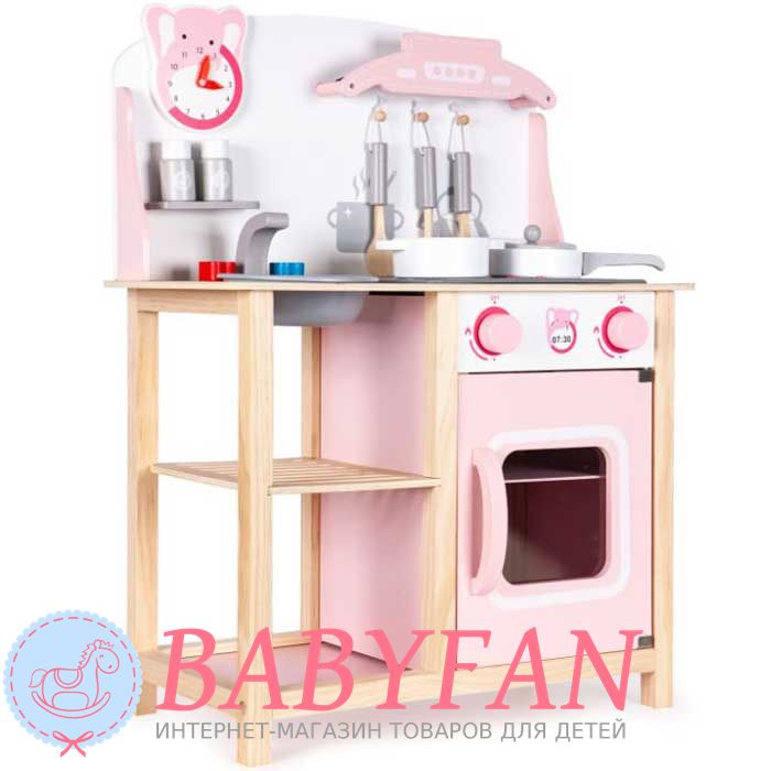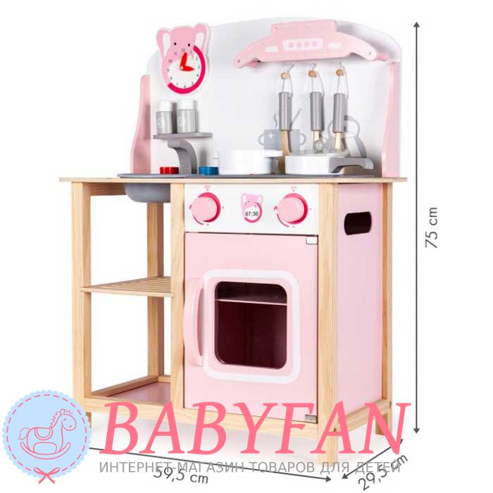 - в комплекті з кухнею є 7 кухонного приладдя: сковорода з кришкою, каструля, сіль, перець і 3 різні кухонні речі;