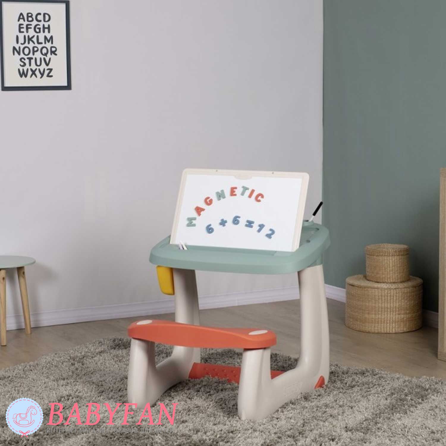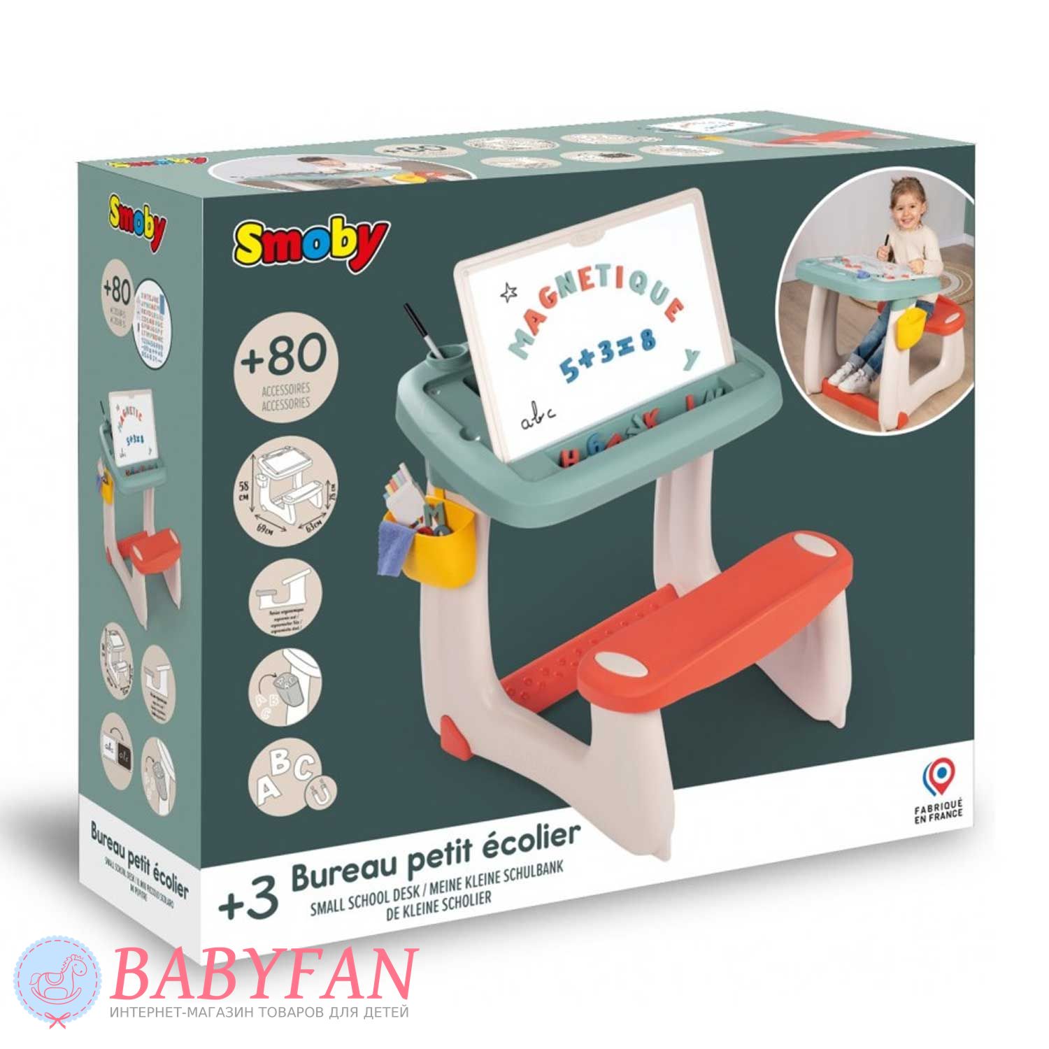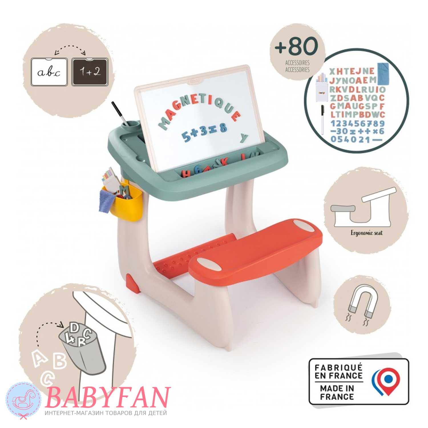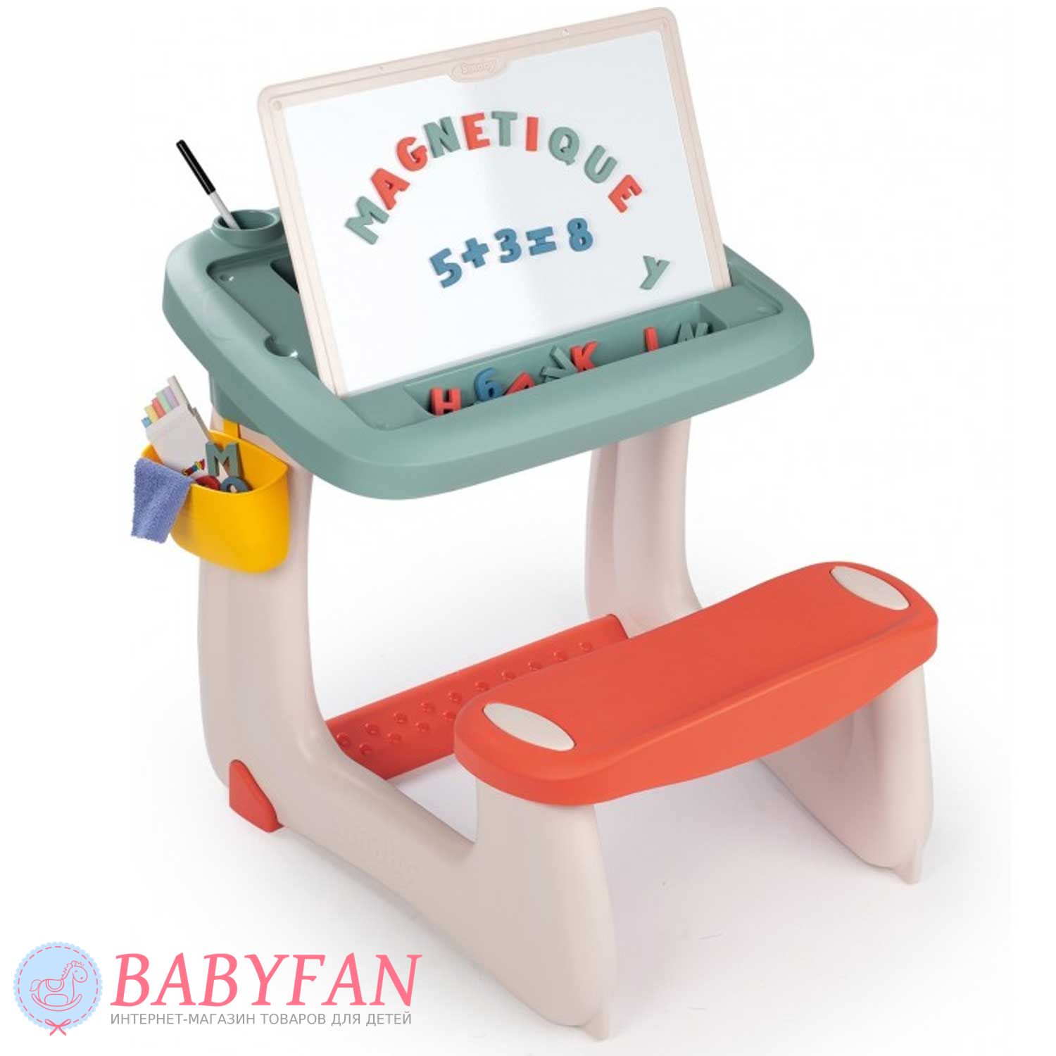 Дитяча парта Smoby 420107 – це шкільний стіл із похилою дошкою, з'єднаний з лавкою для дітей віком від 3 до 5 років. Оснащена двосторонньою дошкою для малювання: одна сторона для маркера, інша – для малювання крейдою. Виготовлена з міцного та легкого пластику. Безпечна - не має гострих кутів і граней, про які дитина змогла б поранитися. На столі розміщено 2 олівці та поглиблення для маркерів. На столі є глибокий контейнер для дрібного приладдя – канцелярських товарів, конструктора. Контейнер закривається кришкою. Малювати за партою можна на аркуші паперу, прикріпивши його за допомогою магнітів. Парта формує у дітей правильну поставу.