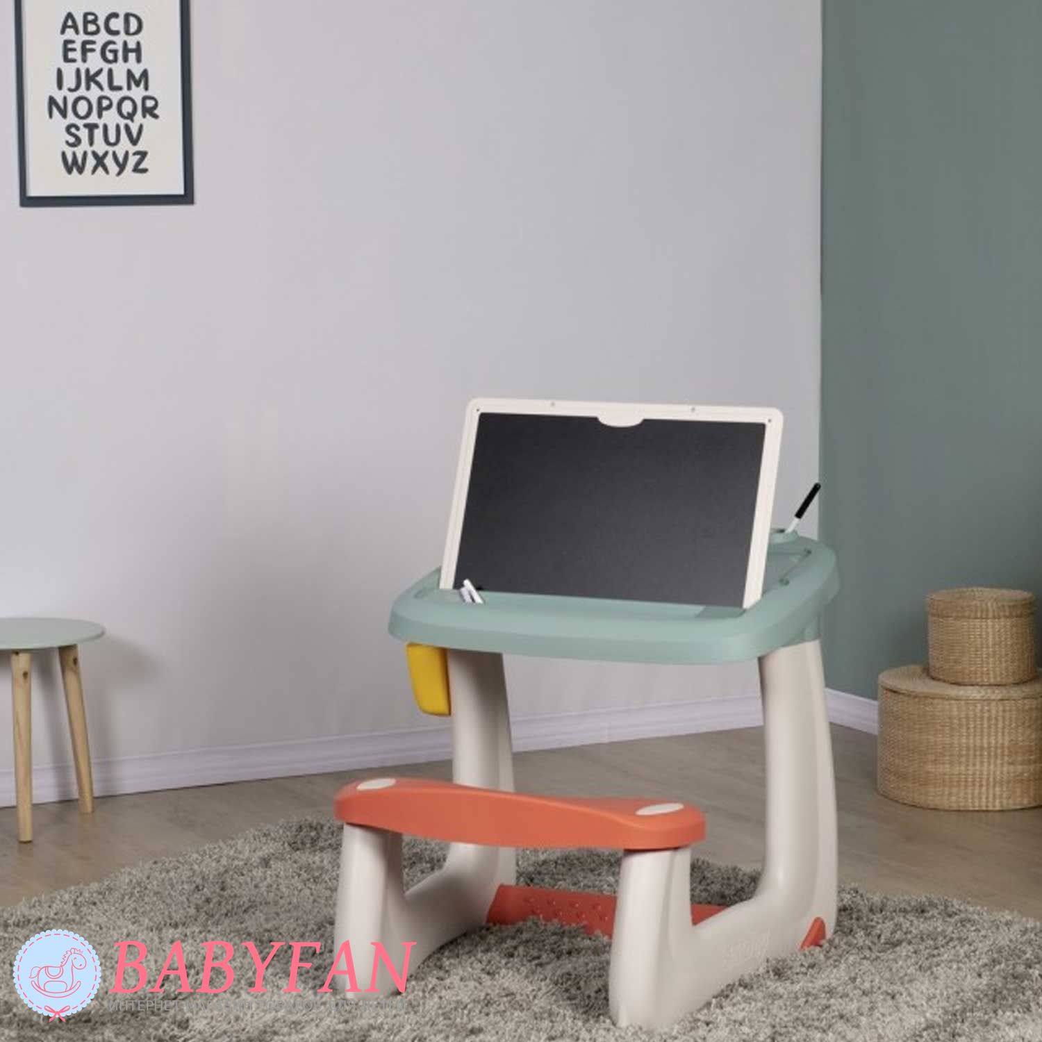 Комплект:6 кольорових крейд , двостороння дошка для малювання , кошик для аксесуарів , 1 ручка , 72 літери, цифри та знаків , парта