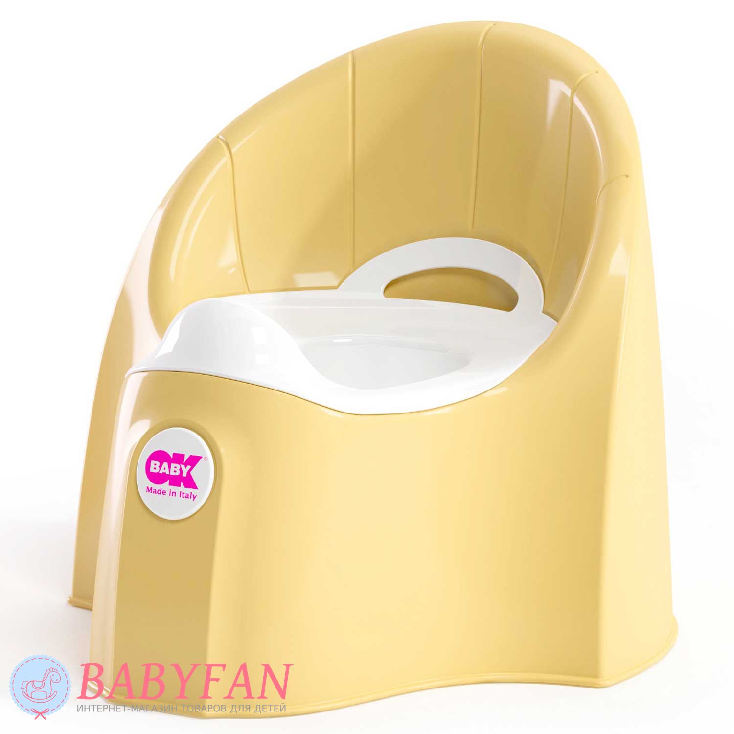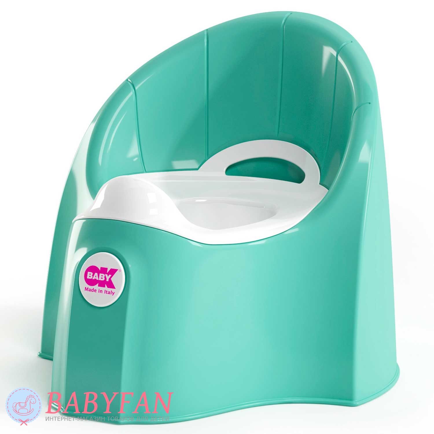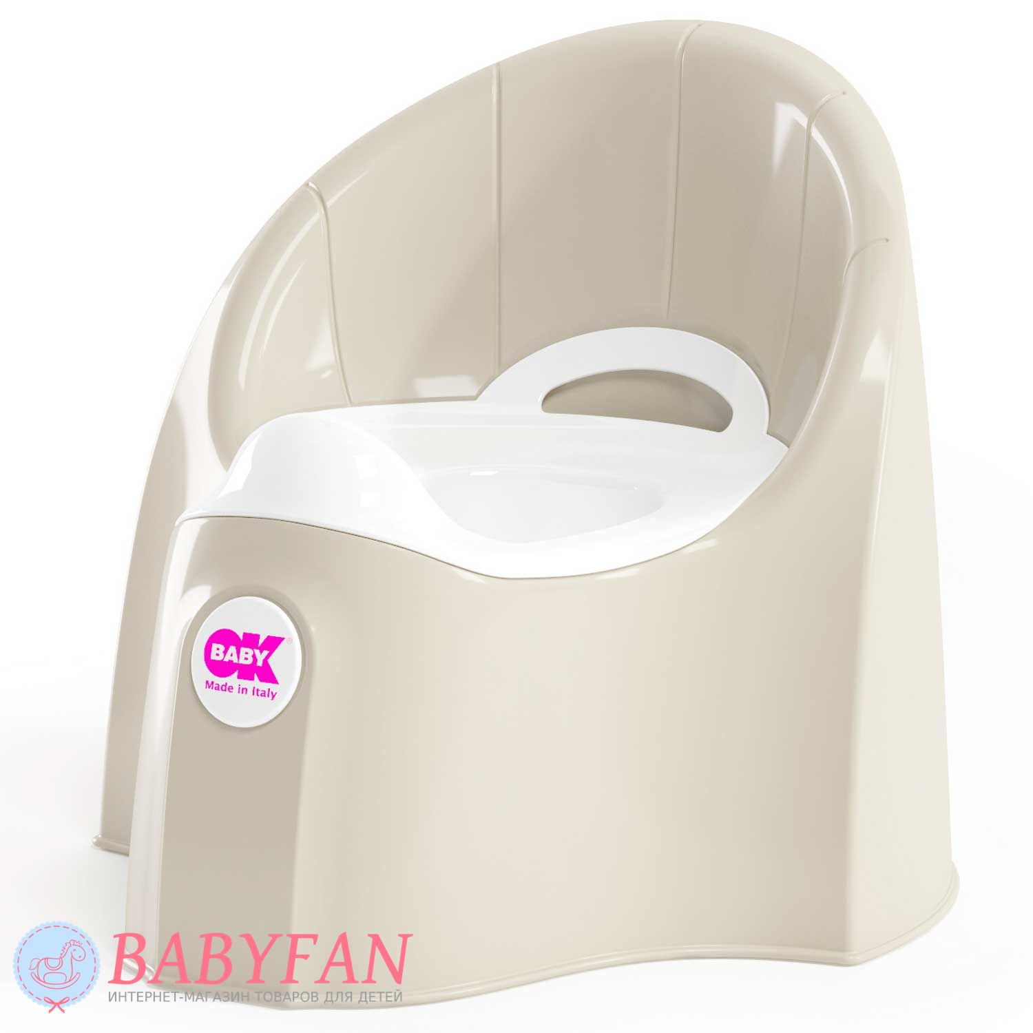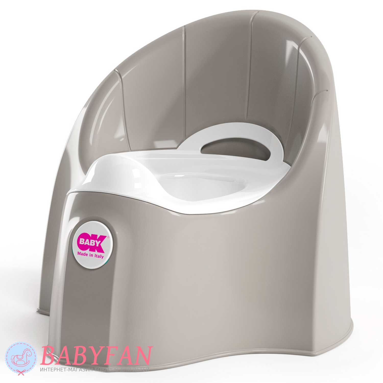 Дитячий горщик OK Baby Pasha – виготовлений із пластмаси, безпечної для дітей. Горщик виконаний у вигляді стільця з високою зручною спинкою, але без ніжок. Конструкція стійка та надійна, без гострих кутів. Внутрішня частина горщика, контейнер для випорожнення, знімна та легко виймається/вставляється за допомогою спеціальної ручки. Також є передній захист про розбризкування. Підходить як для хлопчиків, так і дівчаток.