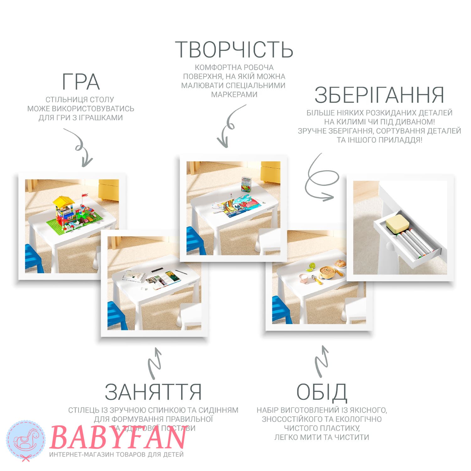Столик та випорожнення виконані з екологічно чистих матеріалів, що робить їх безпечними для здоров'я дітей. Конструкція стійка і запобігає перекиданню, що особливо важливо для маленьких непосид. Простий та сучасний дизайн дозволяє легко інтегрувати комплект до інтер'єру будь-якої кімнати.