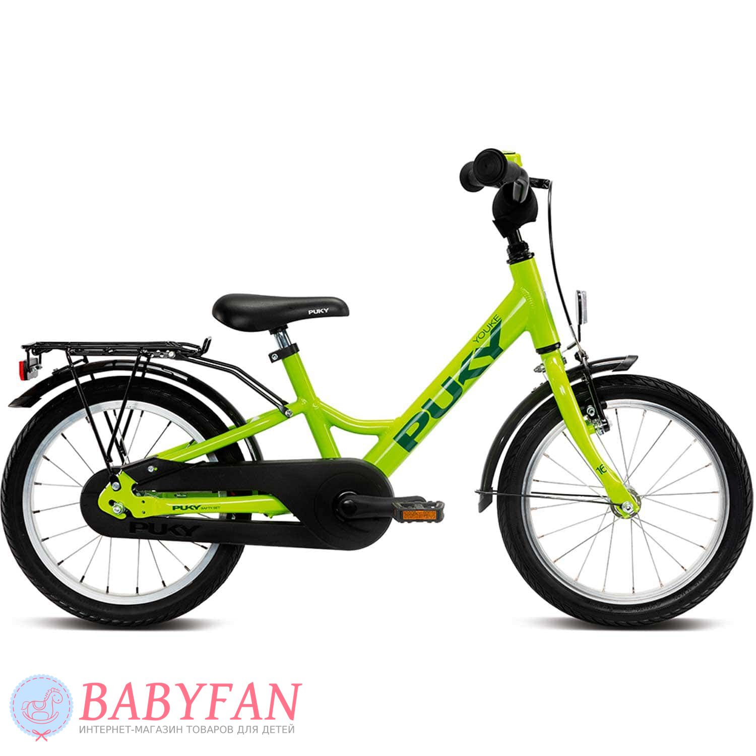 Колеса Puky YOUKE 16 надувні, спицеві, Ruky Components. Переднє обіднє гальмо V-brake керується вручну. На задньому колесі гальмо барабанне, вбудоване у втулку – активується обертанням педалі назад. Від бризок та бруду дитина захищена бризковиками на задньому та передньому колесі. Педалі протиковзкі із вбудованими світловідбивачами. Спереду та ззаду встановлені світловідбиваючі ліхтарі. Кермо пряме, T-подібне з протиковзкими гумовими грипсами та захистом рук. Сідло велосипеда та кермо плавно регулюються по висоті.