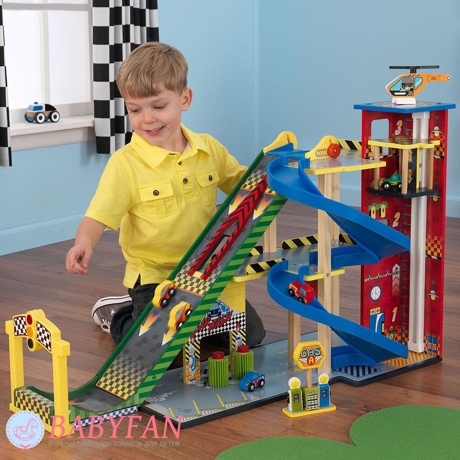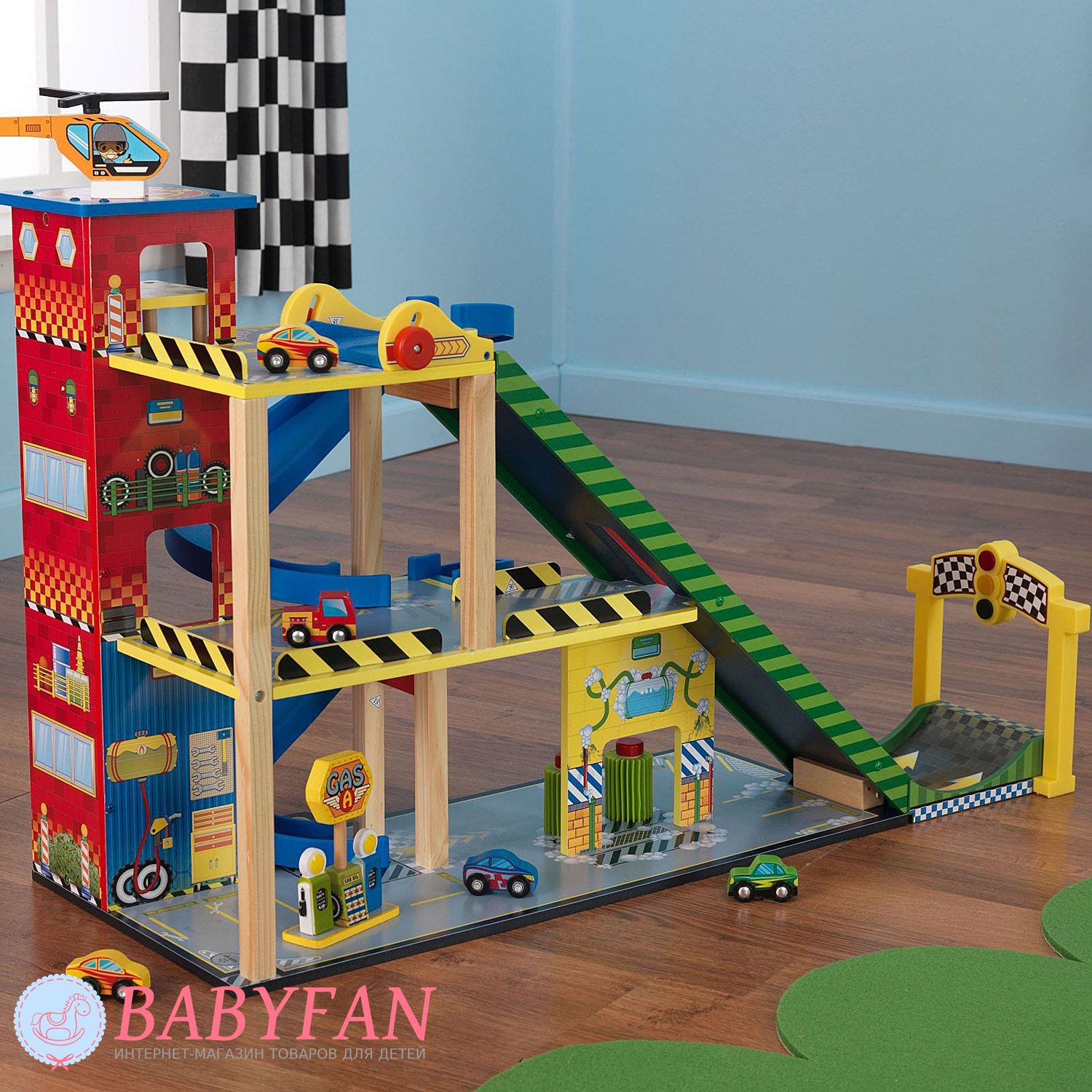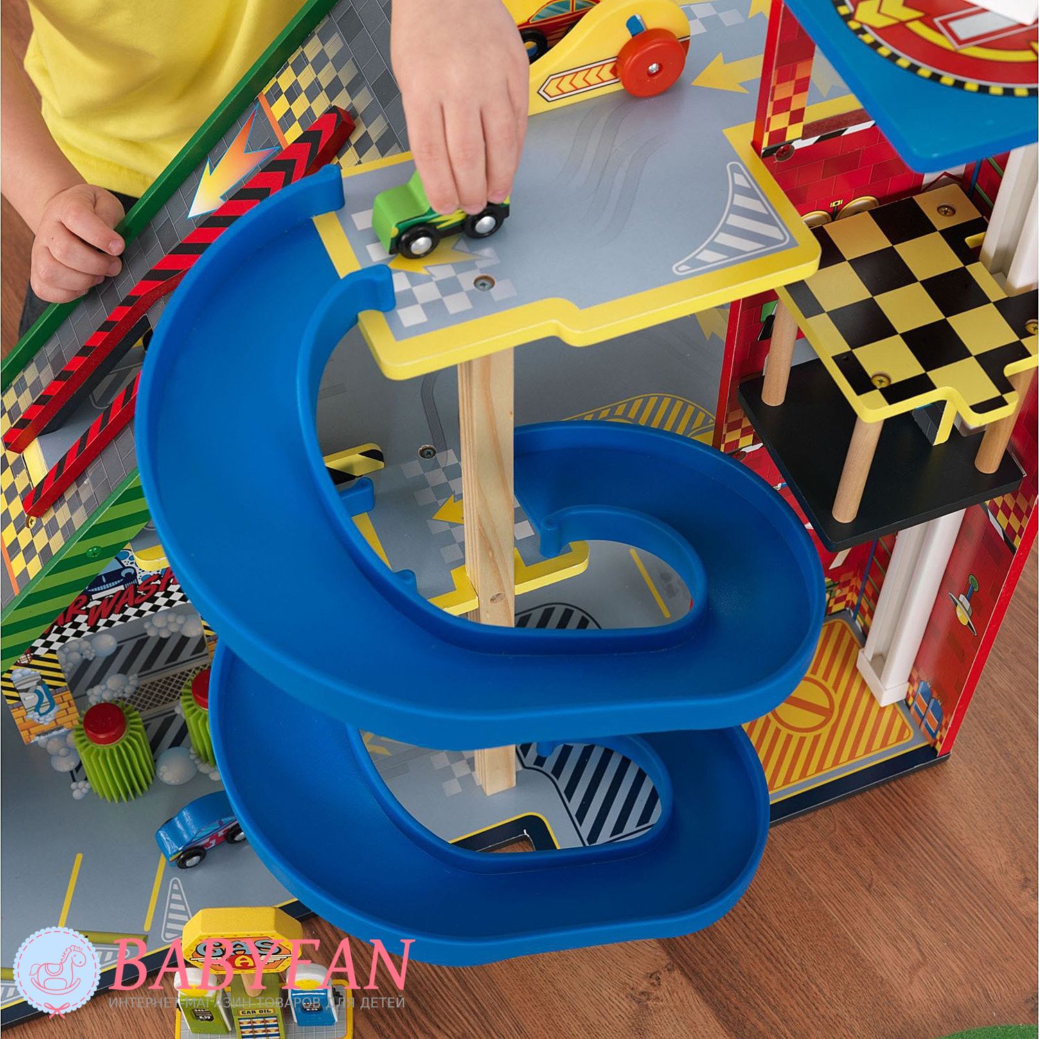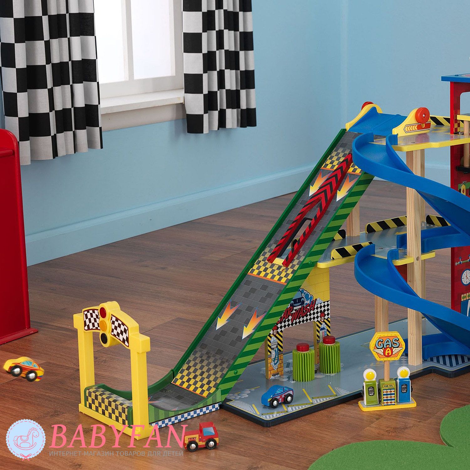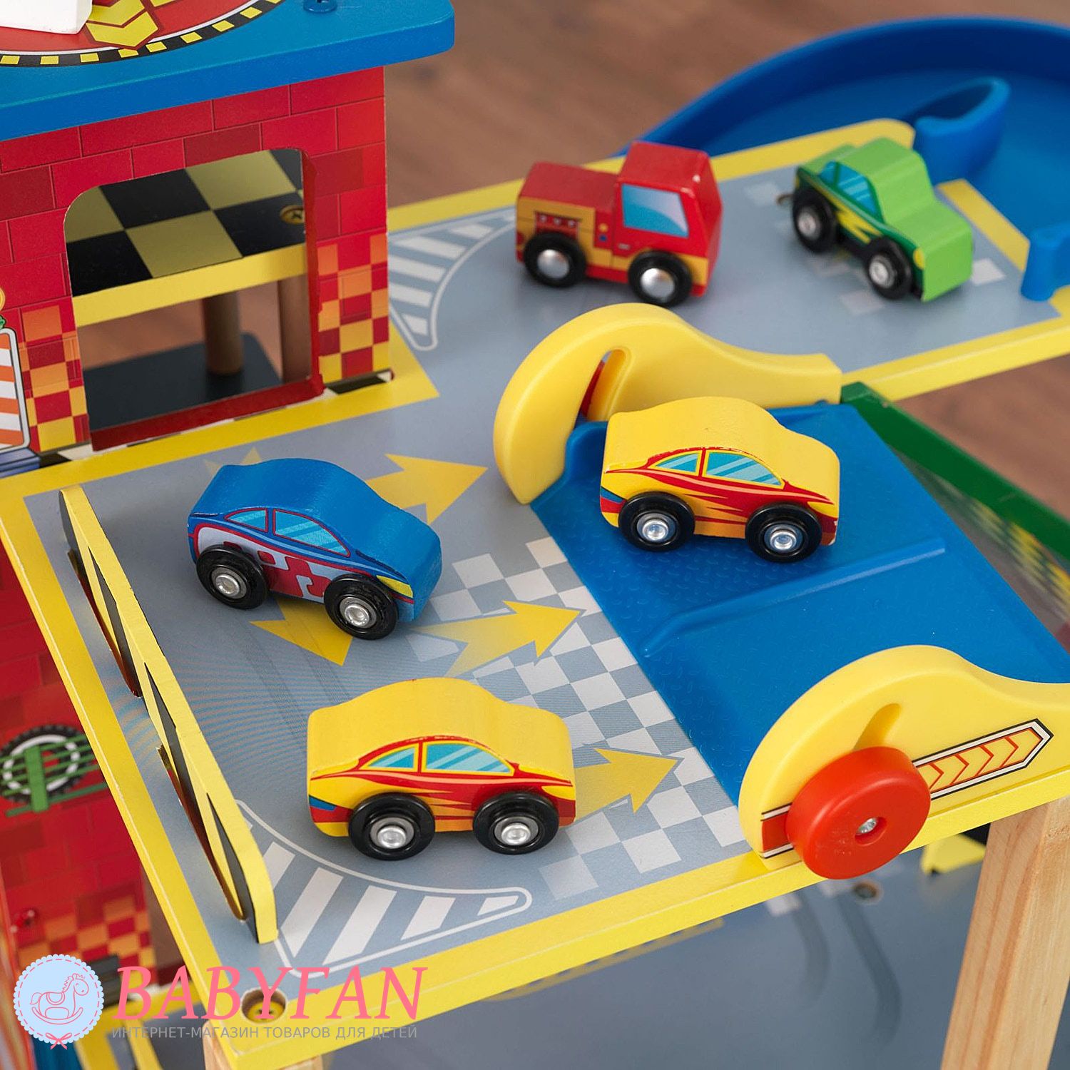 - гоночний набір складає три поверхи. На першому поверсі є парковка для п'яти машинок, що входять до комплекту. Тут діти можуть залишати свої машинки, коли вони займаються іншими справами або просто залишати частину машинок, що не беруть участь у автоперегонах. Також на першому поверсі розташовано автомобільне миття, оснащене рухомими щітками, що надає процесу миття машини реалістичність. І ще на першому поверсі юні водії можуть заправити свій автопарк на сучасній автозаправній станції. На другому поверсі комплексу розташовано висотне паркування, а третій поверх – це стартовий майданчик для 2-х швидкісних з'їздів;