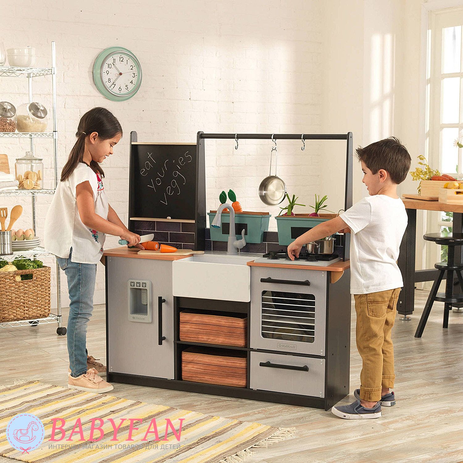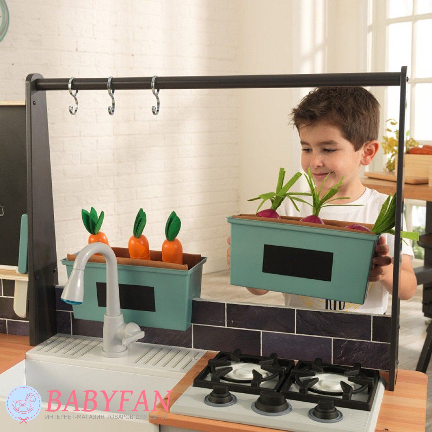 Інтерактивна кухня KidKraft 53411 "Farm To Table" - компактна іграшкова кухня з інтерактивними функціями. Майбутні майстри-кулінари можуть не тільки набути навичок у процесі приготування їжі, але й самі виростити продукти, зокрема червону цибулю та моркву, з яких потім приготувати страву. Кухня оснащена різним кухонним начинням, шафами, що відкриваються, і льодогенератором, завдяки чому гра стає максимально реалістичною.