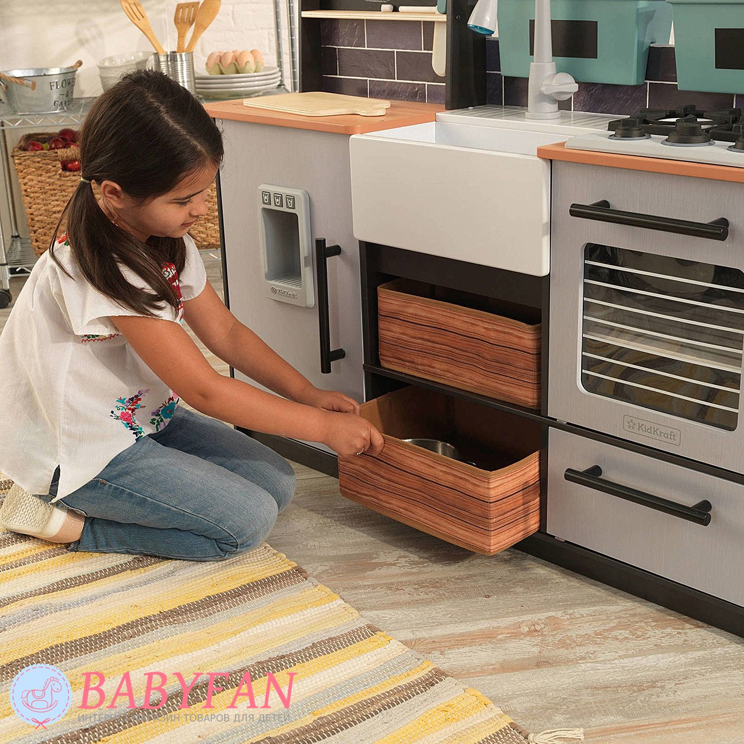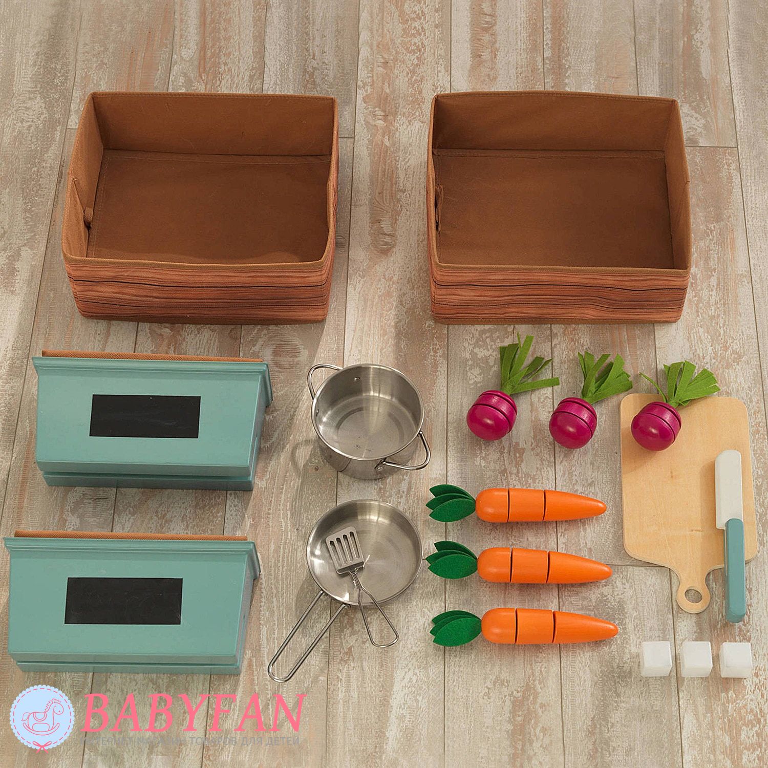 - підвісні гачки та тканинні ящики, оброблені із зовнішнього боку під деревину призначені для зберігання кухонного начиння. У процес гри діти навчатимуться підтримувати порядок на кухні;
