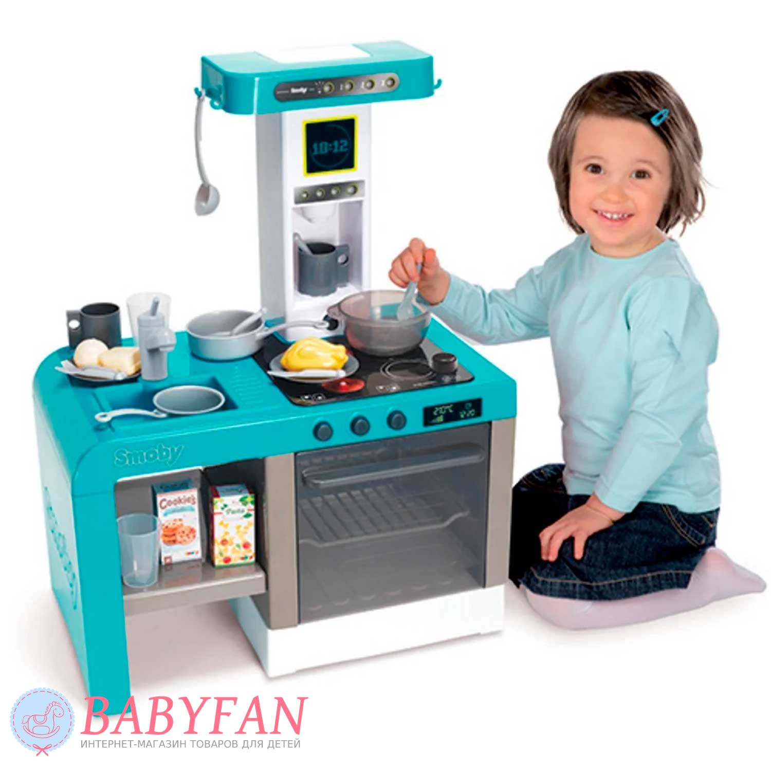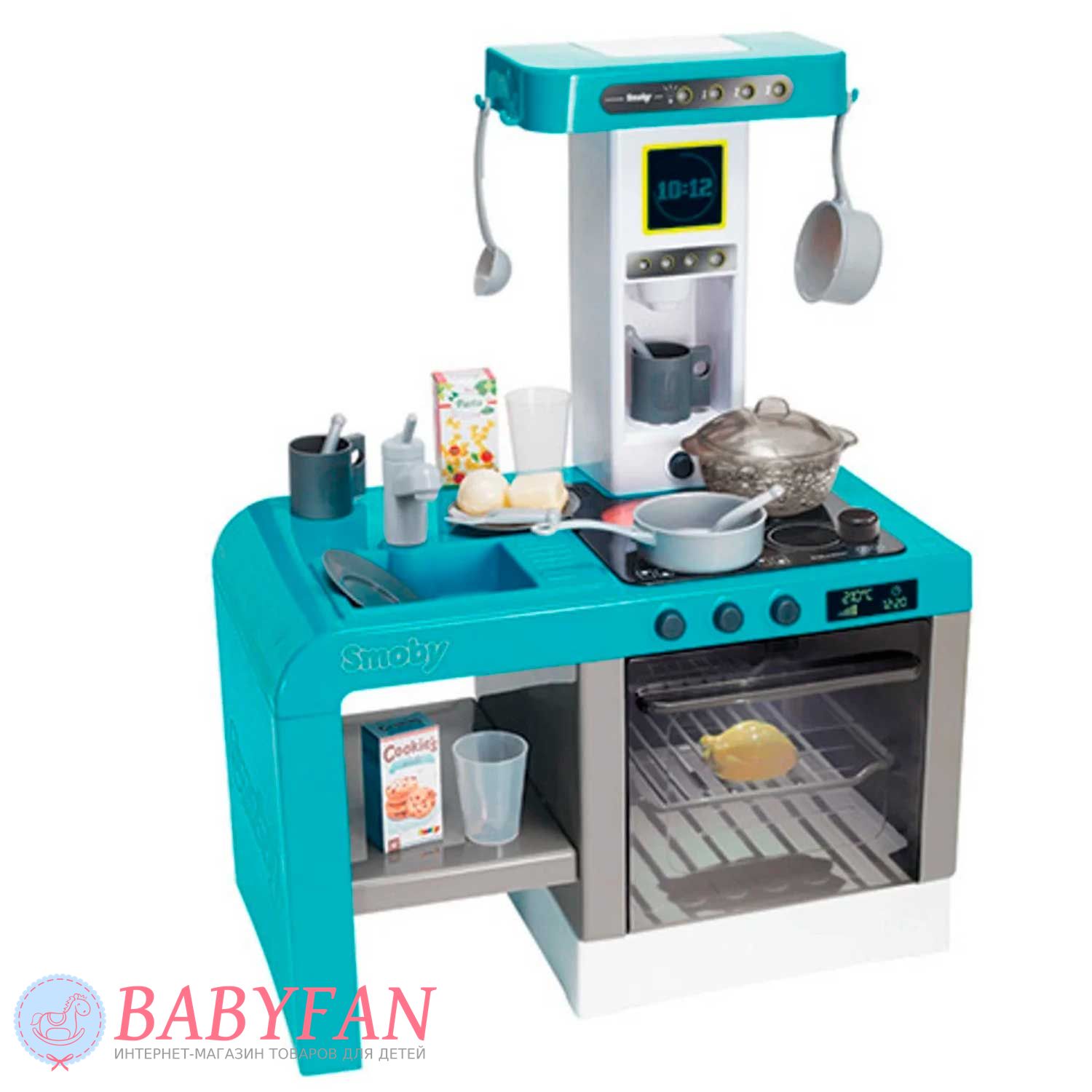 Інтерактивна міні кухня ChefTronic Mini Tefal Smoby 311409 призначена для дітей віком від 3-х років. Це компактна кухня нового дизайну зі світло-звуковими ефектами та безліччю аксесуарів. Габарити кухні дозволяють розмістити її в кімнаті дитини на підлозі або поставити на стіл, тумбу або інше місце. Кухня оснащена варильною панеллю на чотири конфорки з кнопками, при натисканні на які чути звуки приготування їжі: шипіння, булькання. Є духовка, в якій при відкриванні дверцят активується підсвічування всередині духовки. У кухні вбудована кавоварка з кнопкою, яка активує звук, що імітує приготування кави. Інтерактивна кухня має раковину з краном (без води), обробний столик, гачки для розміщення кухонного приладдя та поличку для продуктів, ковшик, сковорідку, ополоник, 2 упаковки з продуктами, 2 тарілки, 2 склянки, 2 вилки, 2 ложки, 2 ножі, 1 кухоль, курку та 3 тістечка. Працює кухня від 3 батарейок типу АА (у комплект не входять).