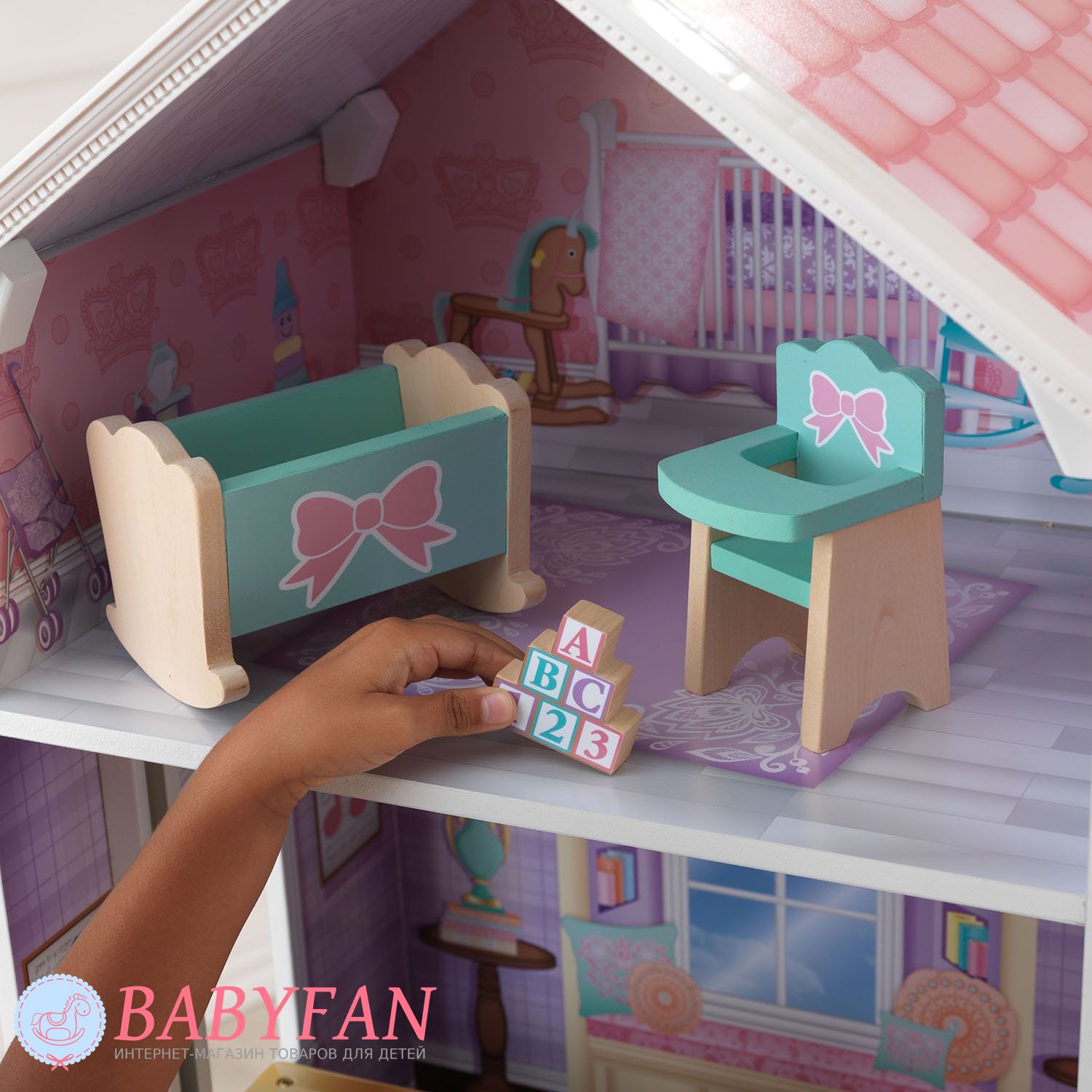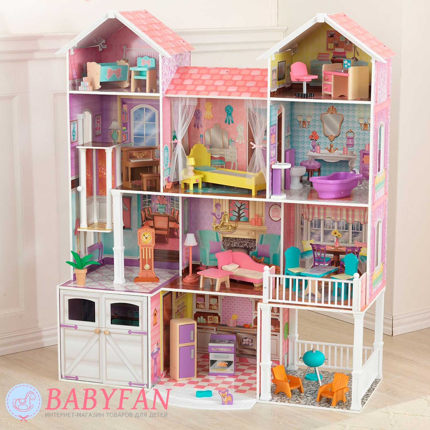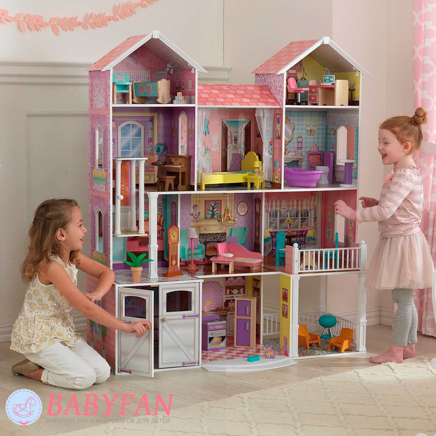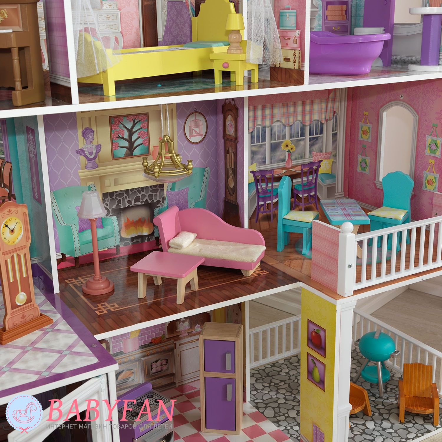 Інтерактивний ляльковий будиночок KidKraft 65242 «Country Estate» – мебльований чотириповерховий будиночок з 11-ма кімнатами та ліфтом. Величезний будинок стане комфортабельним житлом для лялечок висотою до 30 см і захоплюючою ігровою зоною для дівчинки та її подружок. Реалістичні предмети, що складають інтер'єр будиночка урізноманітнюють гру, до того ж серед них є інтерактивні аксесуари - лампа з світлом, що включається, і піаніно зі звуковим і світловим ефектом. Ляльковий будиночок має все, щоб відпочивати, працювати та спілкуватися з друзями.