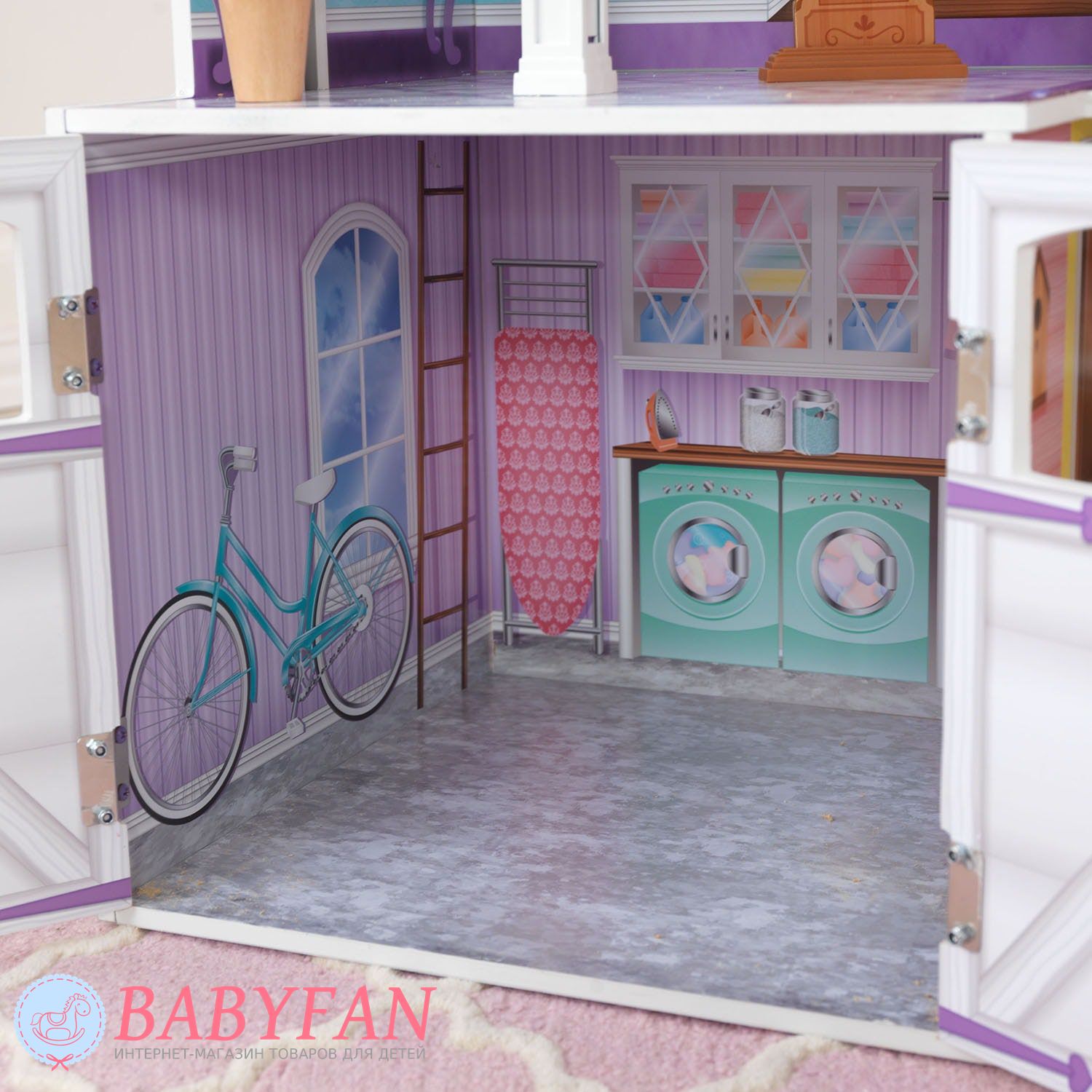 - у такому ляльковому будиночку можна поселити цілу сім'ю, адже в ньому є окрема кімната для малюка з колискою, стільчиком для годування та кубиками із зображенням цифр та літер, а також робочий кабінет, дитяча кімната, спальня, вітальня, кухня, ванна кімната та відкрита тераса з барбекю. Крім того є господарська кімната з дверима, що відчиняються/зачиняються, де на стінах зображені пральні машини, прасувальна дошка, сходи і велосипед, це приміщення також можна використовувати як гараж;