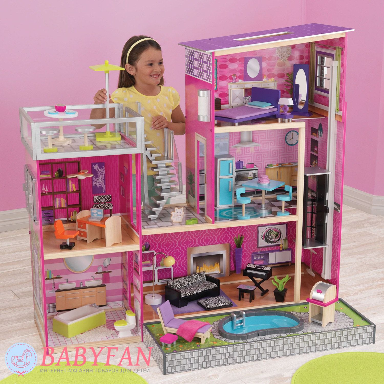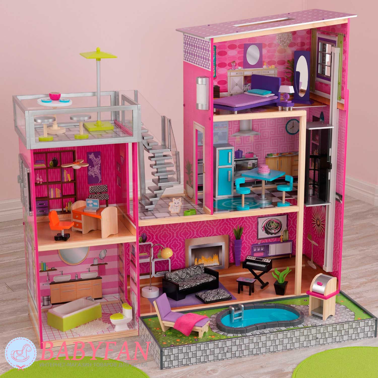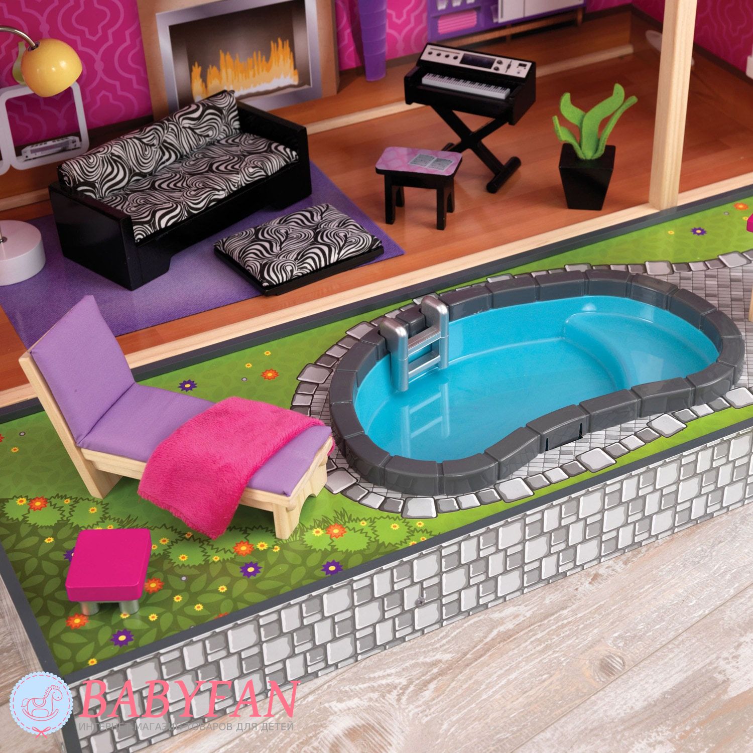 Інтерактивний ляльковий будиночок KidKraft 65833 "Uptown" - величезний 6-ти кімнатний заміський особняк з відкритим великим басейном. Завдяки звуковим та світловим ефектам, деталізованому інтер'єру та реалістичним елементам меблів гра стає більш реалістичною. Будинок настільки величезний, що одночасно в сюжетно-рольові ігри може бавитися велика компанія дітей, розвиваючи своє мислення та навички життя в соціумі.