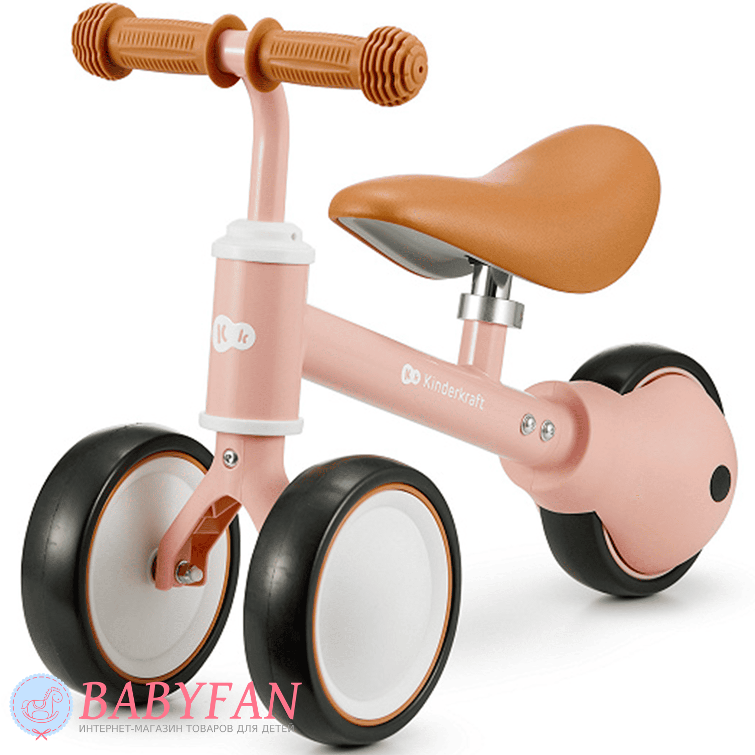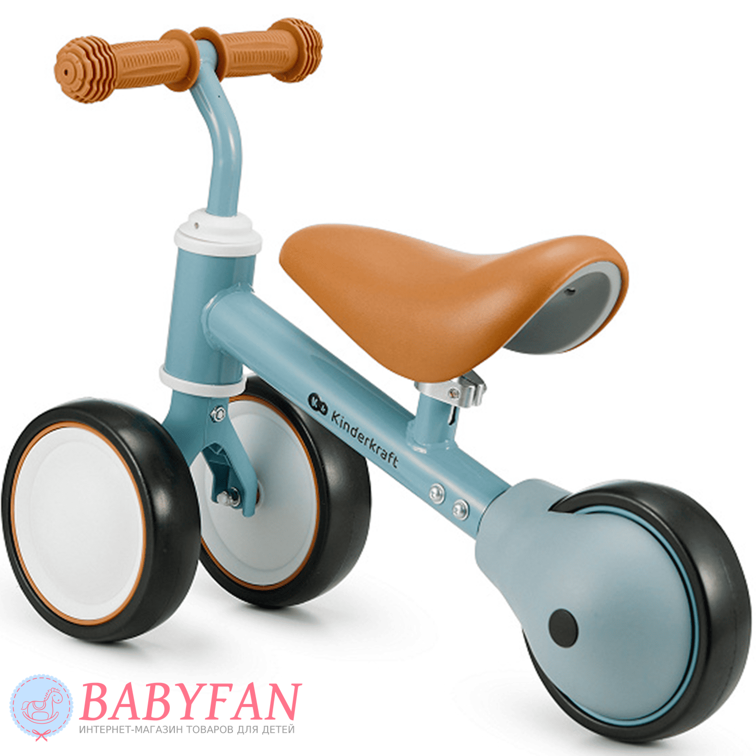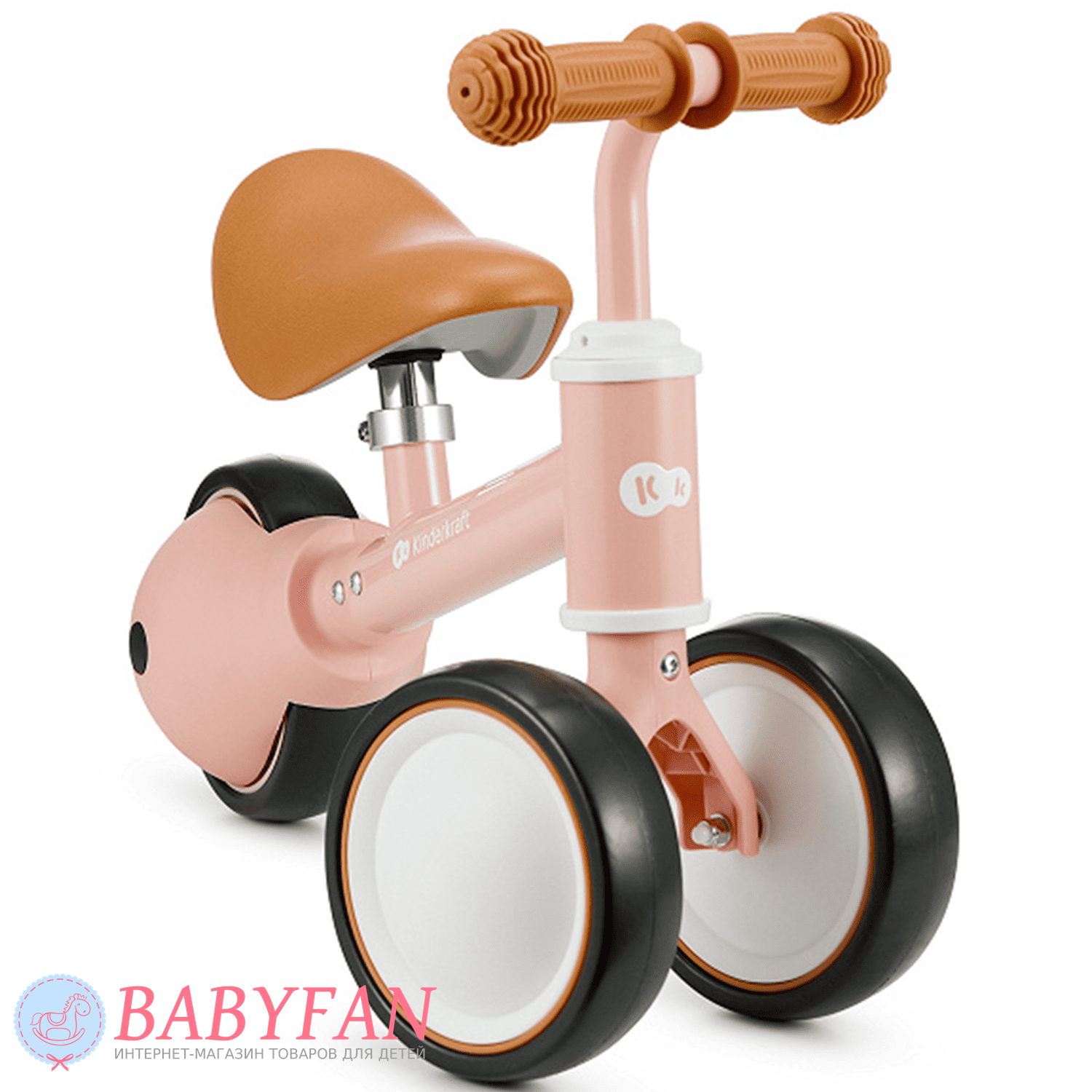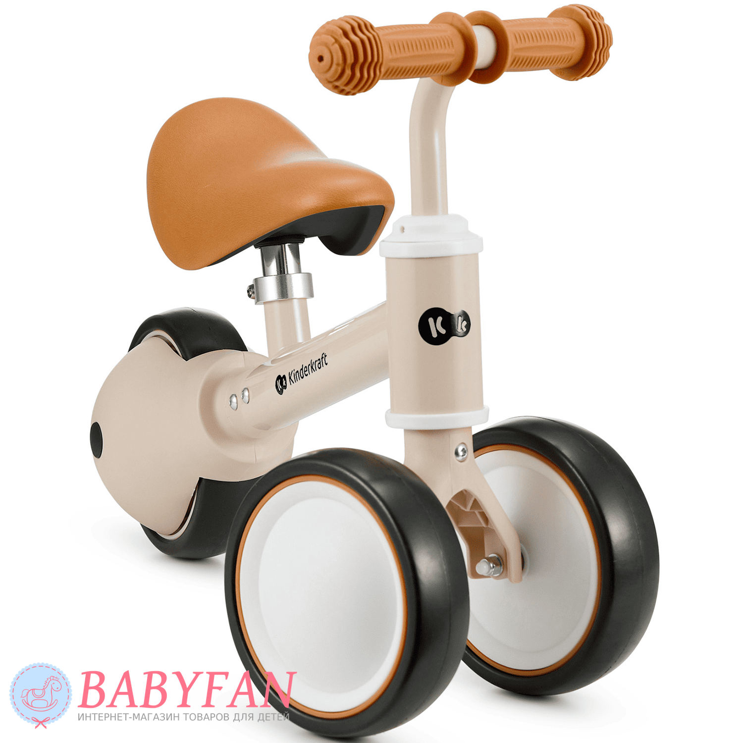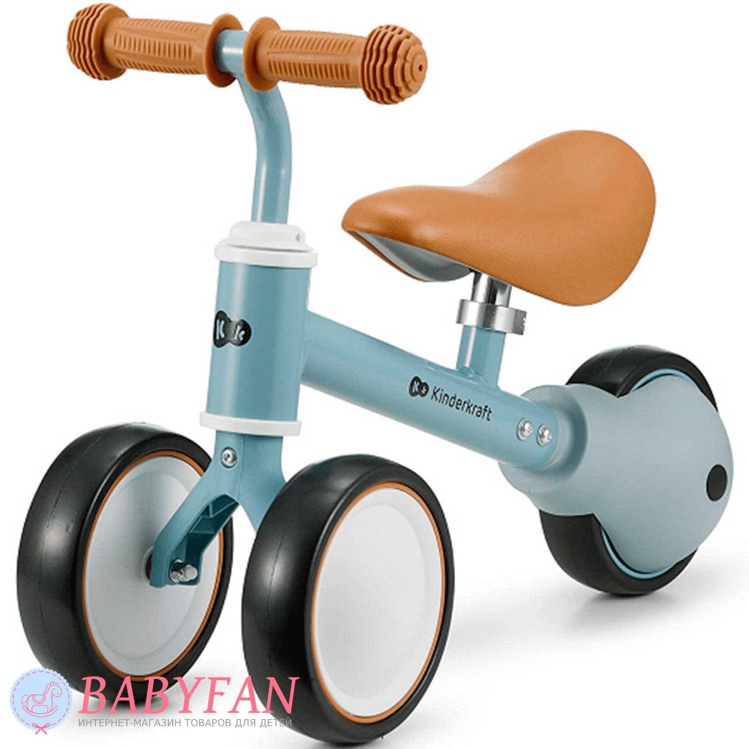 Kinderkraft Cutie – легкий та стійкий триколісний каталка-біговець для дітей віком від 1 року. Витримує вагу до 25 кг. Виготовлений із міцних та довговічних матеріалів: металева рама, м'яке сидіння та колеса з литими пластиковими дисками. Рама покрита зносостійкою порошковою фарбою. Двоколісна передня вісь забезпечує біговелові стійкість до перекидання – дитині не потрібно тримати рівновагу. Сидіння м'яке та зручне – ергономічної форми. Кермо оснащене ковзними грипсами з боковим захистом рук. Кермо керує двома передніми колесами. Біговел наводиться в рух відштовхуванням ногами.