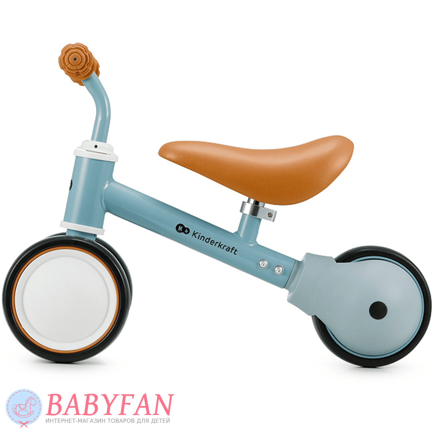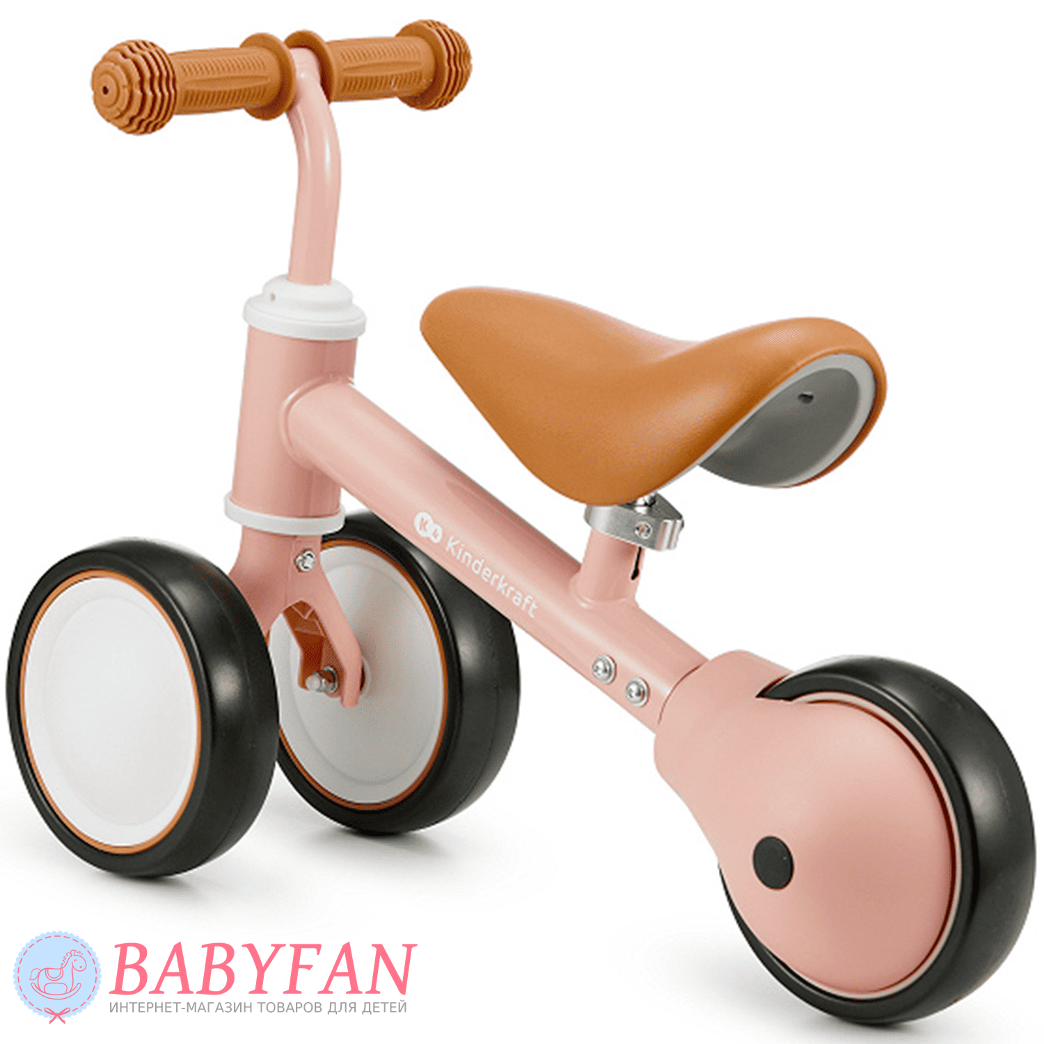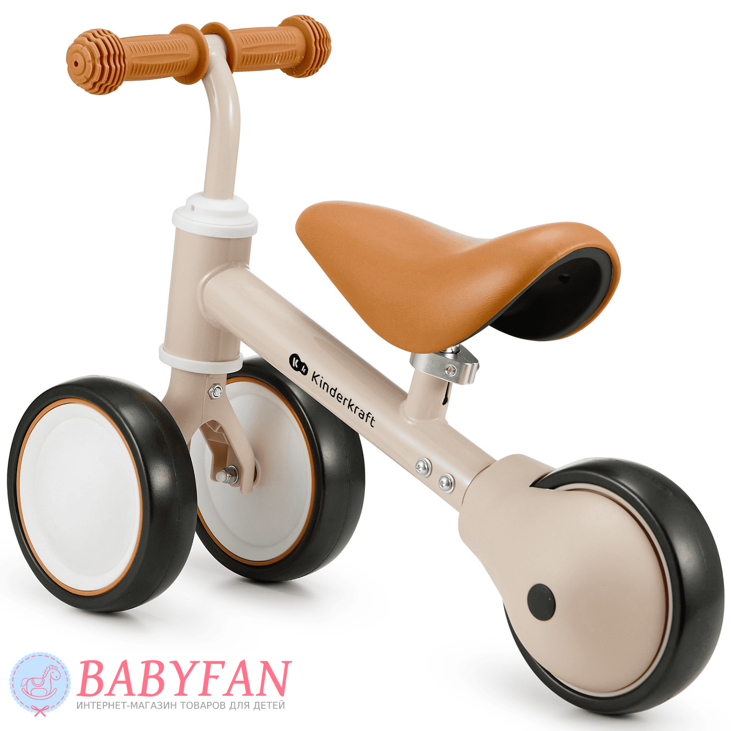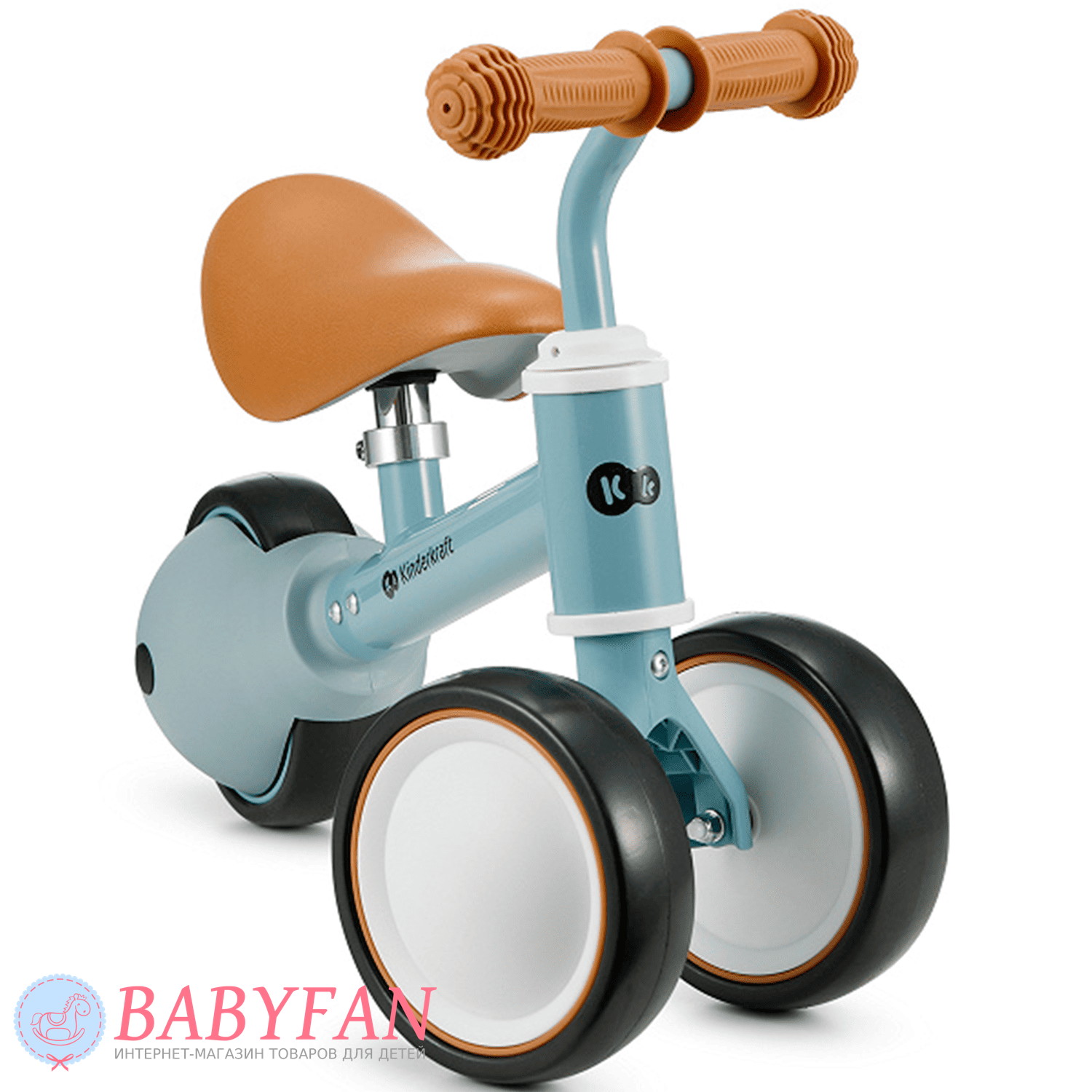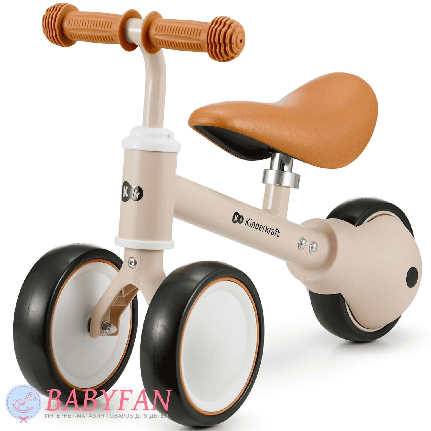 Kinderkraft Cutie – легкий та стійкий триколісний каталка-біговець для дітей віком від 1 року. Витримує вагу до 25 кг. Виготовлений із міцних та довговічних матеріалів: металева рама, м'яке сидіння та колеса з литими пластиковими дисками. Рама покрита зносостійкою порошковою фарбою. Двоколісна передня вісь забезпечує біговелові стійкість до перекидання – дитині не потрібно тримати рівновагу. Сидіння м'яке та зручне – ергономічної форми. Кермо оснащене ковзними грипсами з боковим захистом рук. Кермо керує двома передніми колесами. Біговел наводиться в рух відштовхуванням ногами.