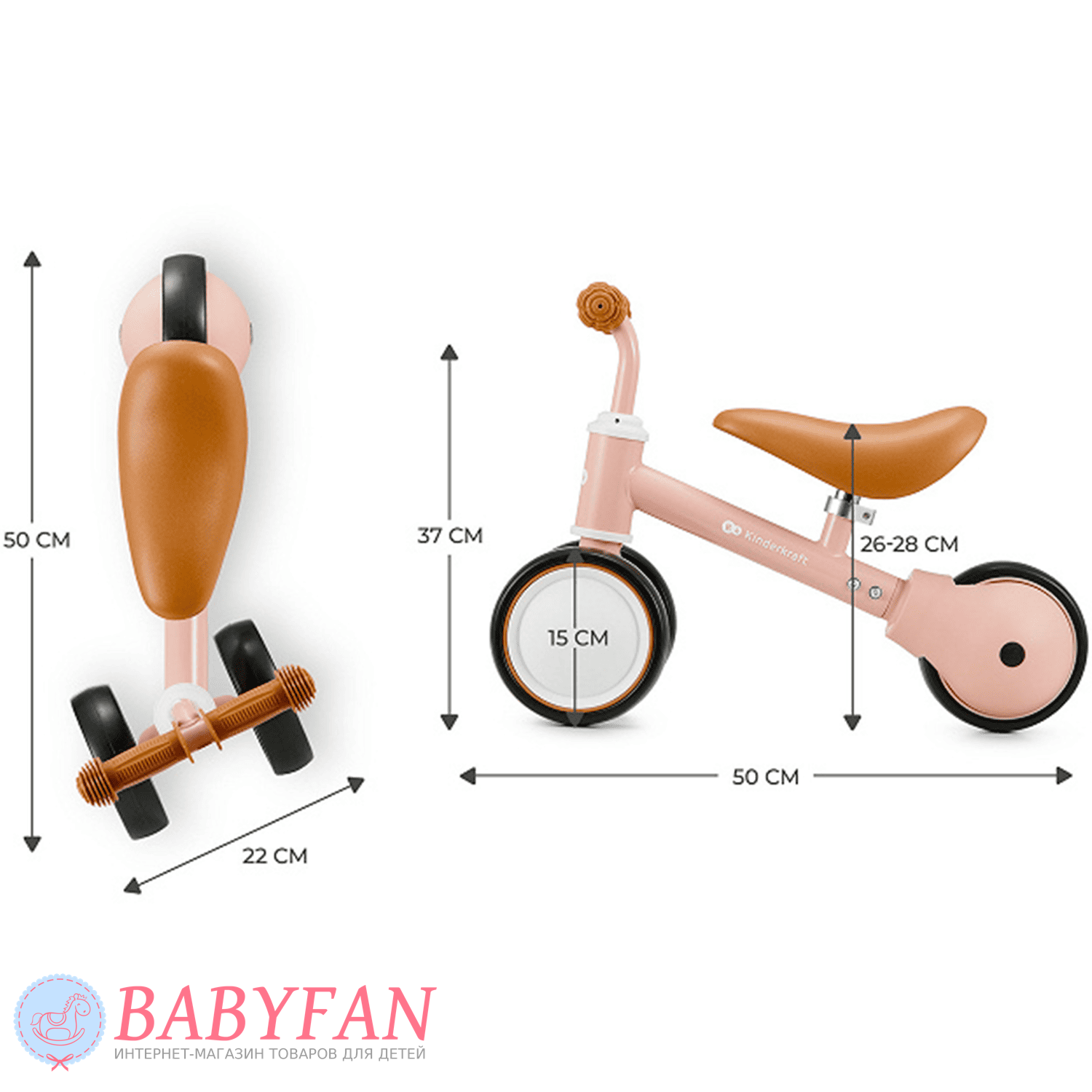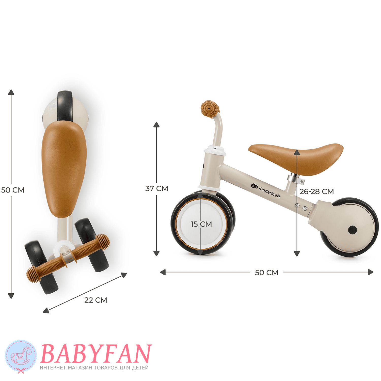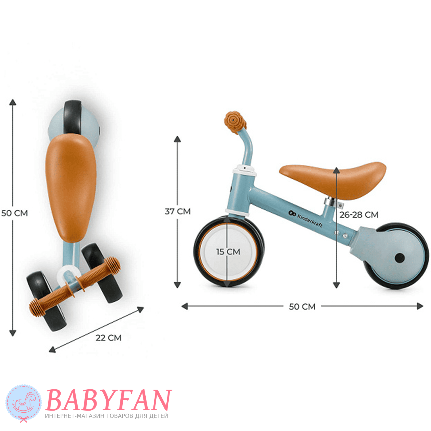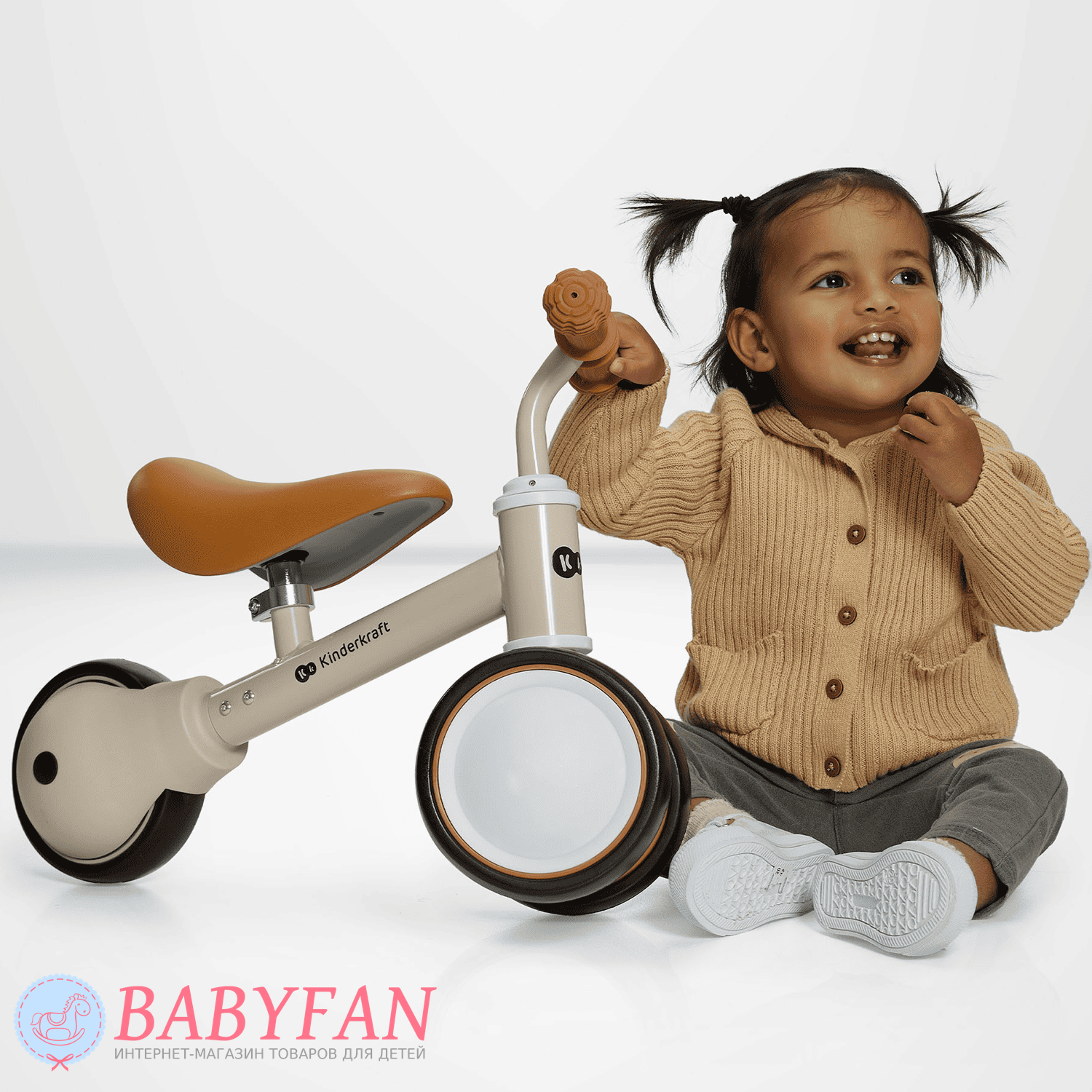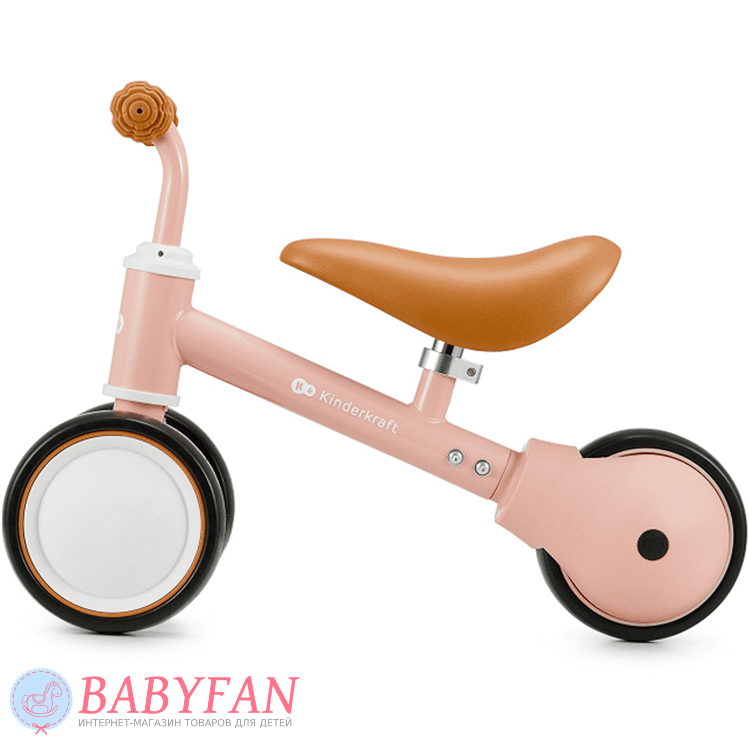 Kinderkraft Cutie – легкий та стійкий триколісний каталка-біговець для дітей віком від 1 року. Витримує вагу до 25 кг. Виготовлений із міцних та довговічних матеріалів: металева рама, м'яке сидіння та колеса з литими пластиковими дисками. Рама покрита зносостійкою порошковою фарбою. Двоколісна передня вісь забезпечує біговелові стійкість до перекидання – дитині не потрібно тримати рівновагу. Сидіння м'яке та зручне – ергономічної форми. Кермо оснащене ковзними грипсами з боковим захистом рук. Кермо керує двома передніми колесами. Біговел наводиться в рух відштовхуванням ногами.