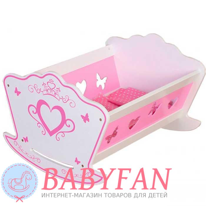 Колиска з постількою для ляльок до 47 см EcoToys TB051 – елегантна колиска для справжніх принцес. Лакована колиска в найніжніших біло-рожевих тонах прикрашена малюнками та вирізьбленими метеликами та сердечками. Комплектація іграшки складається з колиски, постільної білизни, подушки та м'якого матраца, оформлених у тон колиски.