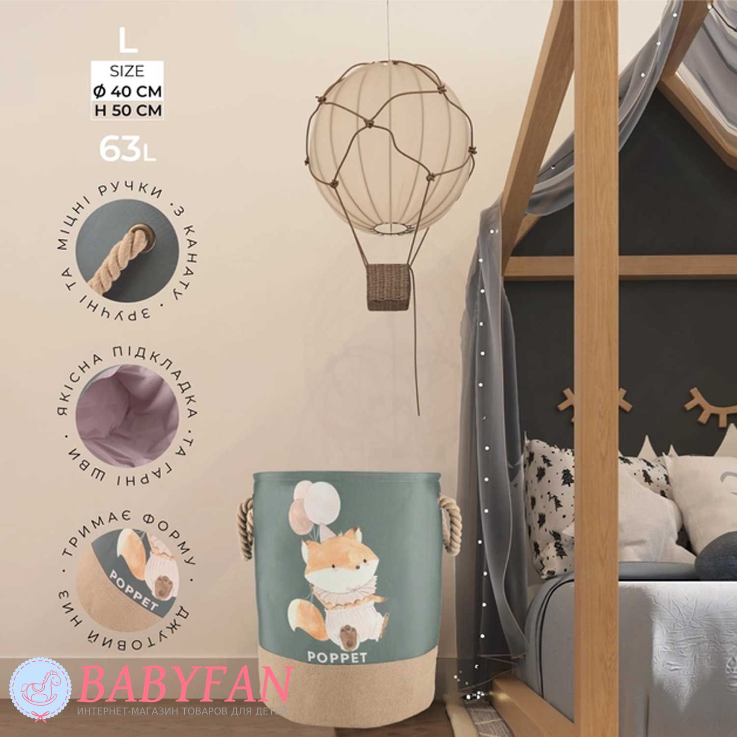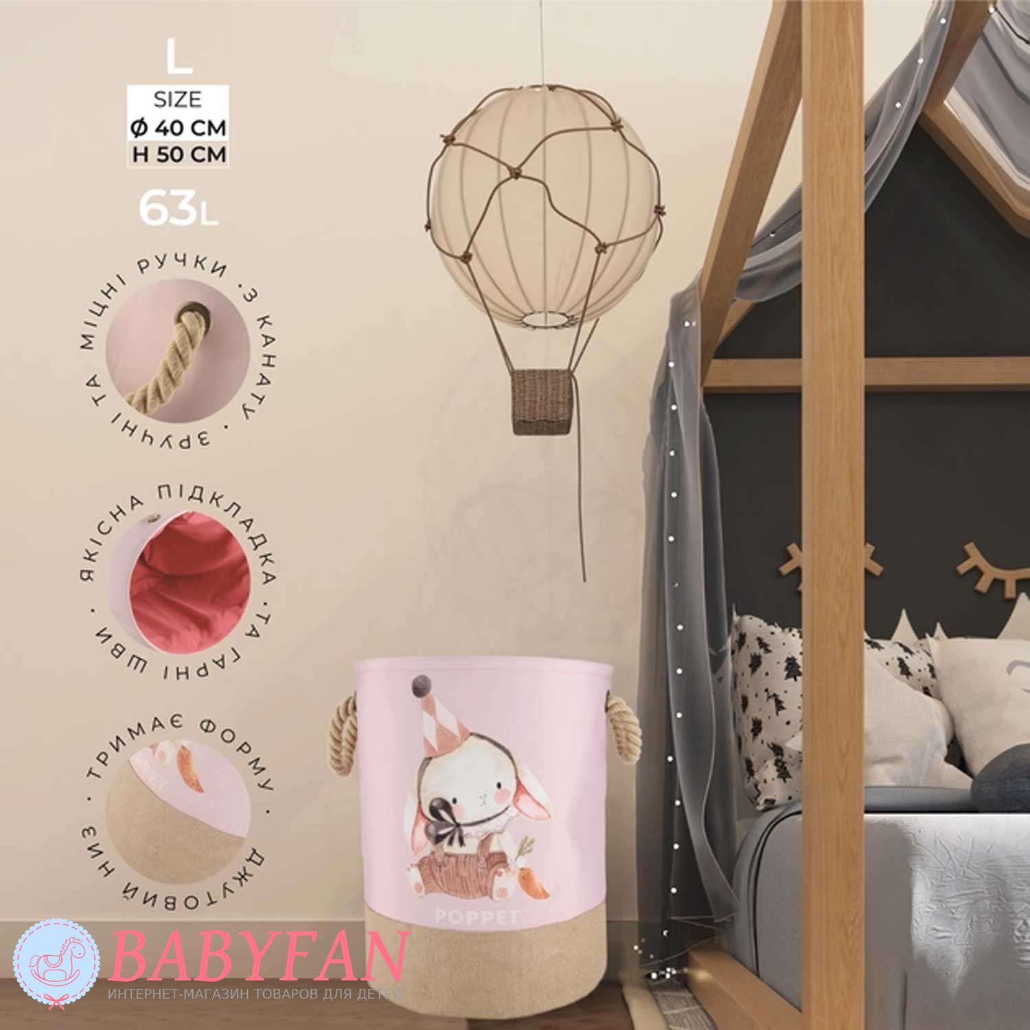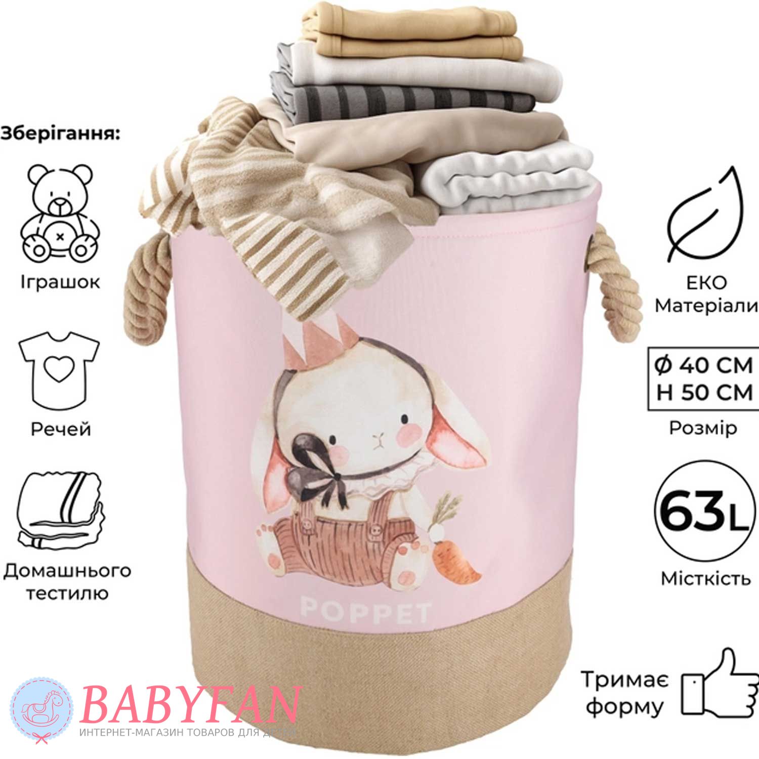 Кошик для іграшок Poppet – це стильний та практичний аксесуар – місце зберігання дитячих іграшок, одягу, постільних речей. Прикрасить дитячу кімнату та допоможе зберегти в ній порядок. Привчить дитину до порядку. Коризна містка – об'ємом 63 літри. Виконана у постільних тонах з акварельним малюнком – впишеться у будь-який інтер'єр. Виготовлена зі 100% екологічних та безпечних матеріалів: стінки – з бавовни, дно – з джуту, ручки – з каната, кільця ручок – з металу, внутрішня підкладка – з поліестеру. Витримує інтенсивне використання та довговічна. Запакована в поліетиленову плівку. За допомогою ручок кошик легко переносити навіть дитині.