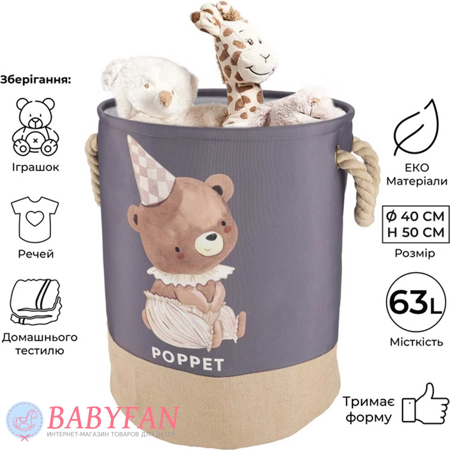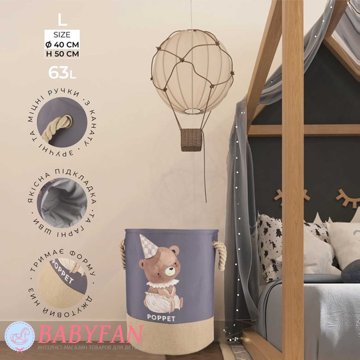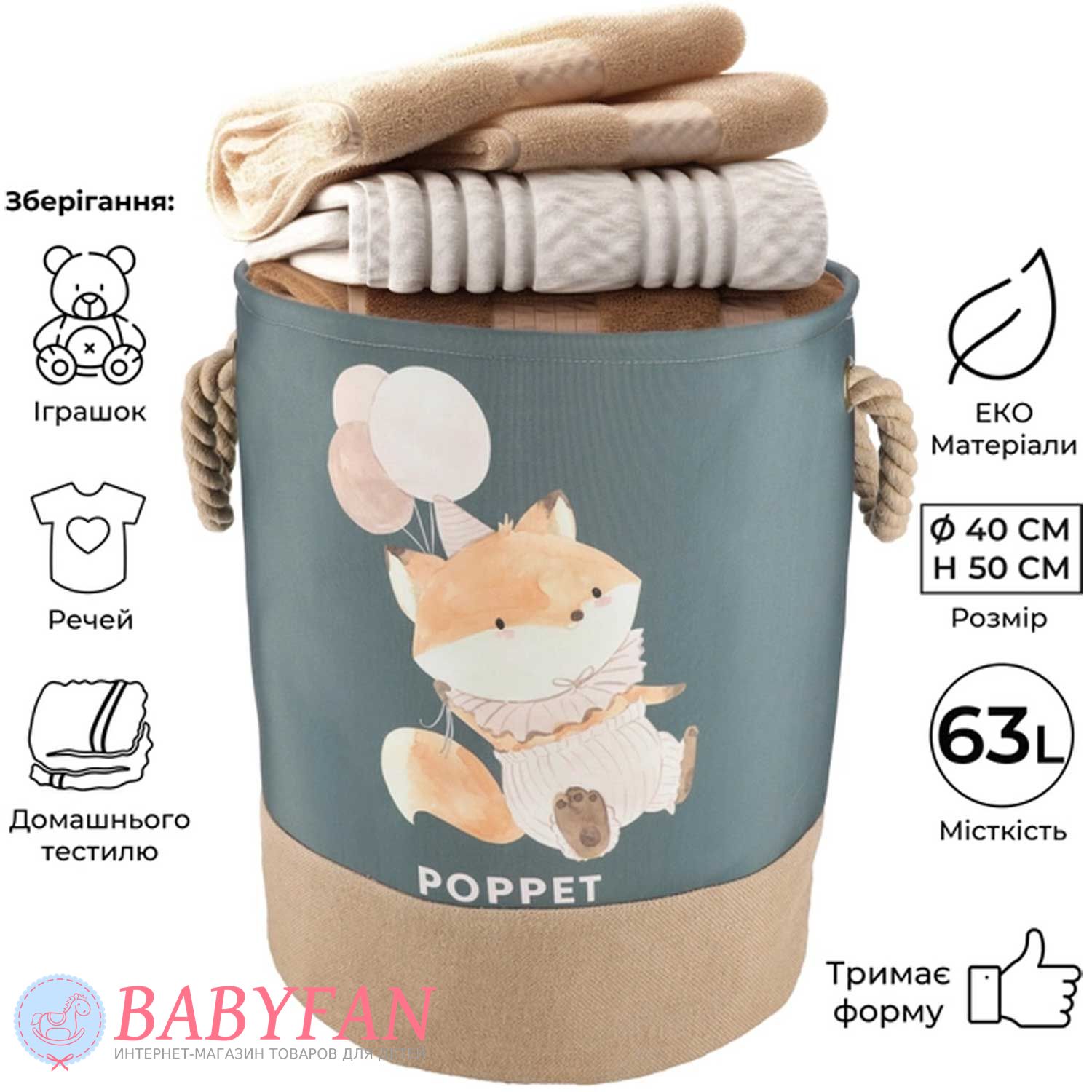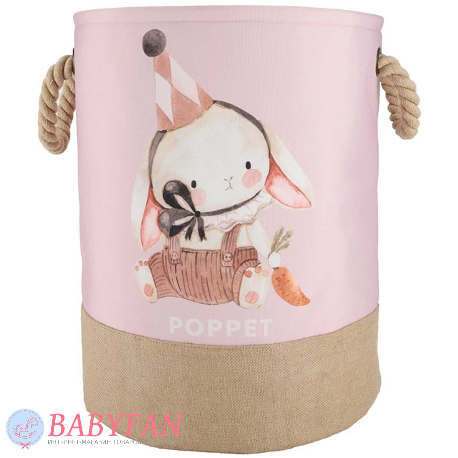 Кошик для іграшок Poppet – це стильний та практичний аксесуар – місце зберігання дитячих іграшок, одягу, постільних речей. Прикрасить дитячу кімнату та допоможе зберегти в ній порядок. Привчить дитину до порядку. Коризна містка – об'ємом 63 літри. Виконана у постільних тонах з акварельним малюнком – впишеться у будь-який інтер'єр. Виготовлена зі 100% екологічних та безпечних матеріалів: стінки – з бавовни, дно – з джуту, ручки – з каната, кільця ручок – з металу, внутрішня підкладка – з поліестеру. Витримує інтенсивне використання та довговічна. Запакована в поліетиленову плівку. За допомогою ручок кошик легко переносити навіть дитині.