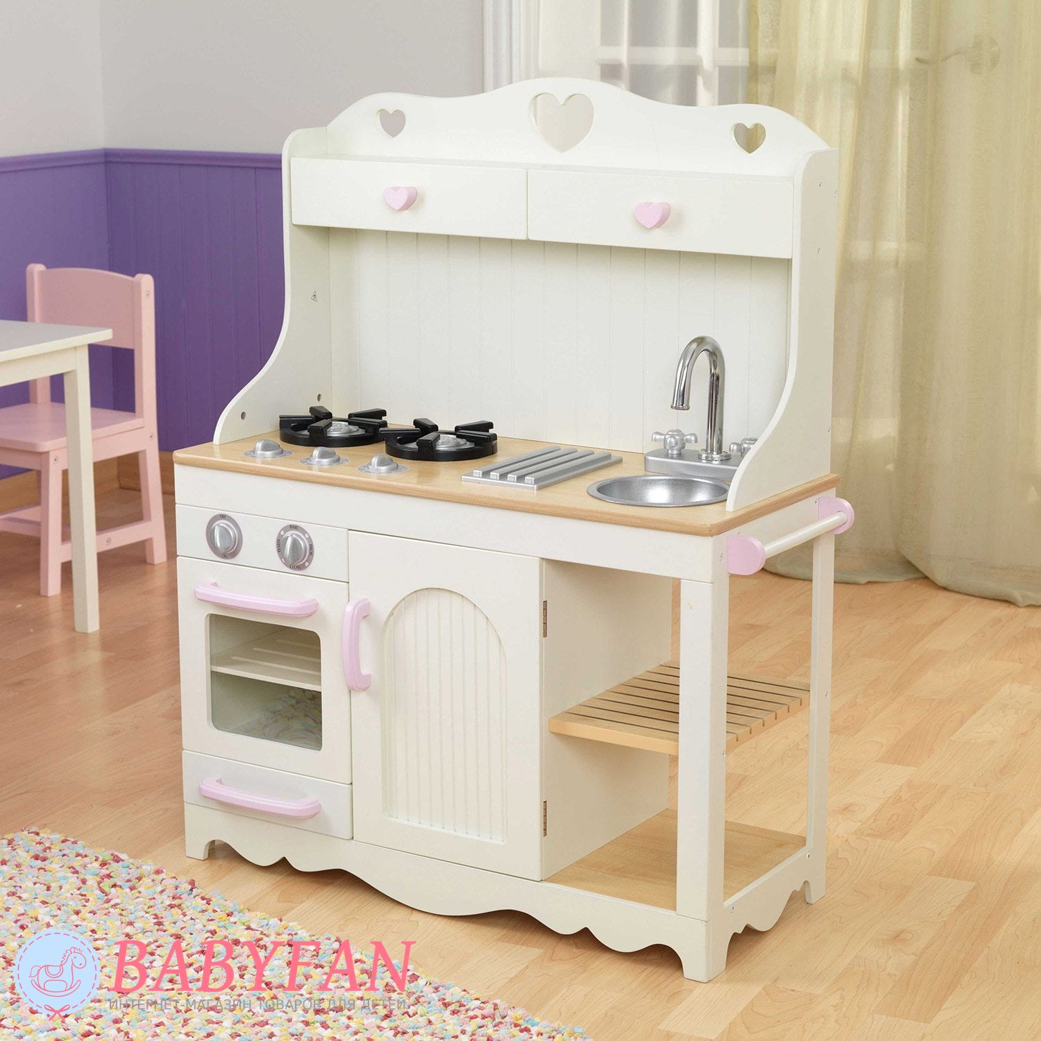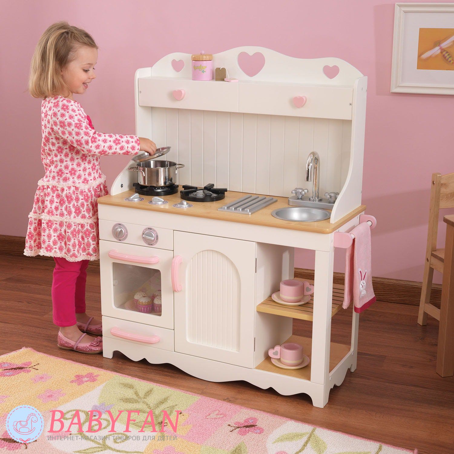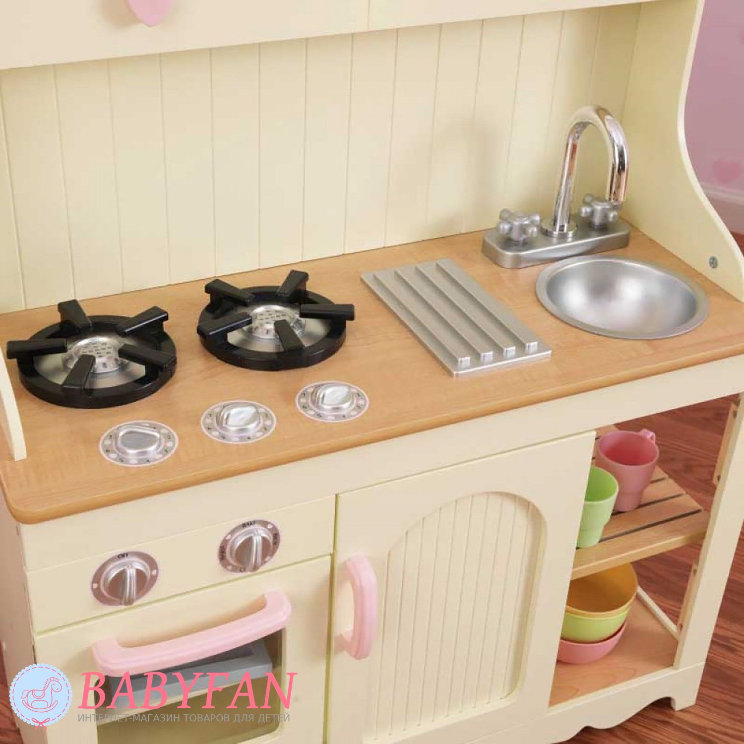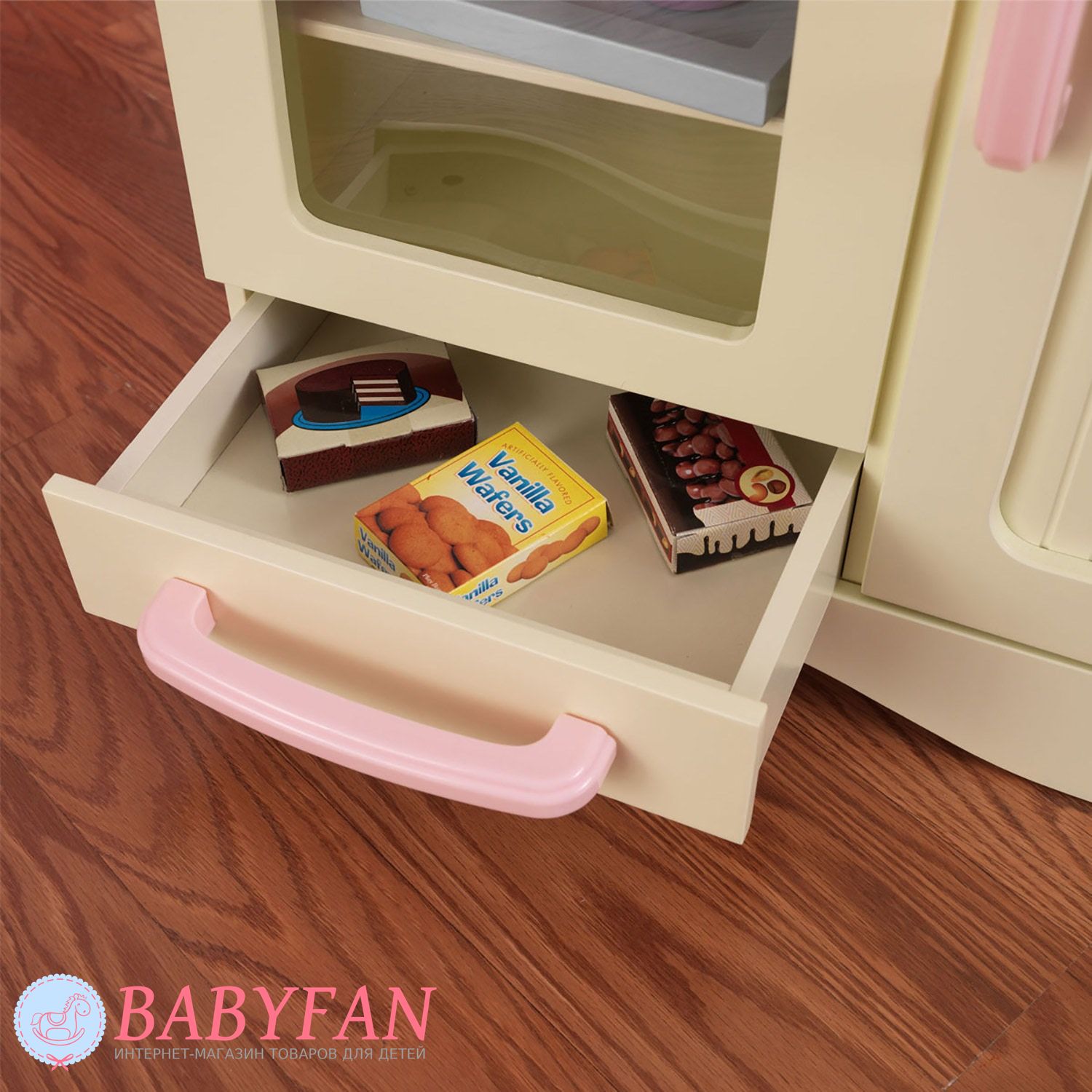 - виконана в ніжних тонах кухня оснащена практичною 2-конфорковою плитою, духовкою і шафками - у всіх елементів відкриваються і закриваються дверцята, а духовка і плита оснащені поворотними рукоятками. Завдяки прозорим дверцятам діти можуть спостерігати за процесом приготування страв у духовці;