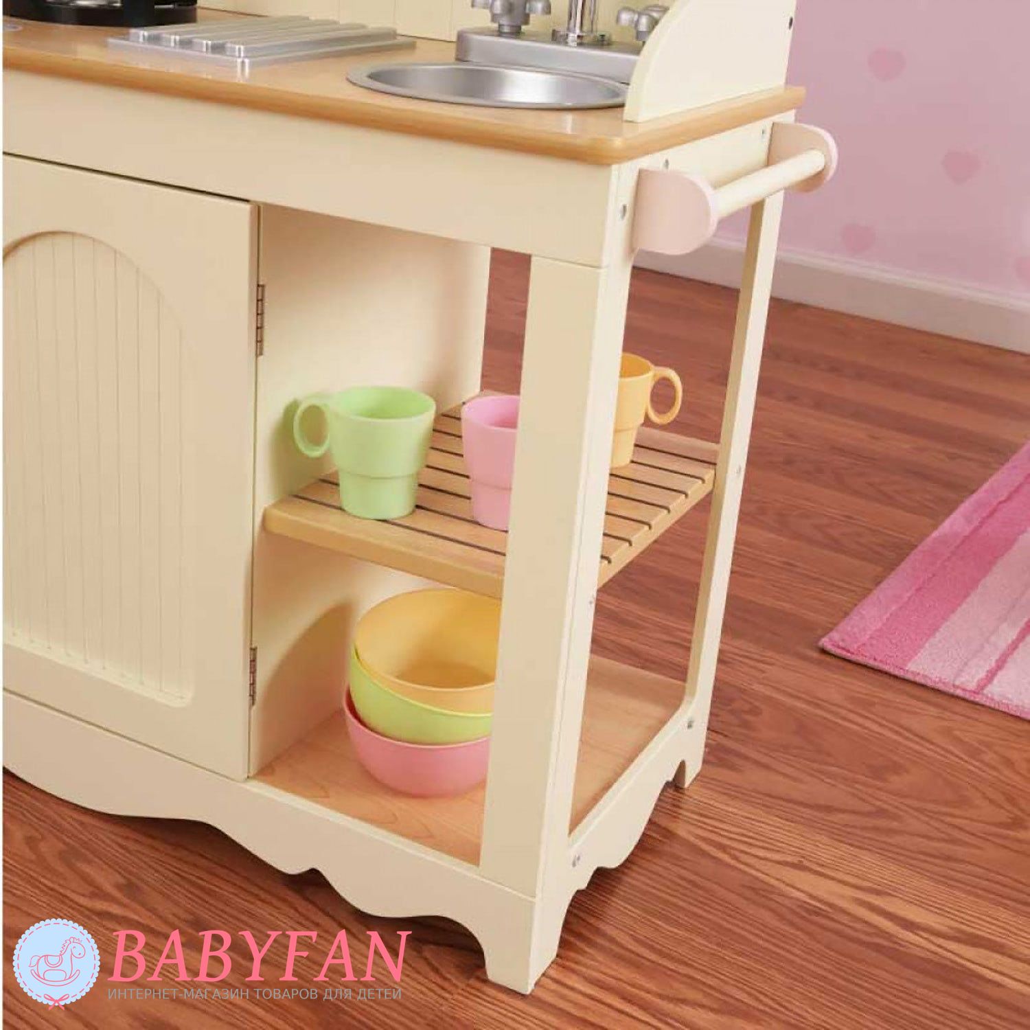 Кухня KidKraft 53151 Prairie – стильна дерев'яна кухня пастельних тонів ідеально підходить для дітей, які бажають пізнати світ кулінарії. Завдяки поворотним рукояткам кухонної техніки і дверцям техніки, що відкриваються/закриваються, і шафкам для зберігання гри стають більш реалістичними і дітям простіше уявляти себе справжніми кухарями.