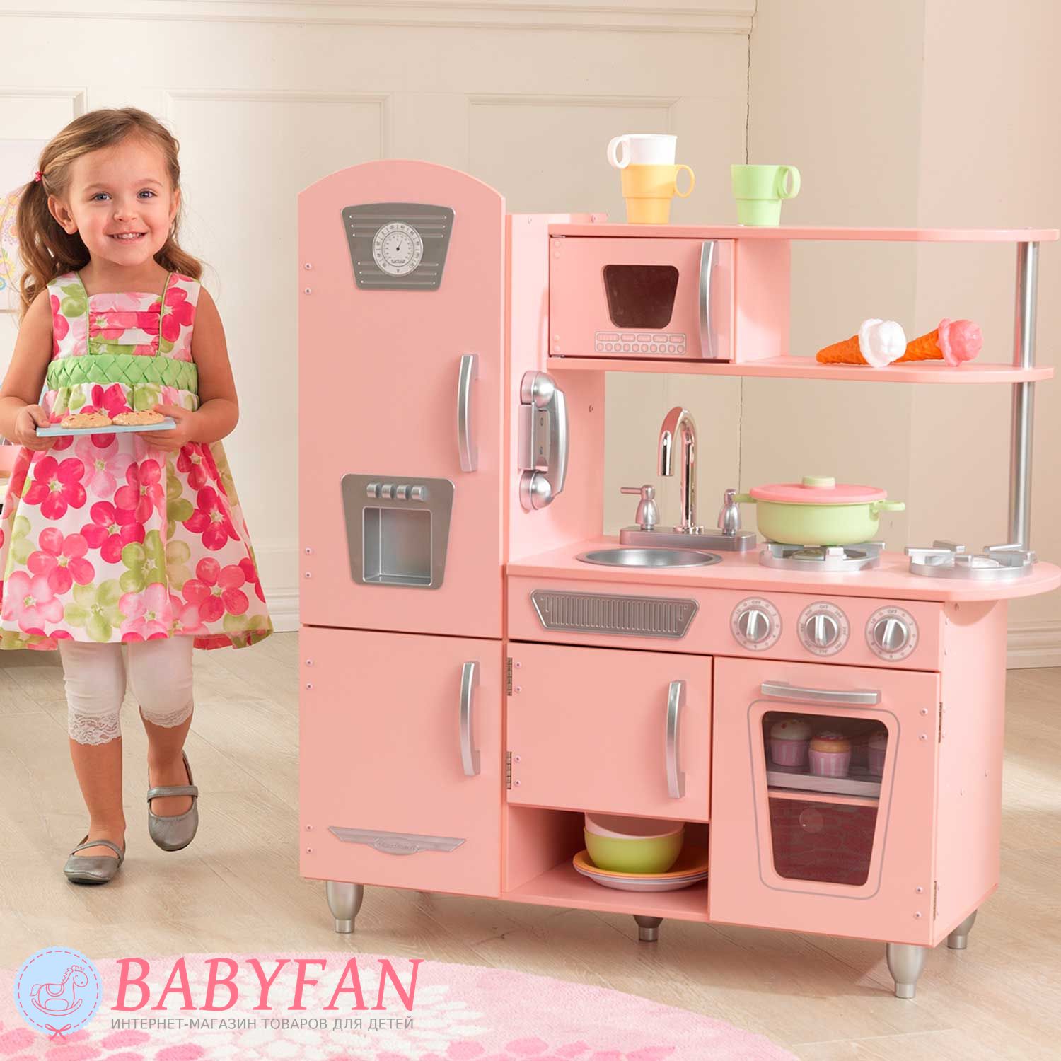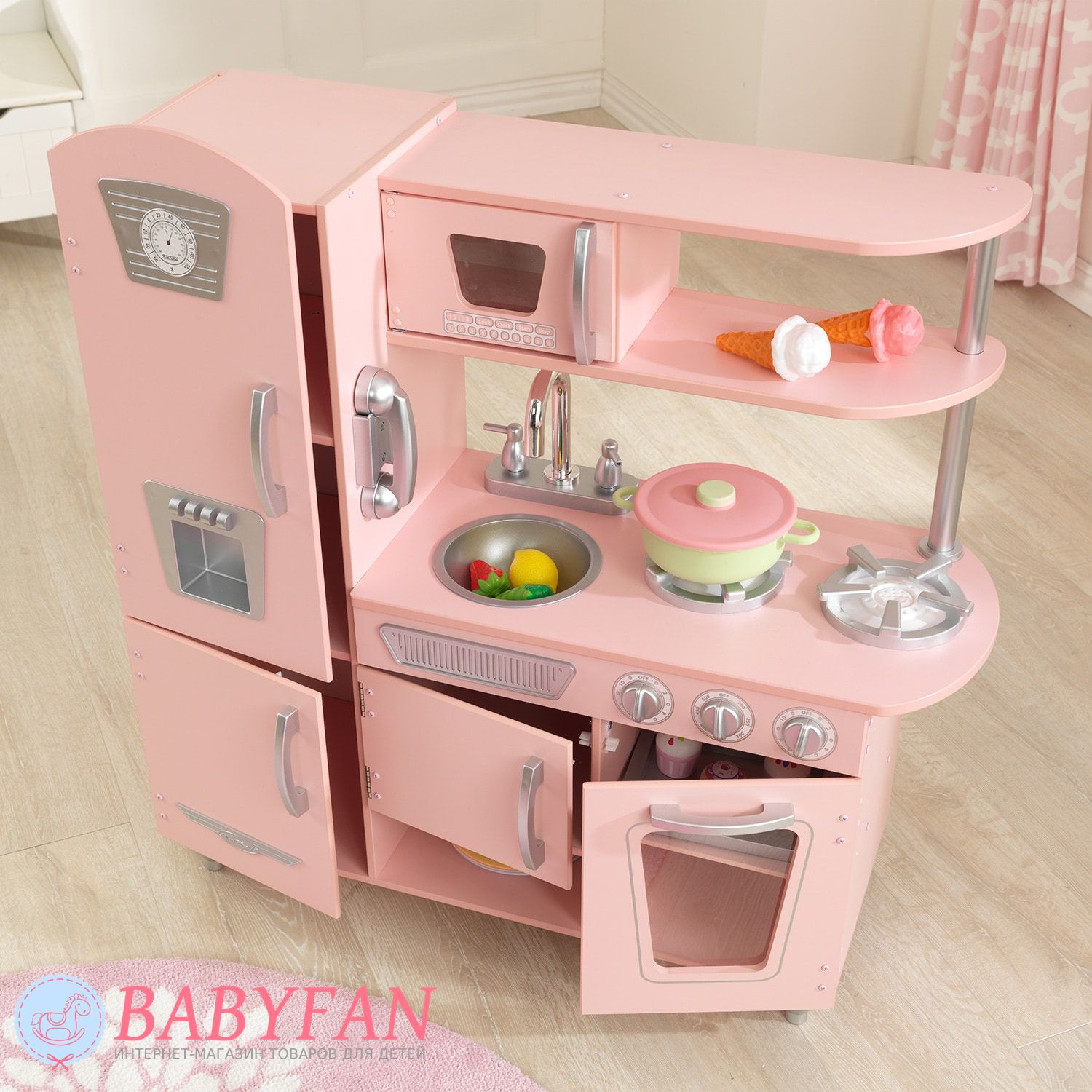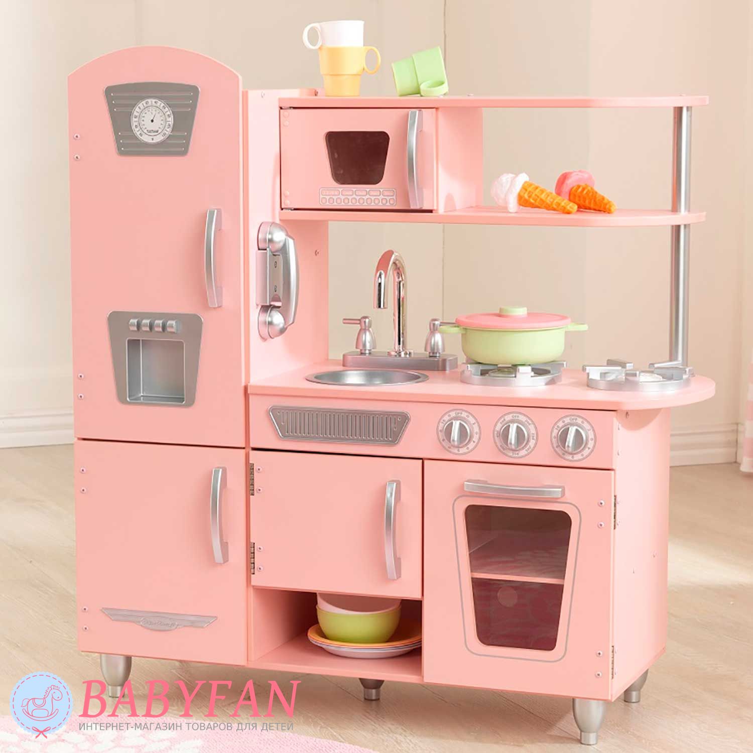 Кухня KidKraft 53179 Pink Vintage - інтерактивна кухня ніжно-рожевого відтінку, оснащена сучасною технікою. Завдяки такій іграшковій кухні діти можуть близько познайомитися з нюансами господарювання і привчатися до таких не дуже приємних обов'язкових процедур, як миття посуду, але в ігровій формі це робити буде цікаво. Габарити кухні дозволяють одночасно брати участь у грі декільком дітям, які розвиватимуть не лише кулінарні, а й комунікативні навички.