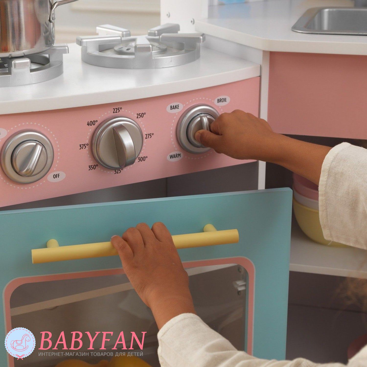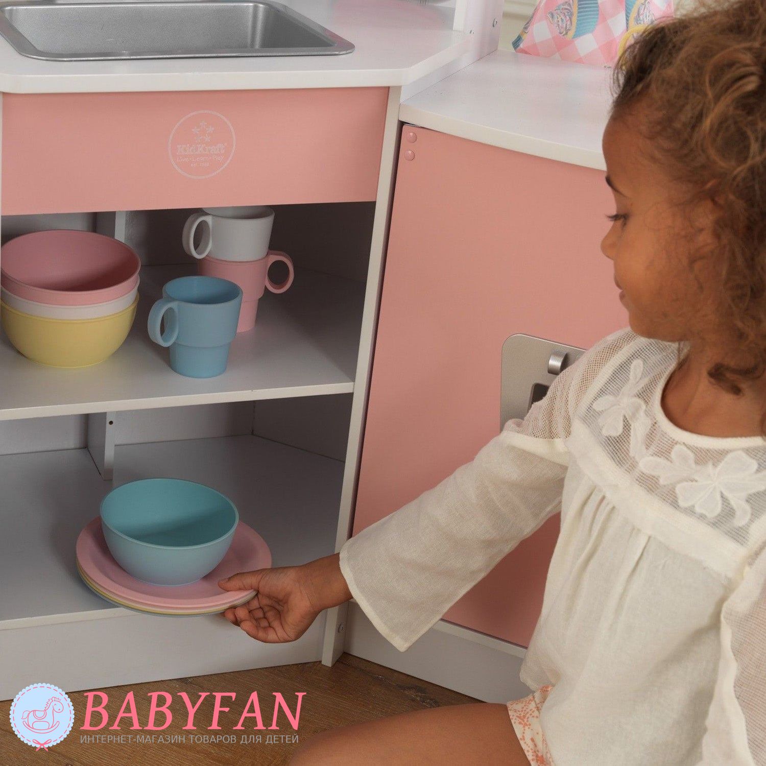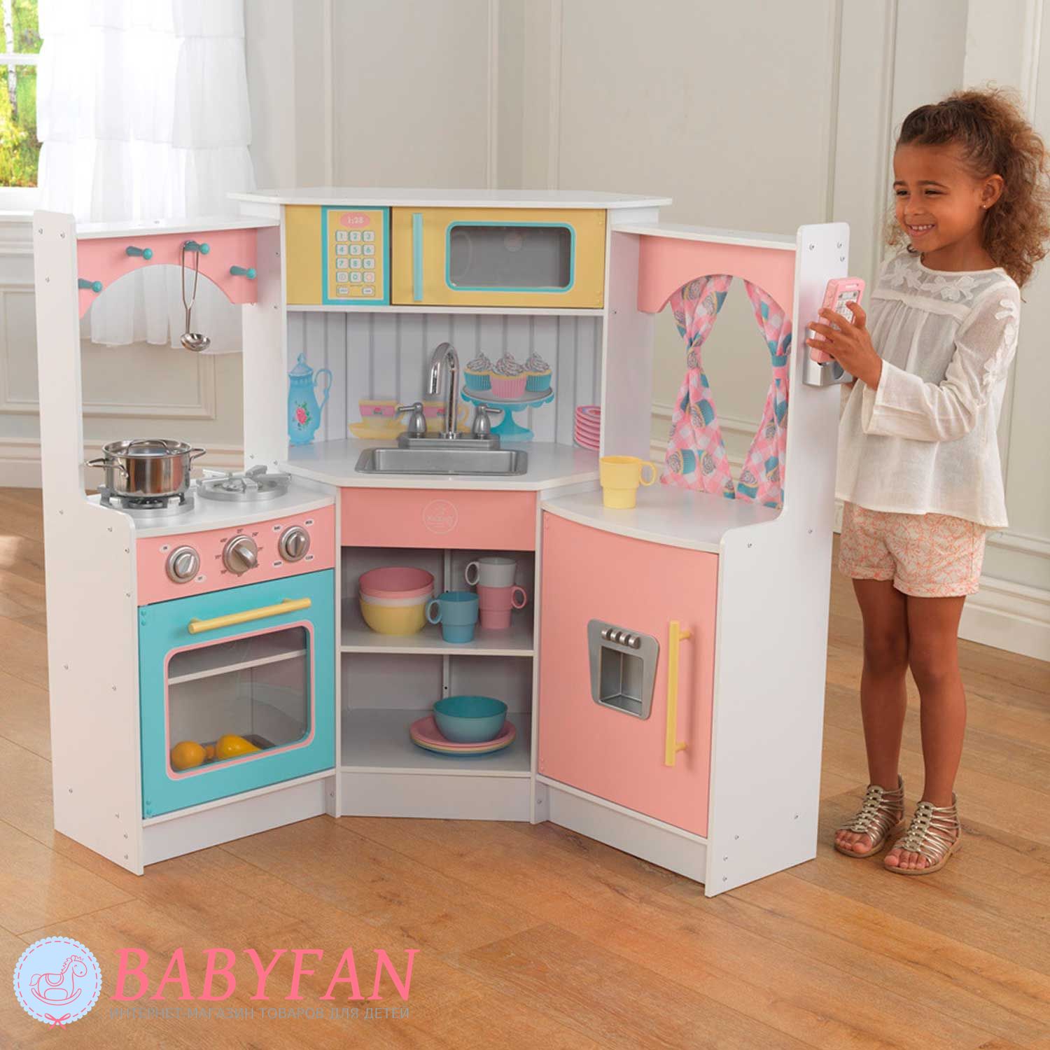 Кухня KidKraft 53368 Deluxe - компактна кутова іграшкова кухня з фіранками. Реалістичний кухонний гарнітур постільних тонів з працюючою вбудованою технікою та раковиною, всі кнопки та двері рухливі та дозволяють дітям відтворити процеси, що відбуваються на кухні під час приготування їжі. Відмінна можливість торкнутися реального світу кулінарії та в ігровій формі вчитися готувати страви.