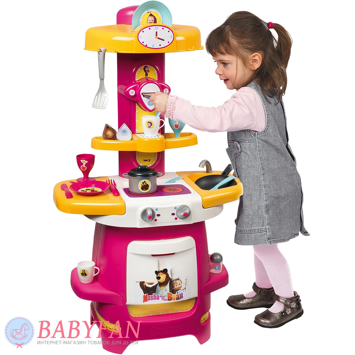 - оснащення кухні Smoby «Cooky»: імітація двох газових конфорок, мийки, кавоварки (компоненти для приготування гарячого шоколаду, чаю і кави з молоком додаються), також є духовка з дверцятами, що відкриваються, і різні полиці, гачки для посуду і продуктів;