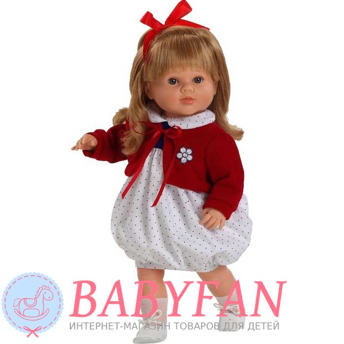 Лялька Carla 52 см озвучена, Munecas Berbesa 7214 – Блондинка з розпущеним волоссям сіро-блакитні очі обрамлені довгими віями (не закриваються). Одягнена – рейтузики, біле плаття в квіточку, червона м'яка курточка, на ніжках білі шкарпетки та шкіряні пінетки. Одяг весь знімається. У ляльки вінілові рухомі ручки, голова і м'яко-набивний тулуб, на ручках і ніжках є складочки, як у справжньої дитини.