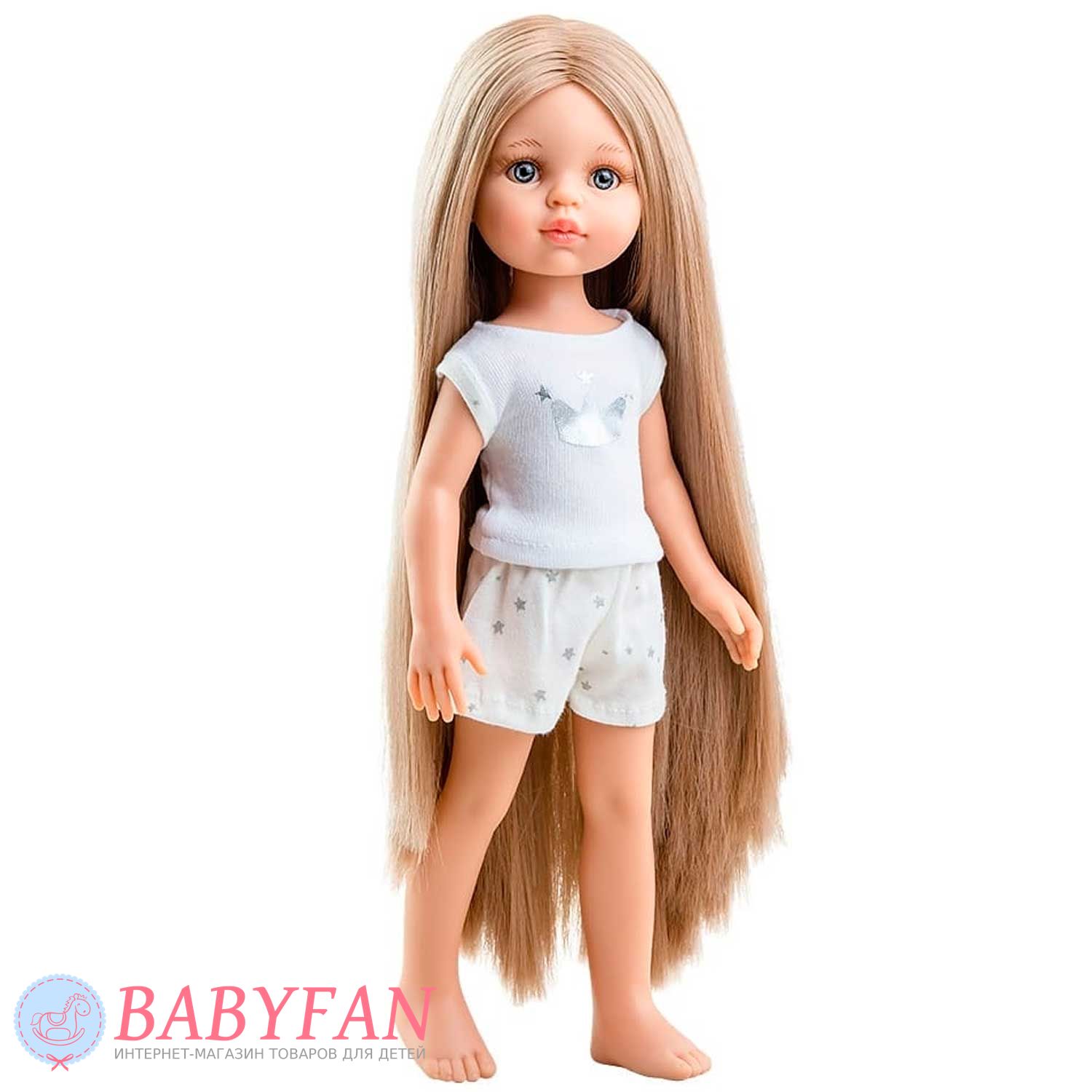 Іспанська лялька Paola Reina 13212 Карла з довгим до п'ят волоссям в піжамі висотою 32 см з рухомою головою, руками, ногами для дівчаток старше 3 років. Виготовлена з вінілу, пахне ваніллю. З нерухомими акриловими вічками та зіницями – очі не моргають. З довгим, до п'ят, густим прямим волоссям, прошитим по всій голові, з м'якого і приємного на дотик нейлону. Волосся можна мити і укладати у зачіски. Одяг легко знімається та одягається. Ляльку можна купати. Вії, щічки та губки ручної роботи.