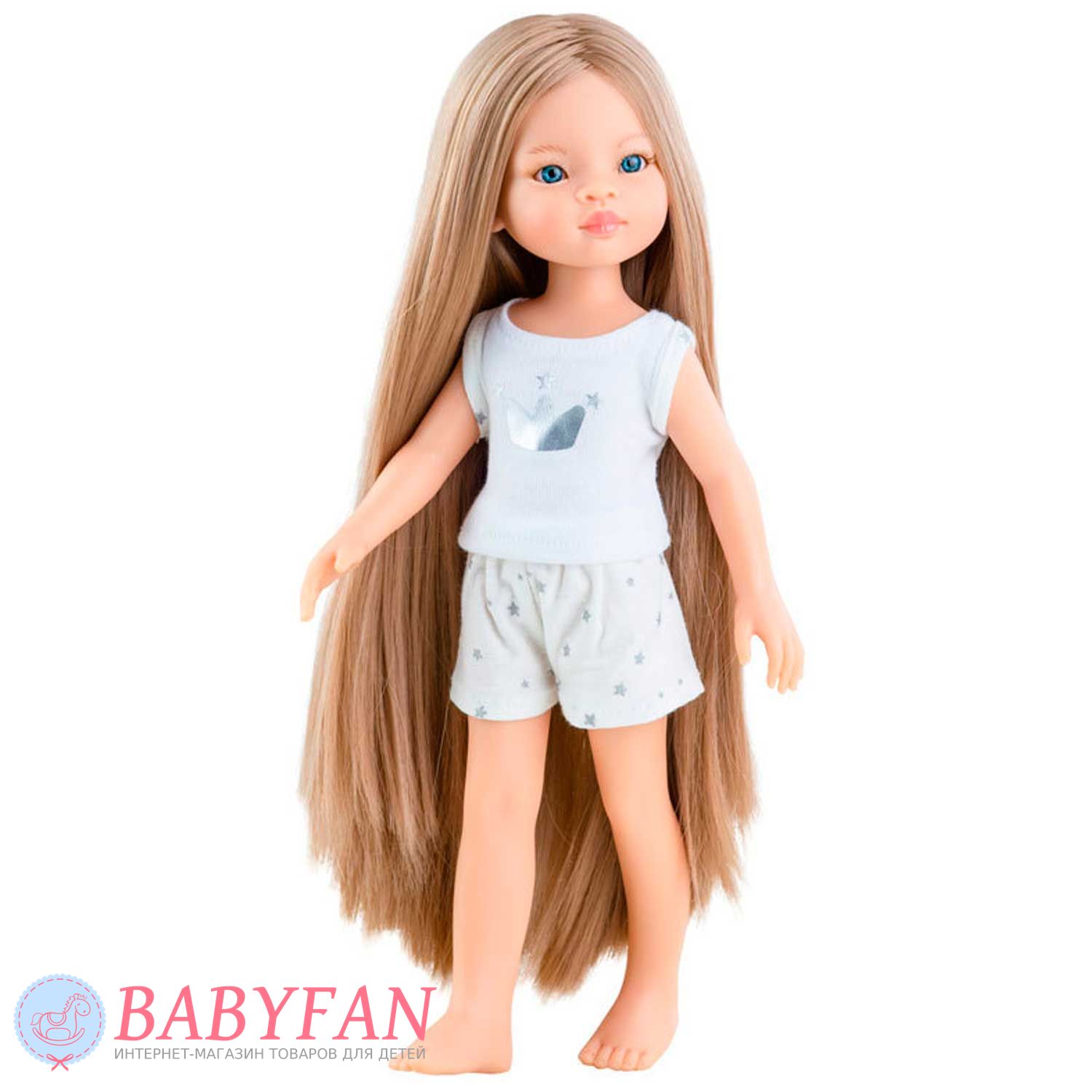 Іспанська лялька Paola Reina 13208 Маніка в піжамі заввишки 32 см з рухомою головою, руками, ногами для дівчаток старше 3 років. Виготовлена з вінілу, пахне ваніллю. З нерухомими акриловими вічками та зіницями – очі не моргають. З довгим, до п'ят, густим, прямим волоссям, прошитим по всій голові, з м'якого і приємного на дотик нейлону. Волосся можна мити і укладати у зачіски. Одяг легко знімається та одягається. Ляльку можна купати. Вії, щічки та губки ручної роботи.