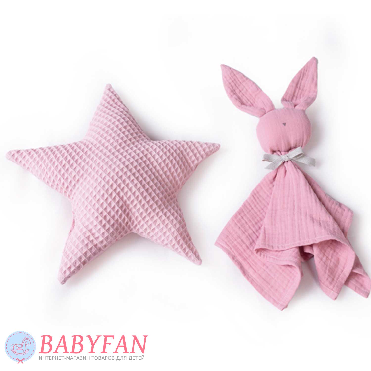 - додаткові аксесуари: костючик, шапочка, слюнявчик, маленькі пінетки, оформлені в однаковому стилі, подушечка у формі зірки та улюблений кролик Доу Доу.