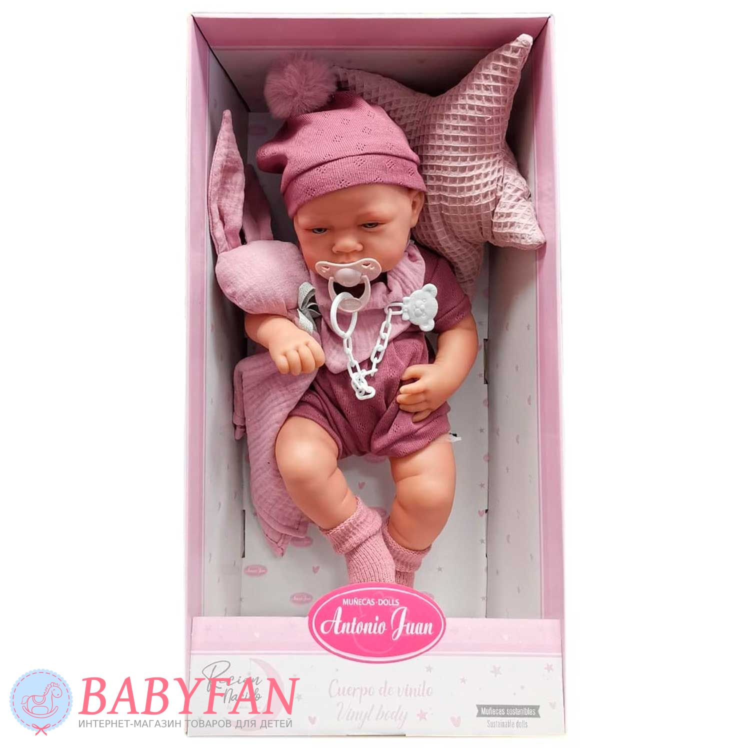 Лялька немовля Antonio Juan 50269 з кроликом Доу Доу 42 см – реалістичний ігровий набір з іграшкою та подушкою. М'яке вінілове тільце пупса, що імітує новонародженого, рухливі частини тіла, додаткові аксесуари урізноманітнюють сюжетно-рольові ігри дівчаток. Це не просто симпатичний пупс, це маленька донька дівчинки, яку він охоче оточуватиме турботою, отримуючи перші навички догляду за дитиною.