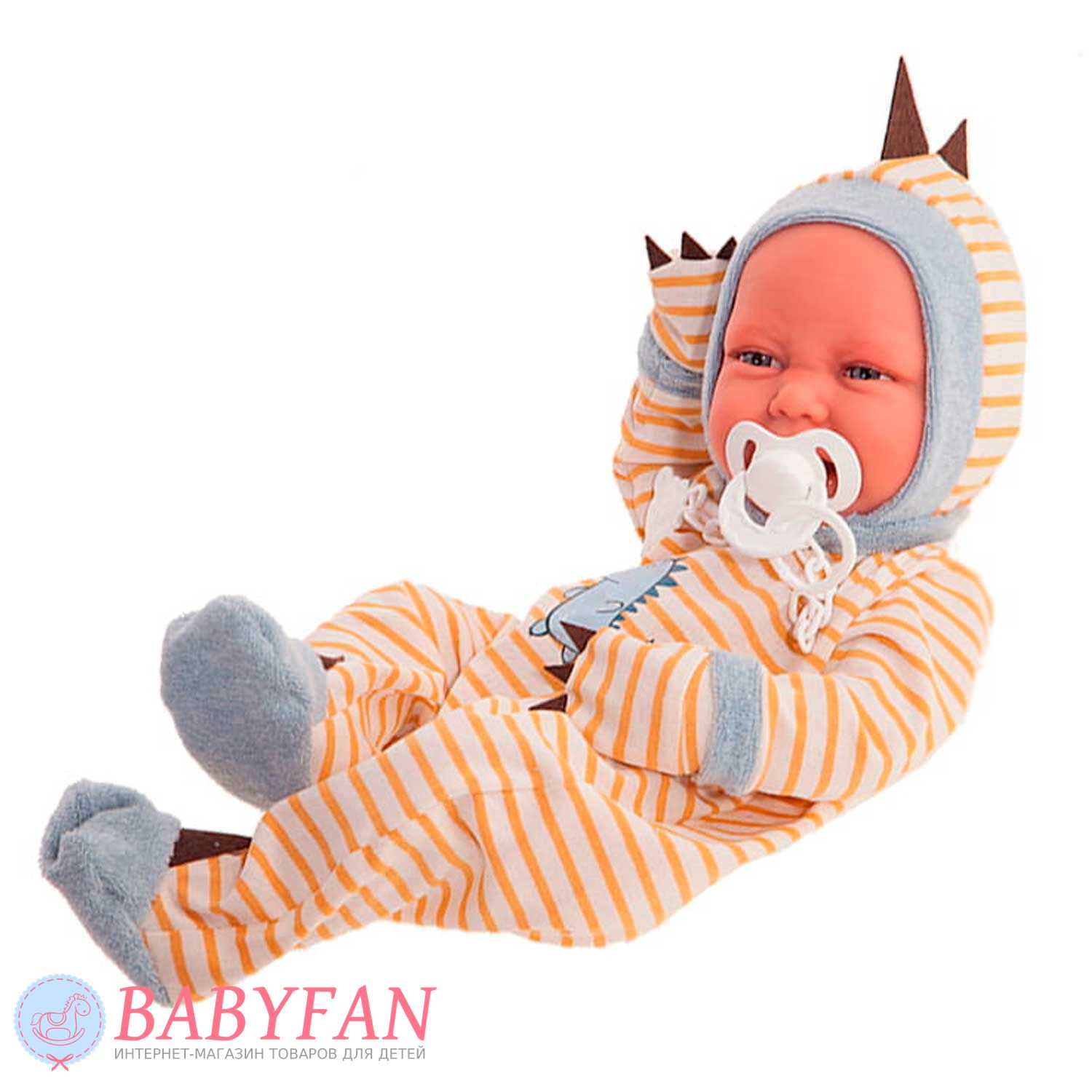 Лялька-немовля Carlo Dinosaurio 42 см, Antonio Juan 50158 - личко маленького пупсика дуже виразне і миловидне. Лялька так схожа на справжнє немовля, що, не знаючи, можна переплутати. Carlo обов'язково сподобається дівчаткам, і вони захочуть отримати таку ляльку в подарунок, а потім з гордістю показуватимуть іграшку своїм подружкам та розповідатимуть про її переваги.