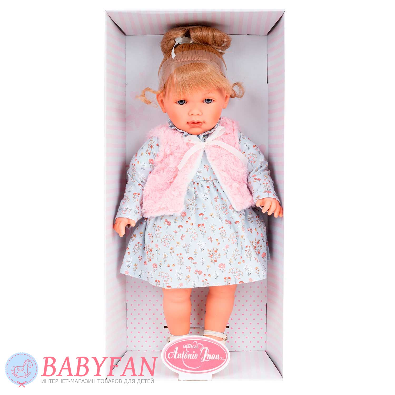 Лялька Мерседес у рожевому 55 см, Antonio Juan 1831 – миловидна сіроока дівчинка. Світле попелясте волосся прибрано в пишний високий хвіст. Дитина одягнена в модне квітчасте плаття, рожеву трикотажну кофтинку і болеро, на ніжках - світлі туфельки. Образи дітей Мунекас розроблені відомими європейськими дизайнерами. У ляльки вінілові рухомі ручки, ніжки, голова, і м'яко-набивний тулуб. Запакована в гарну подарункову коробку.